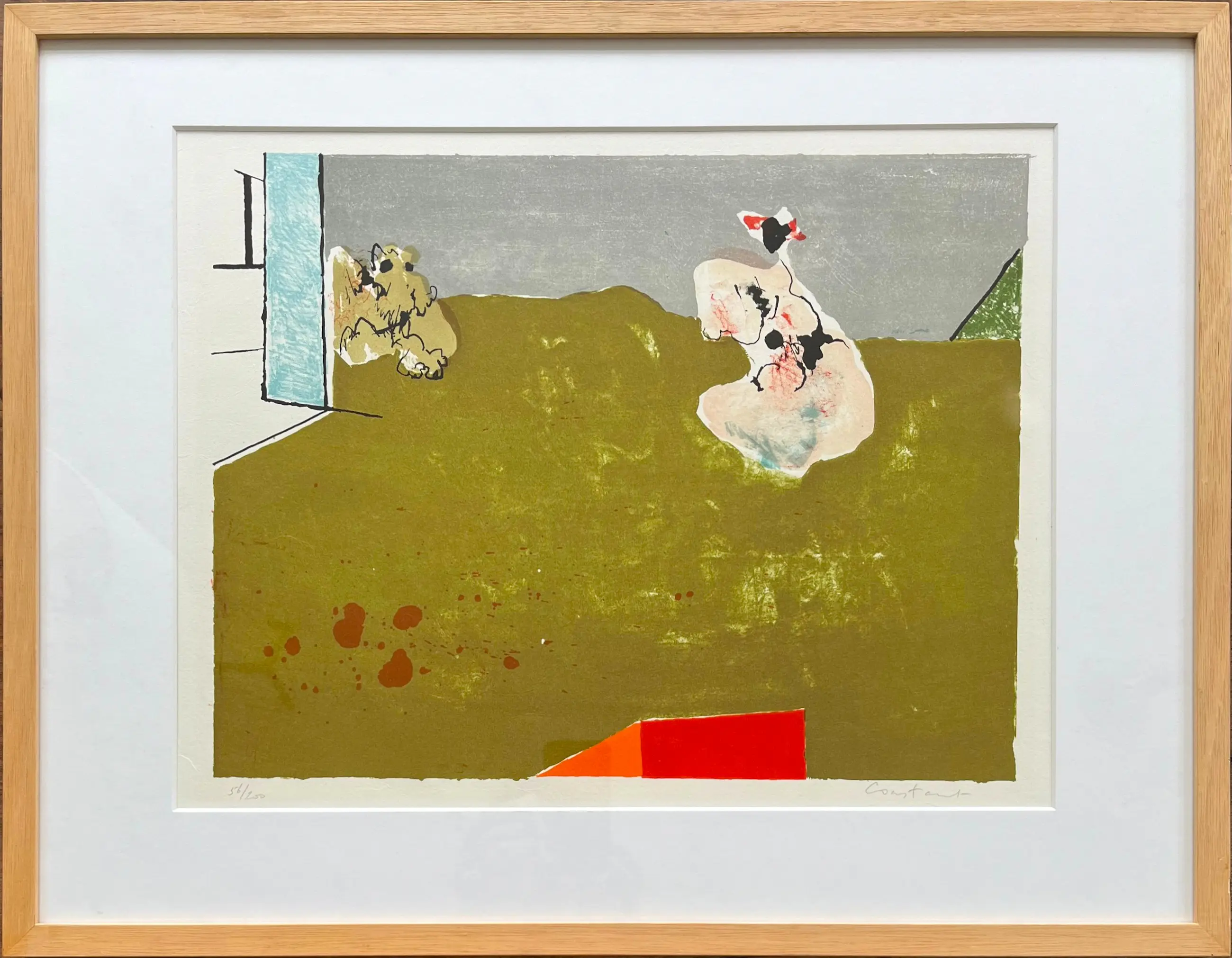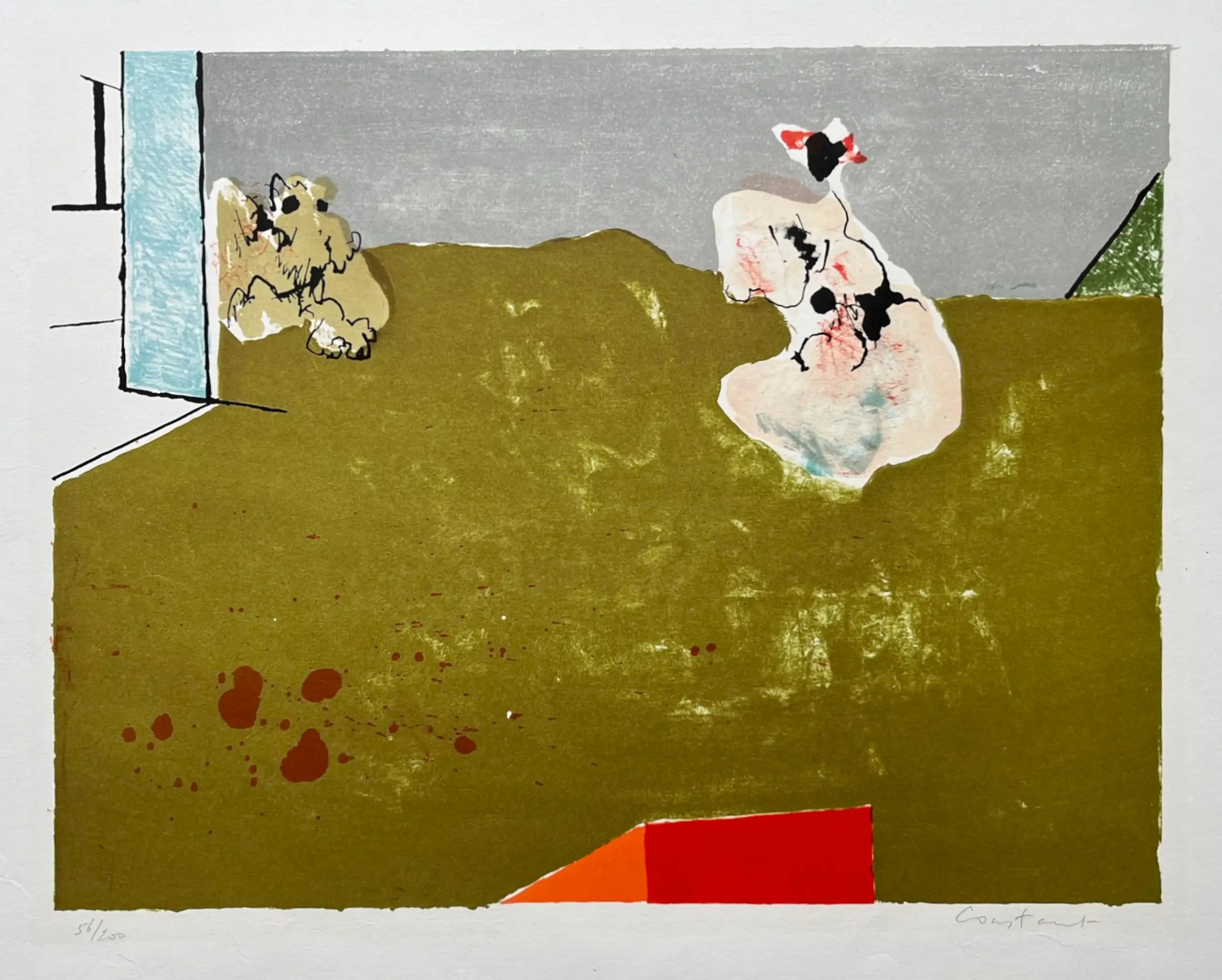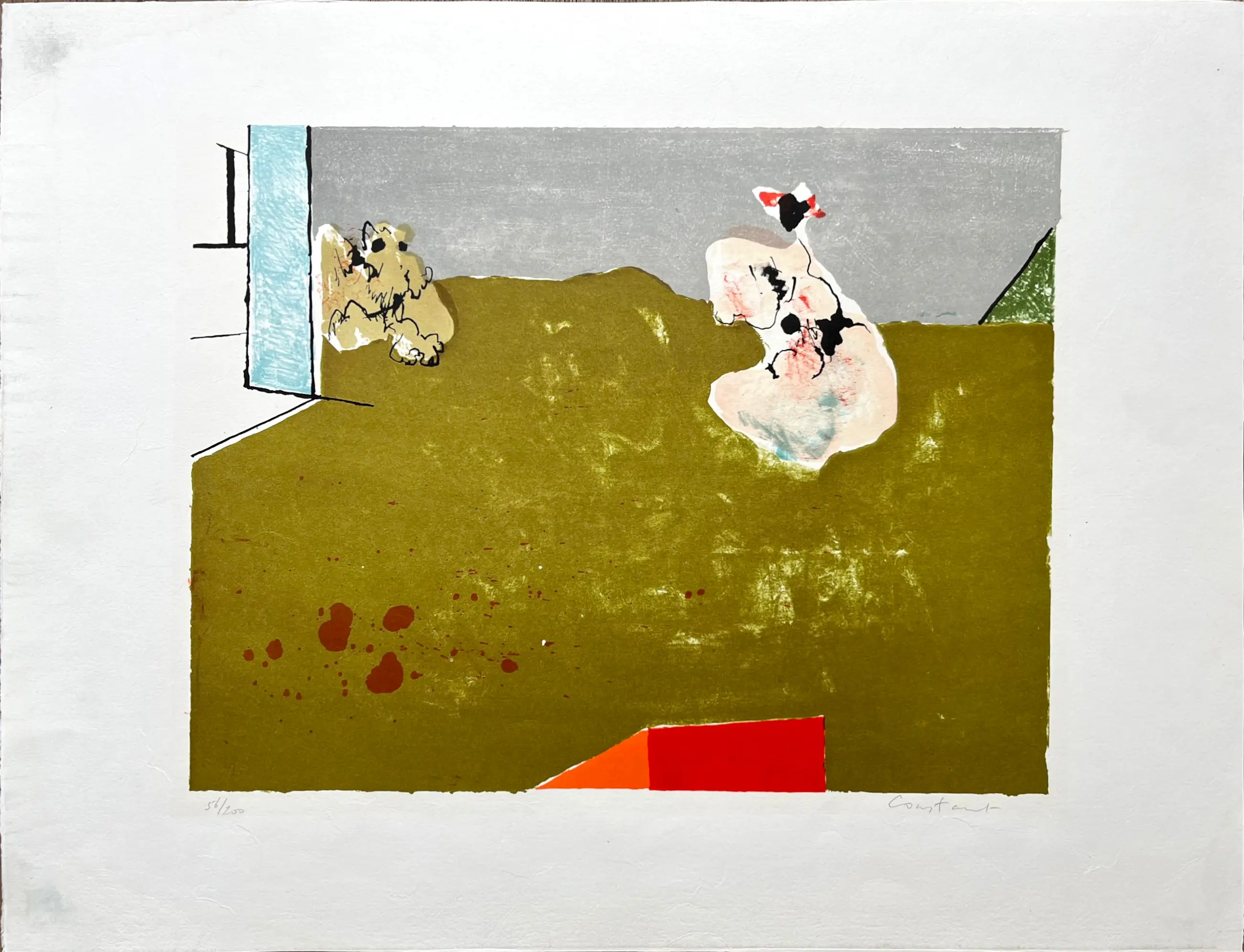 Constant creëerde deze litho in 1965. De litho toont een vrouw en hond, expressief vormgegeven, in een interieur met strakke, perspectivische lijnen, typisch voor Constant.