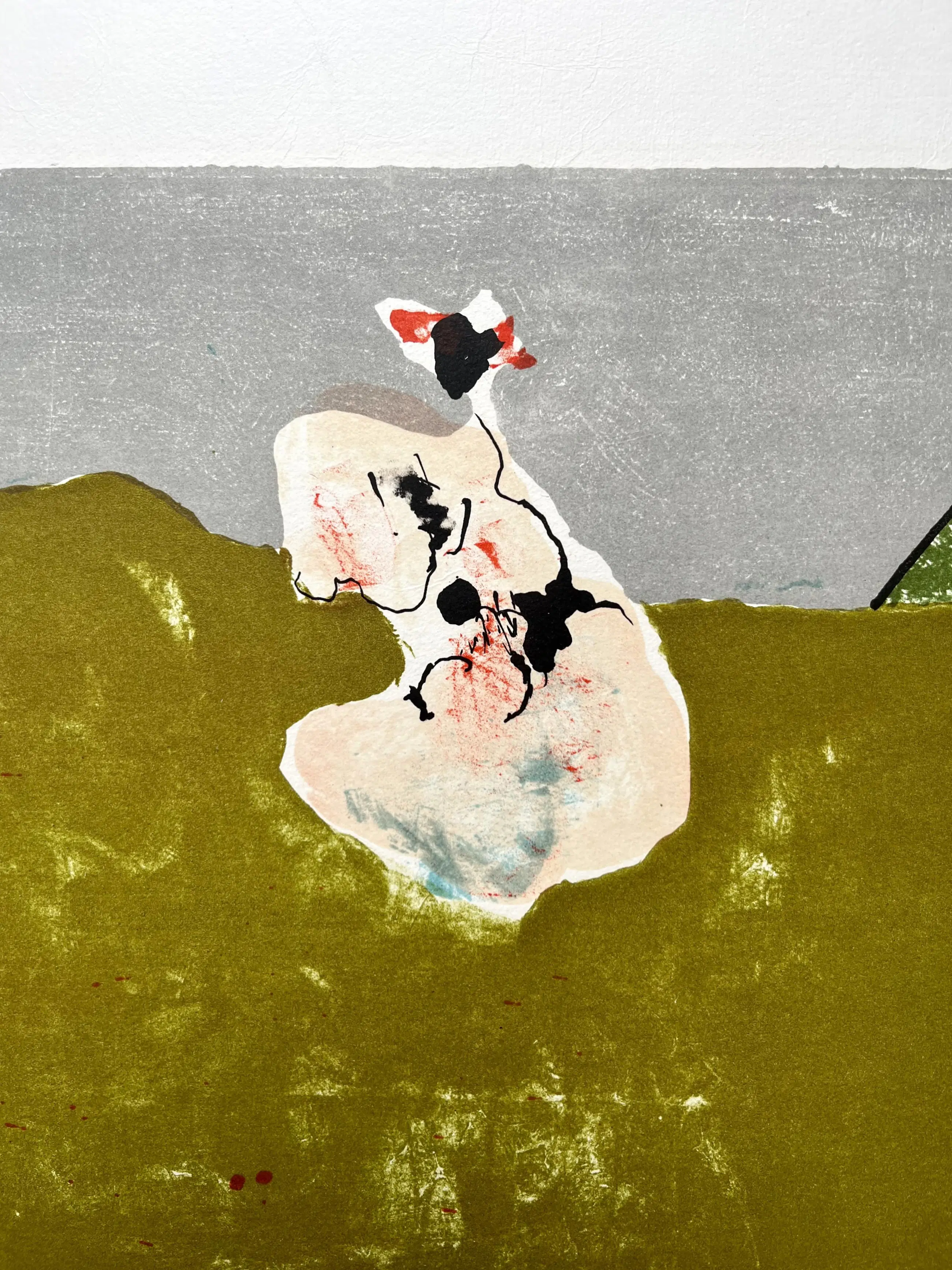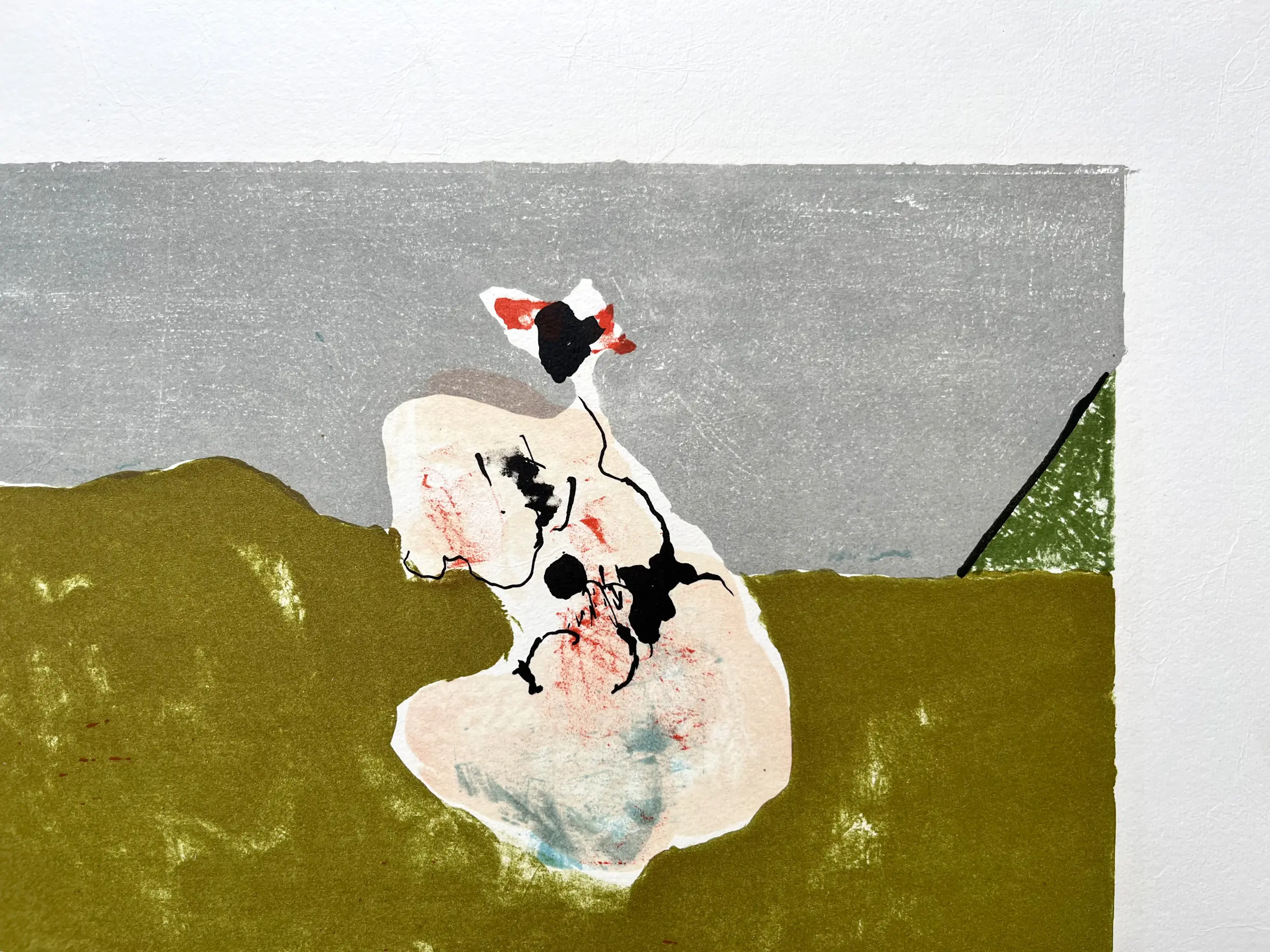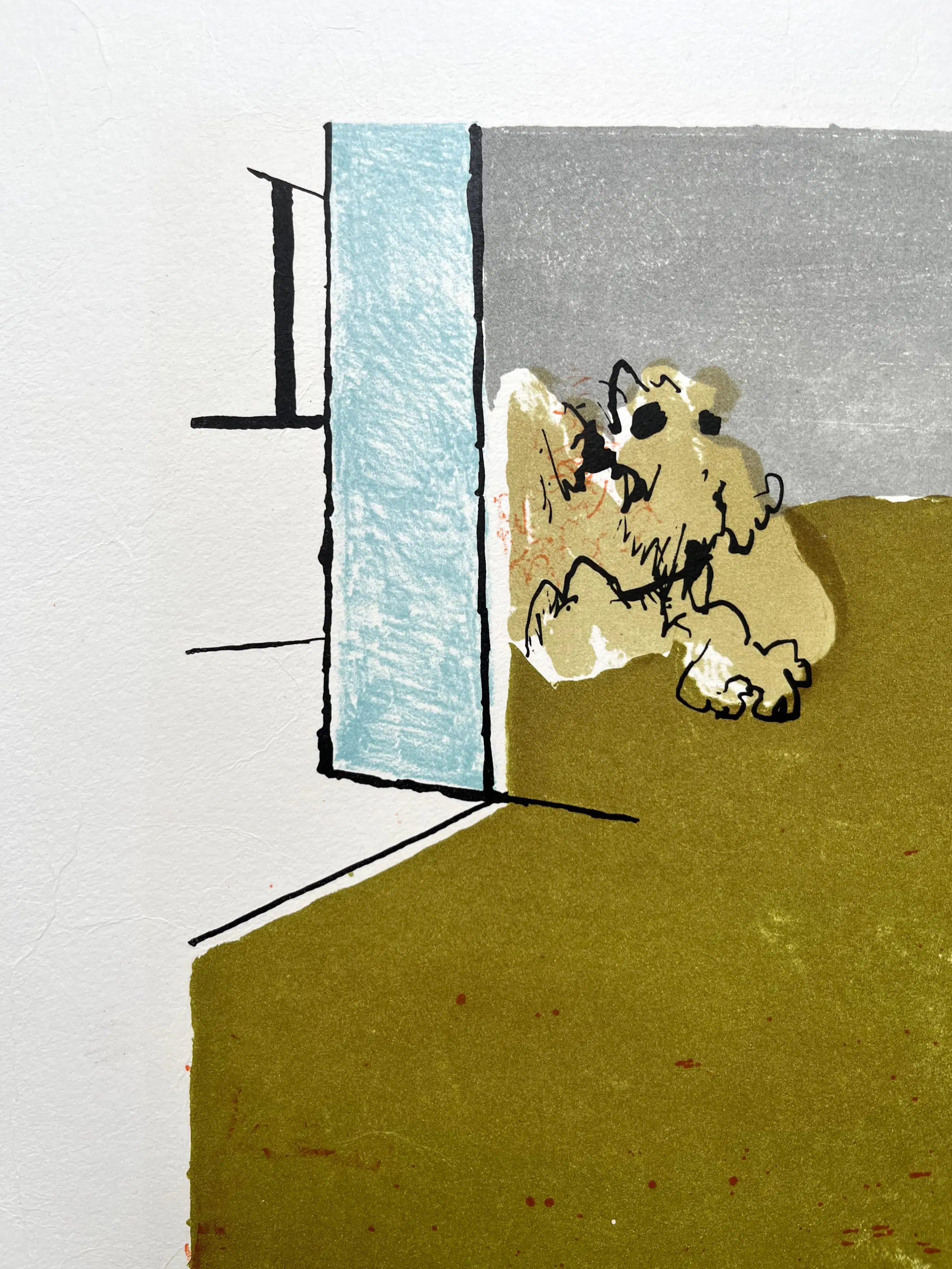 Constant creëerde deze litho in 1965. De litho toont een vrouw en hond, expressief vormgegeven, in een interieur met strakke, perspectivische lijnen, typisch voor Constant.