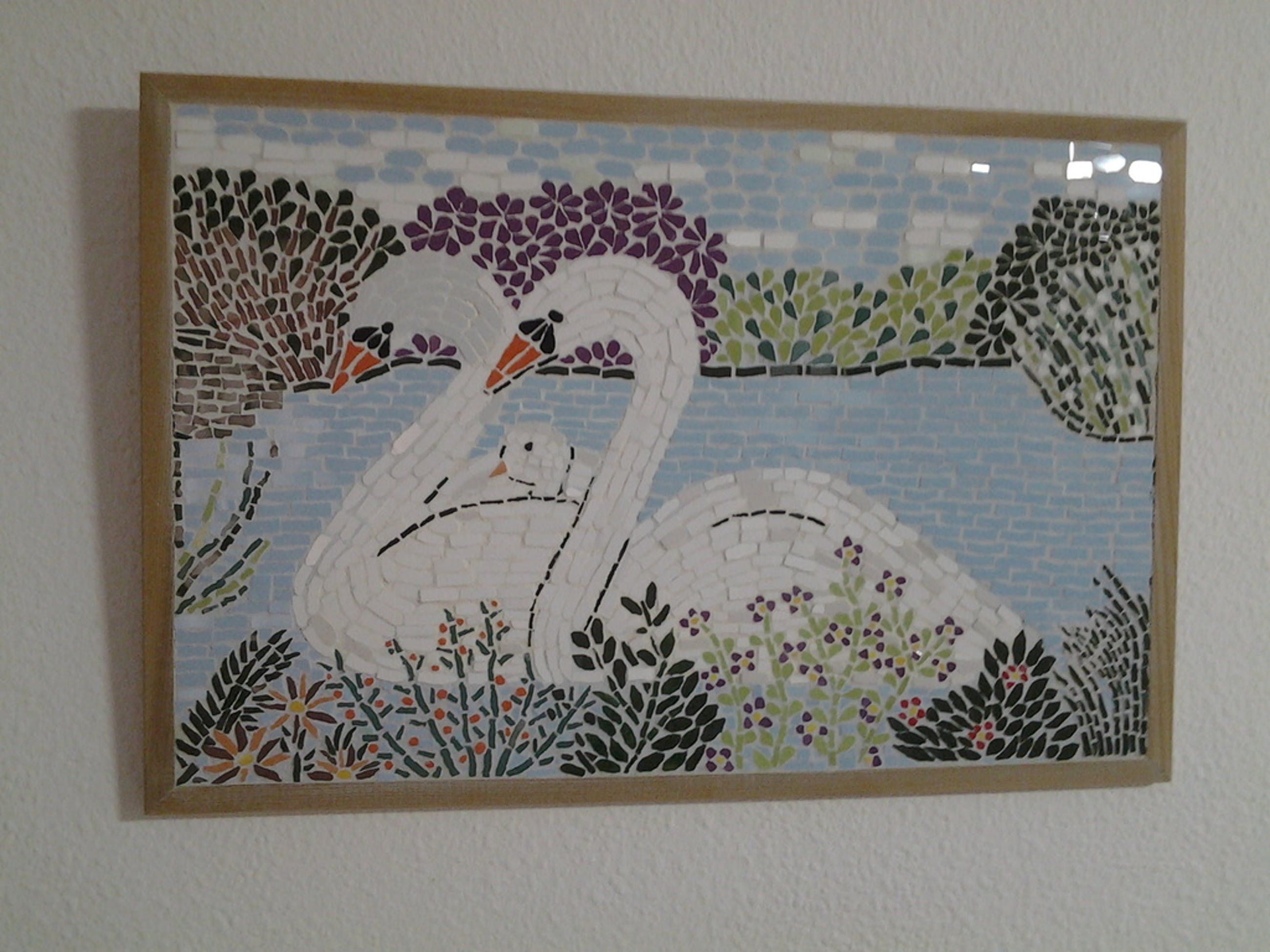 Zwanenfamilie. Gemaakt van stukjes keuken tegels. Afmeting 70 bij 40 cm. Ingelijst. De zwanenfamilie is gemaakt in voorjaar 2016 en afgemaakt in het najaar. Ik maak altijd 1 mozaïek. Nooit dezelfde. Dit is zeer intensief werk. De opbrengst schenk ik aan St. KIKA.
