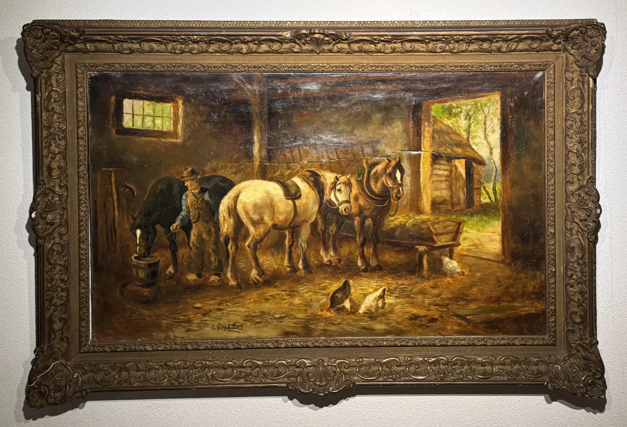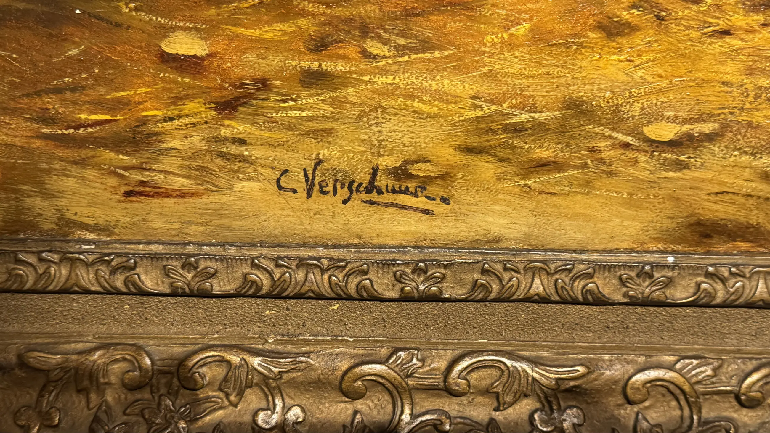 Schilderij moet hersteld en opgeknapt worden worden. Doek is gescheurd. Lijst heeft wat plekjes.