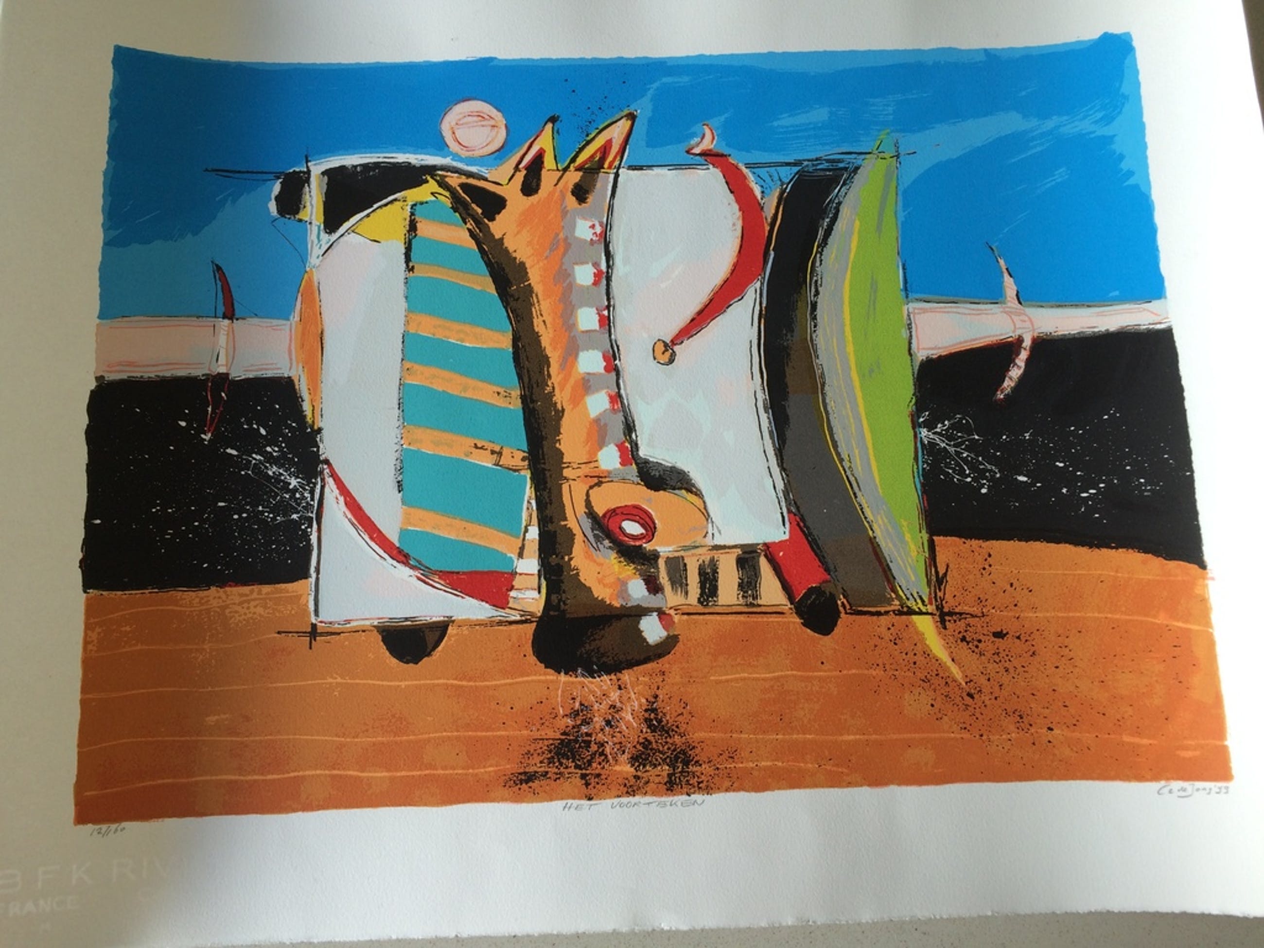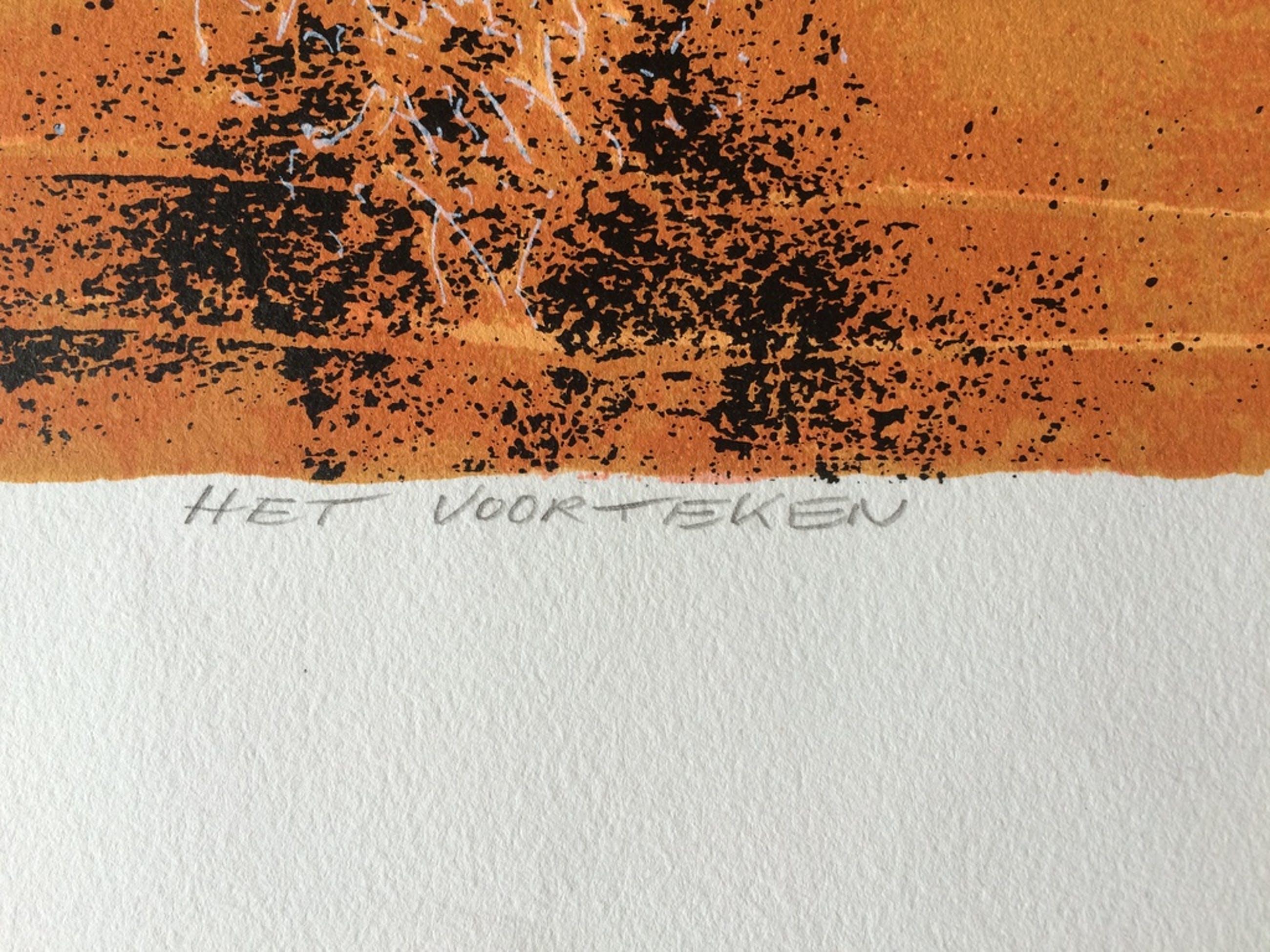 Mooie zeefdruk van Cor de Jong in perfecte conditie, gaat over het werk Het voorteken