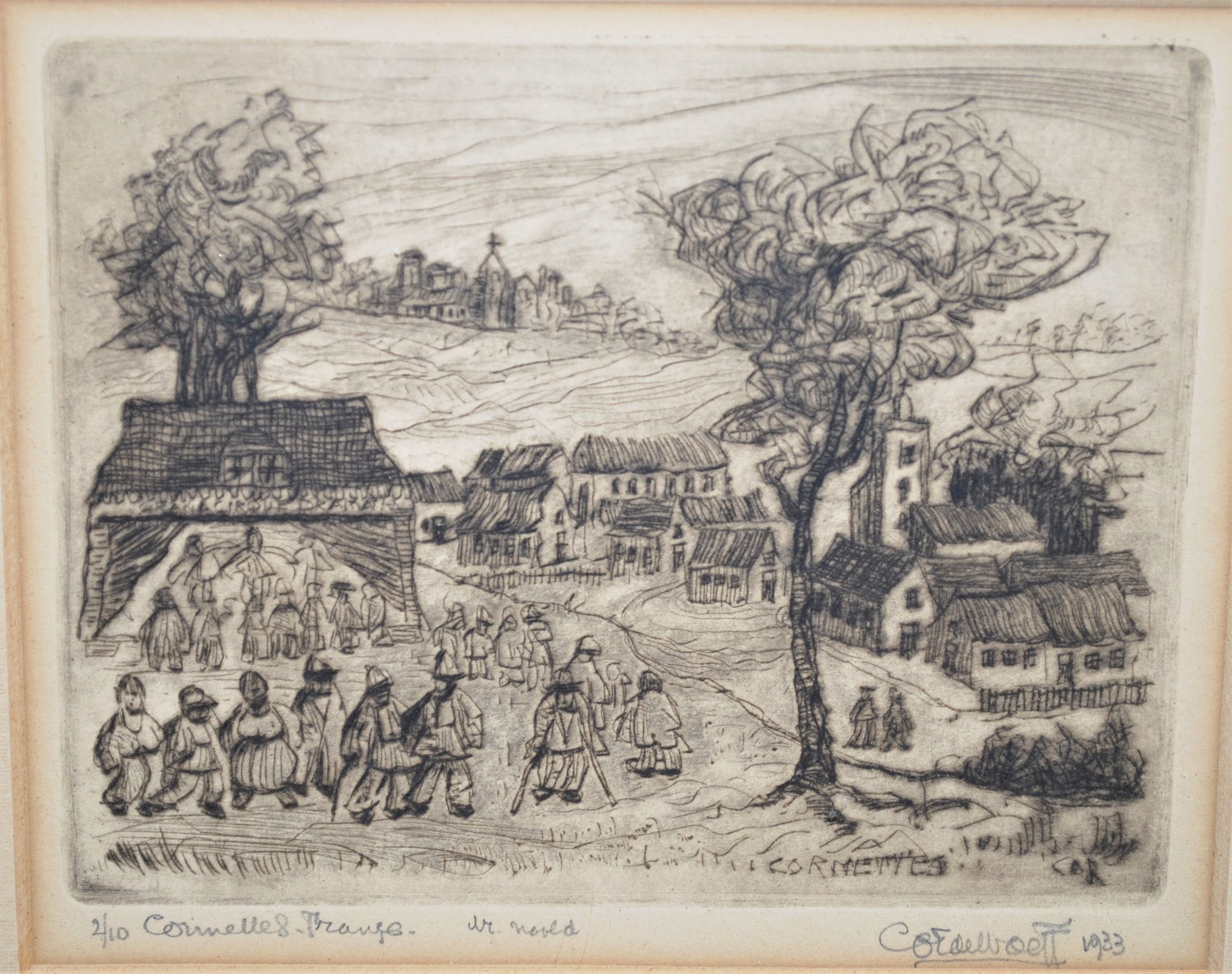 "Cornettes France', ets oplage 2/10. Plaatrand 12x15 cm. Achter glas en passepartout, in een houten lijst.
