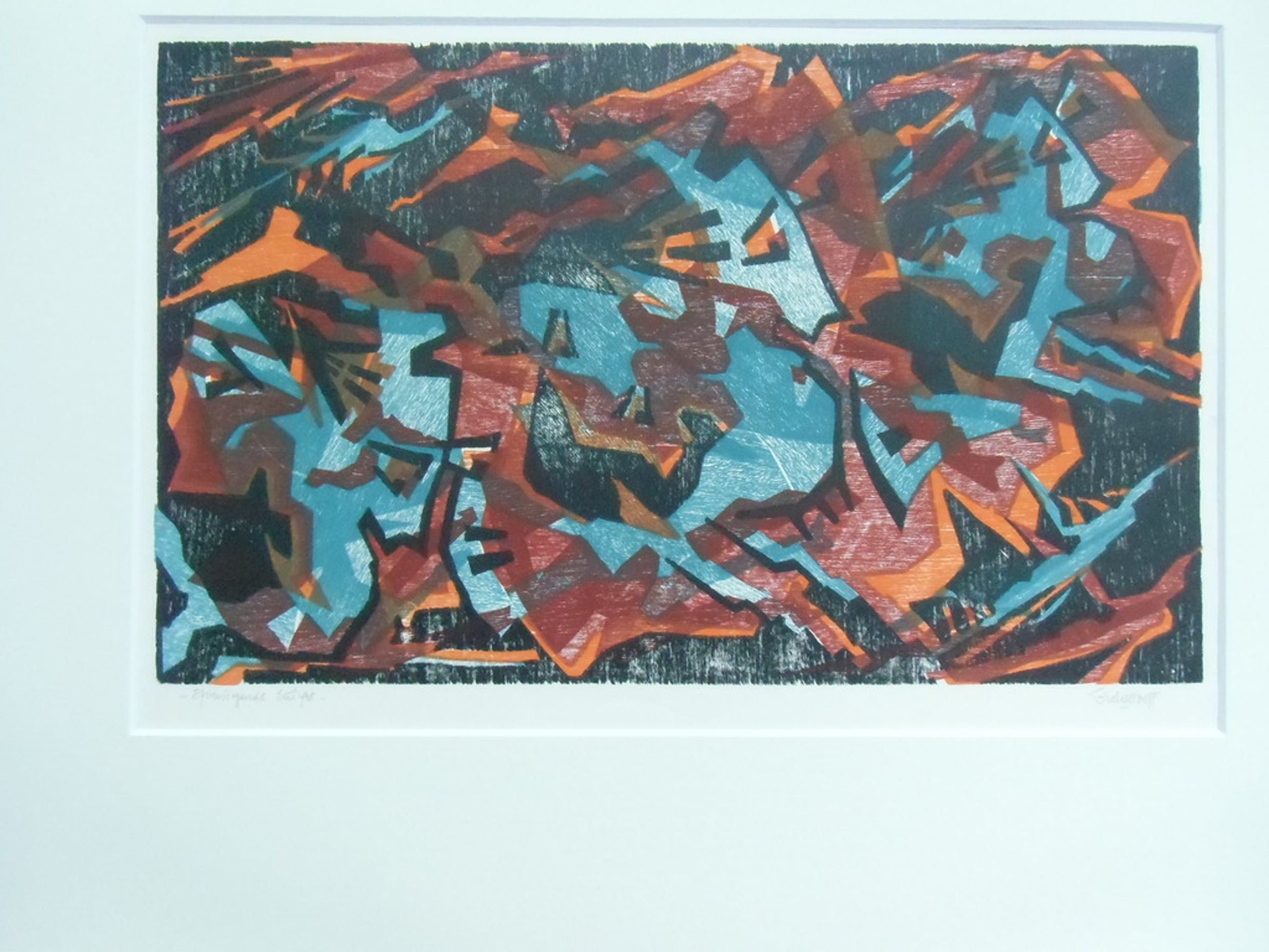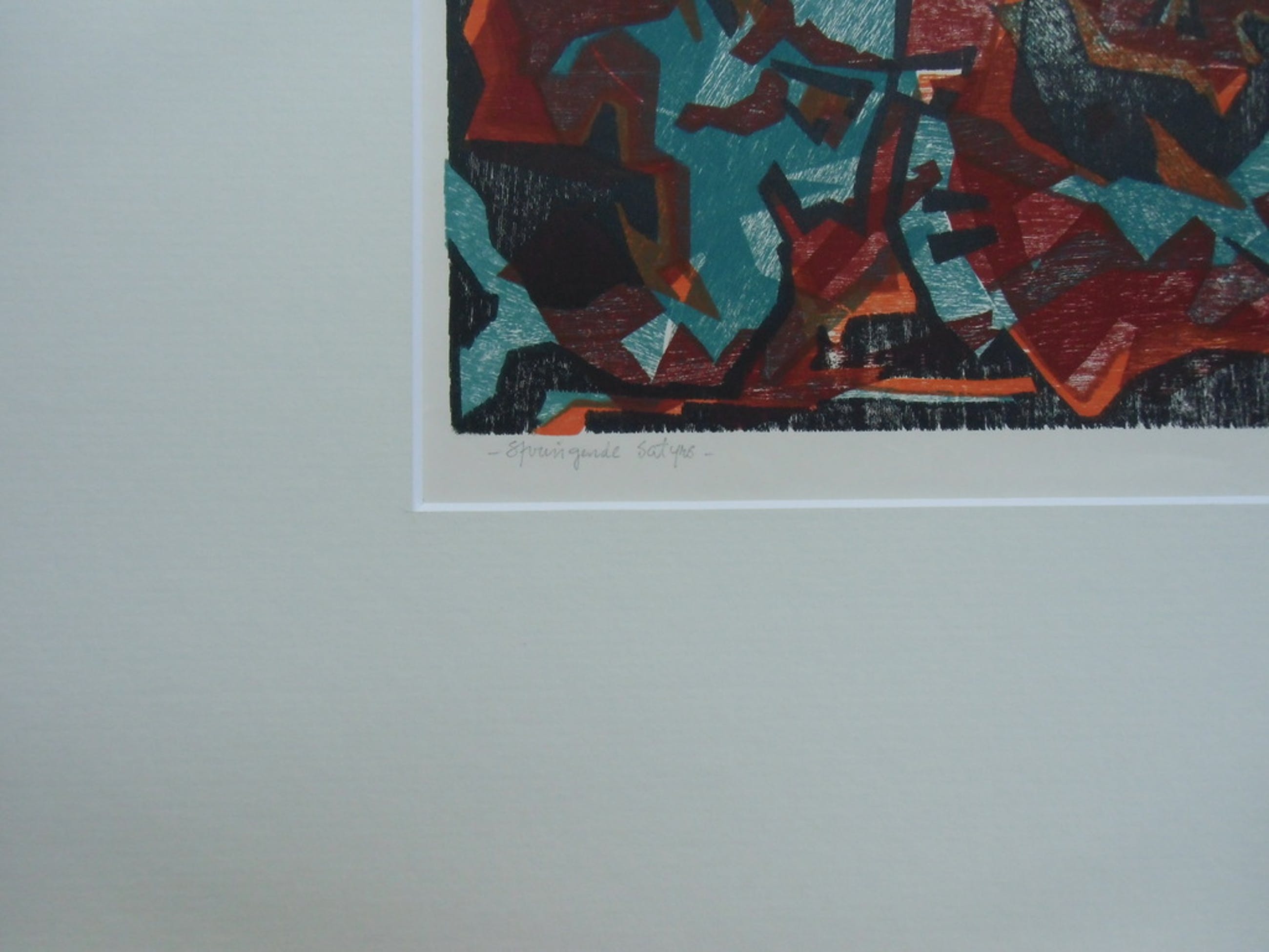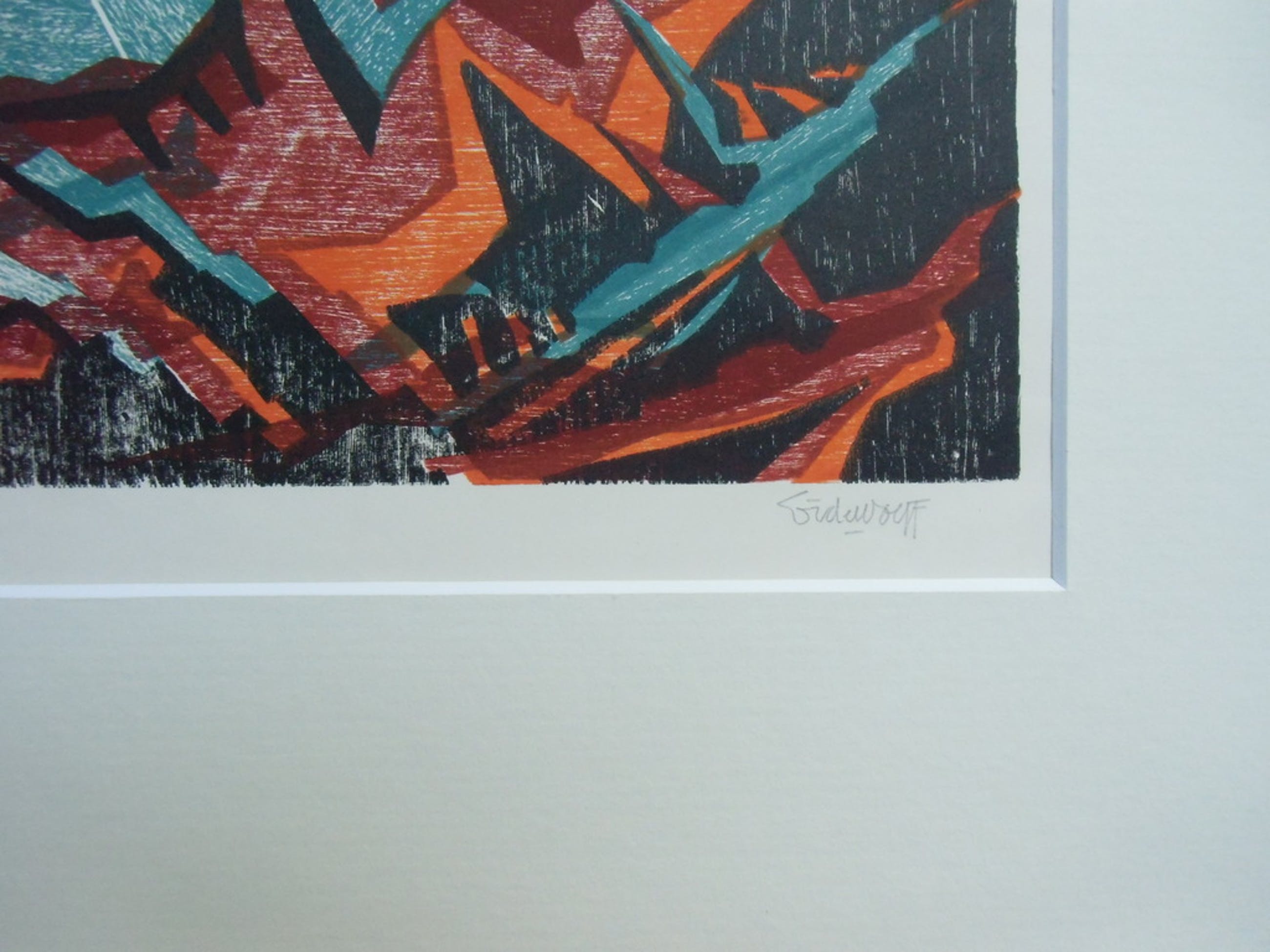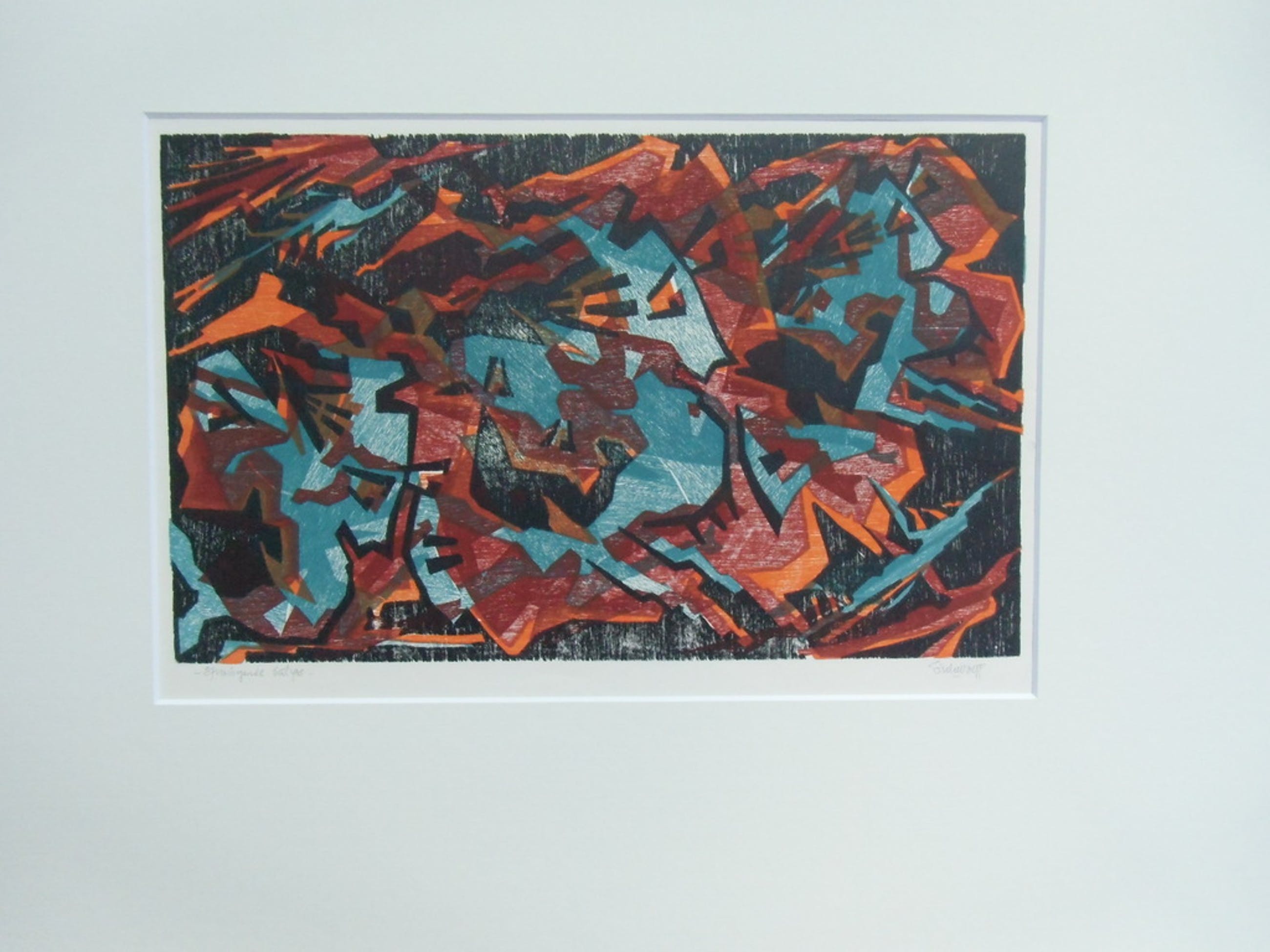 Deze kleurenhoutsnede vertoont een zeer genuanceerd beeld en is gedrukt van 4 blokken. Gesigneerd en betiteld met potlood. Beeldafmeting 22 x 36 cm. Los in passepartout opgenomen en van uitstekende kwaliteit.