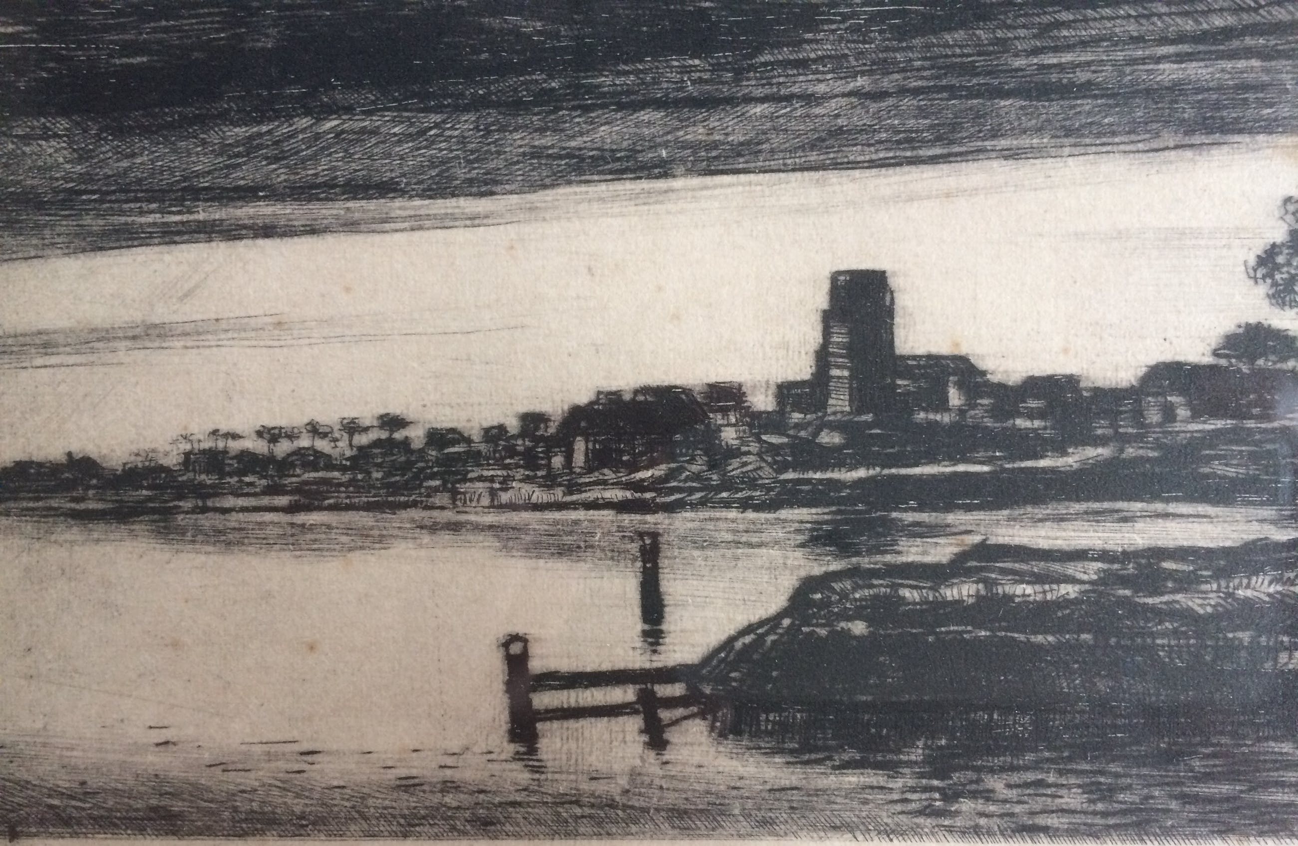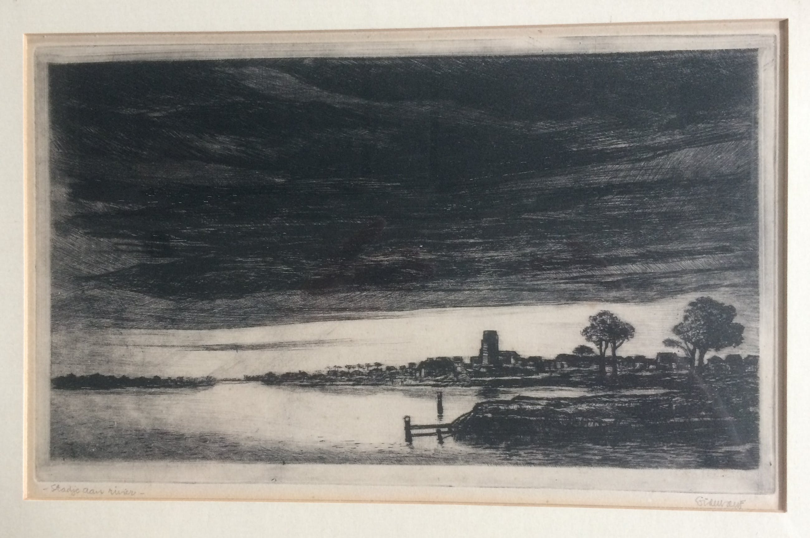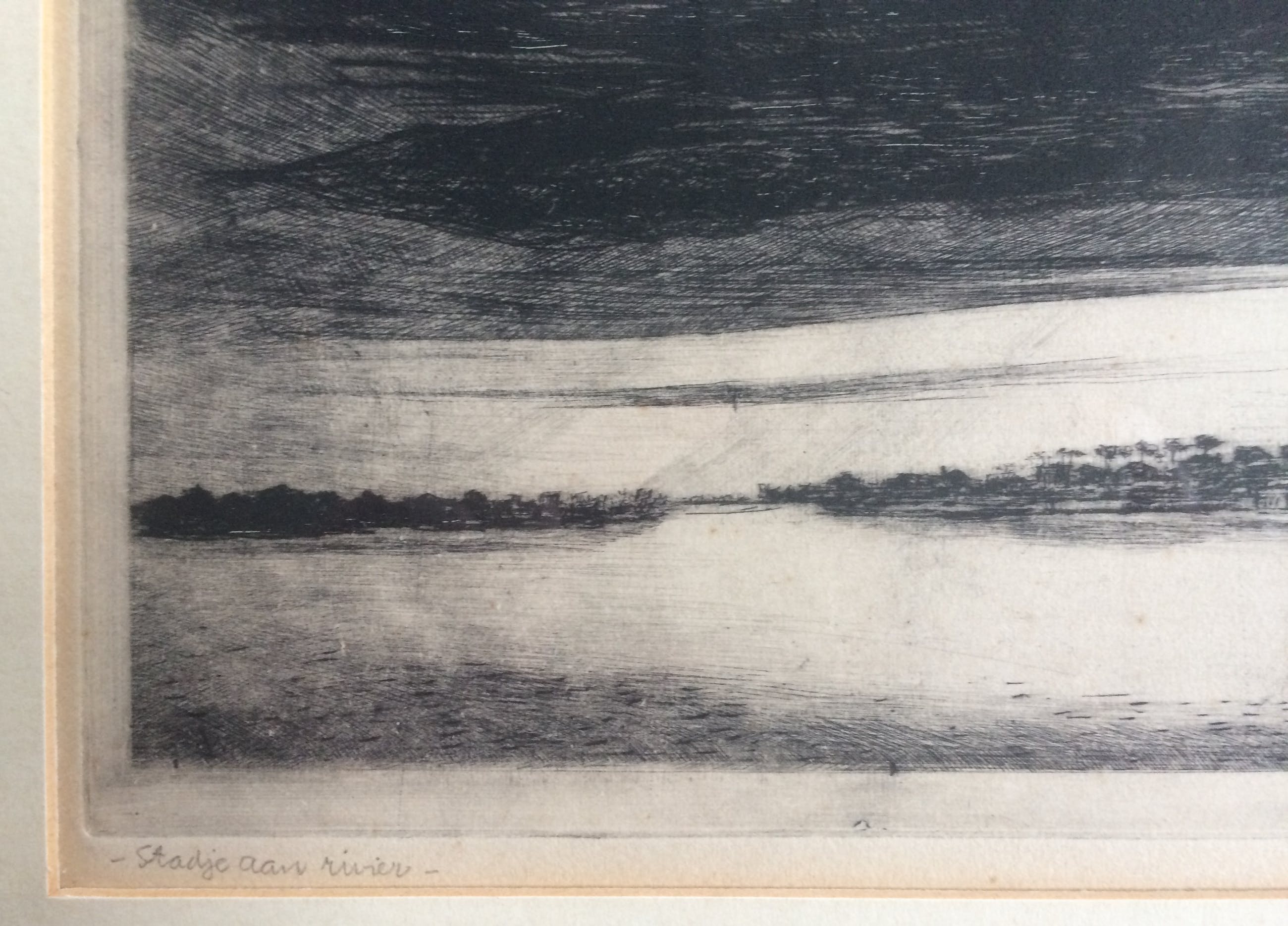 Karakteristieke ets van een Hollands rivierenlandschap.