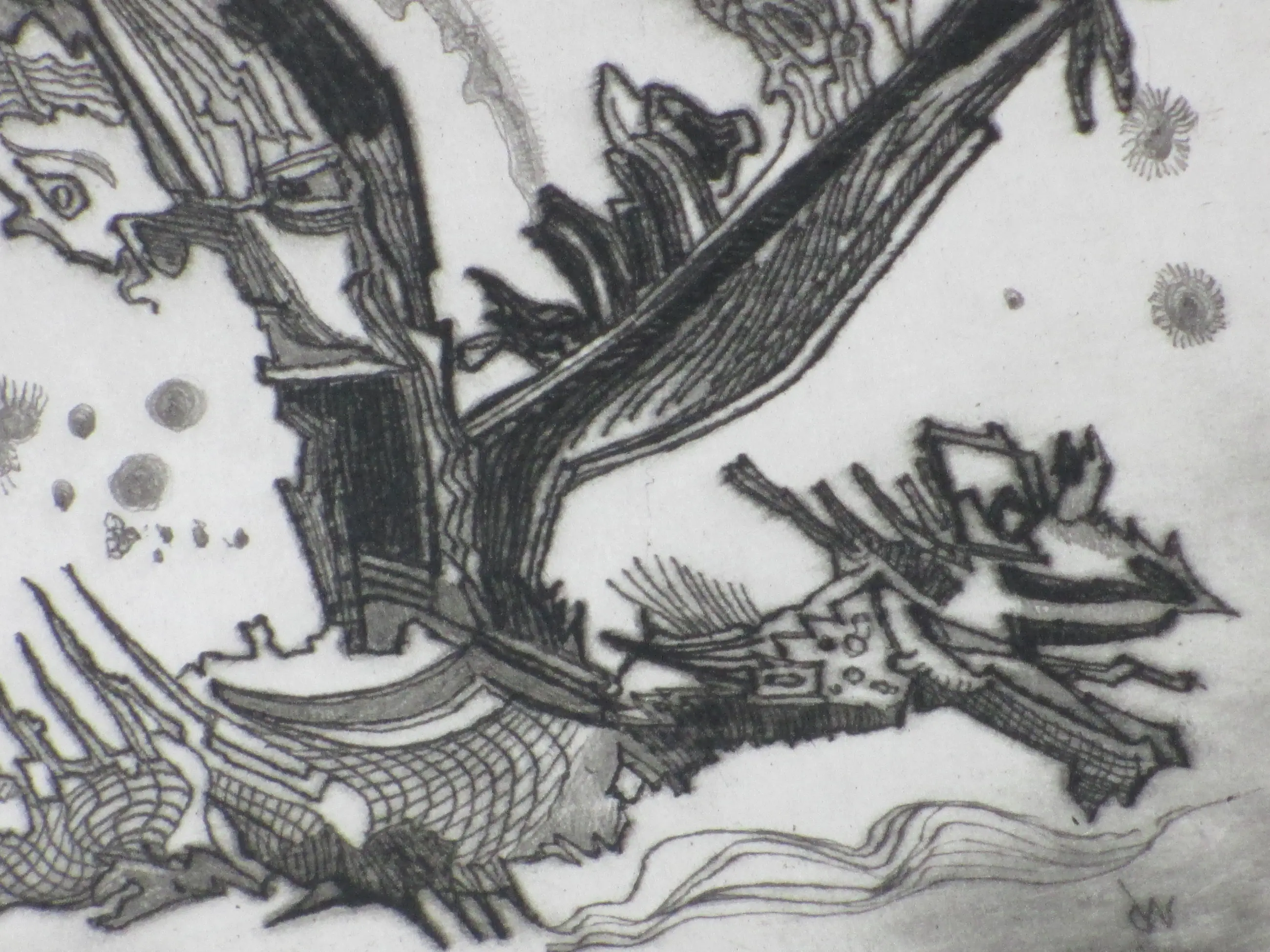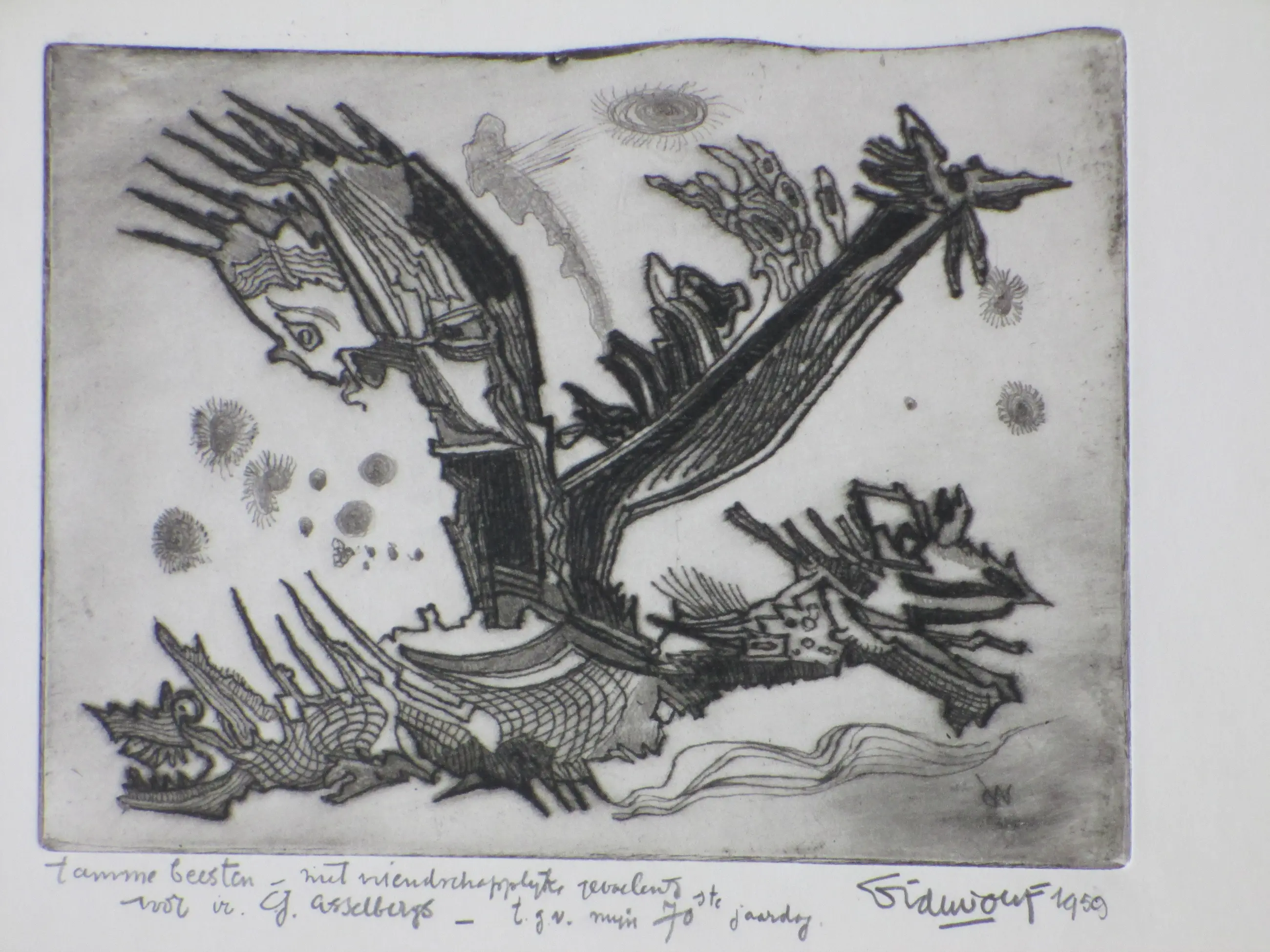 Ets door Cor de Wolff Typische voorstelling van een aantal vreemde beesten Losbladig onder passepartout, beeldmaat 12.5x16, bladmaat 20x24, p.p.maat 32x48 Gesigneerd en gedateerd in potlood r.o.: 'CordeWolff 1959' Getiteld in potlood l.o.: 'tamme beesten' Met opdracht in potlood aan G.J.Asselbergs l.o. Authenticiteit volledig gegarandeerd