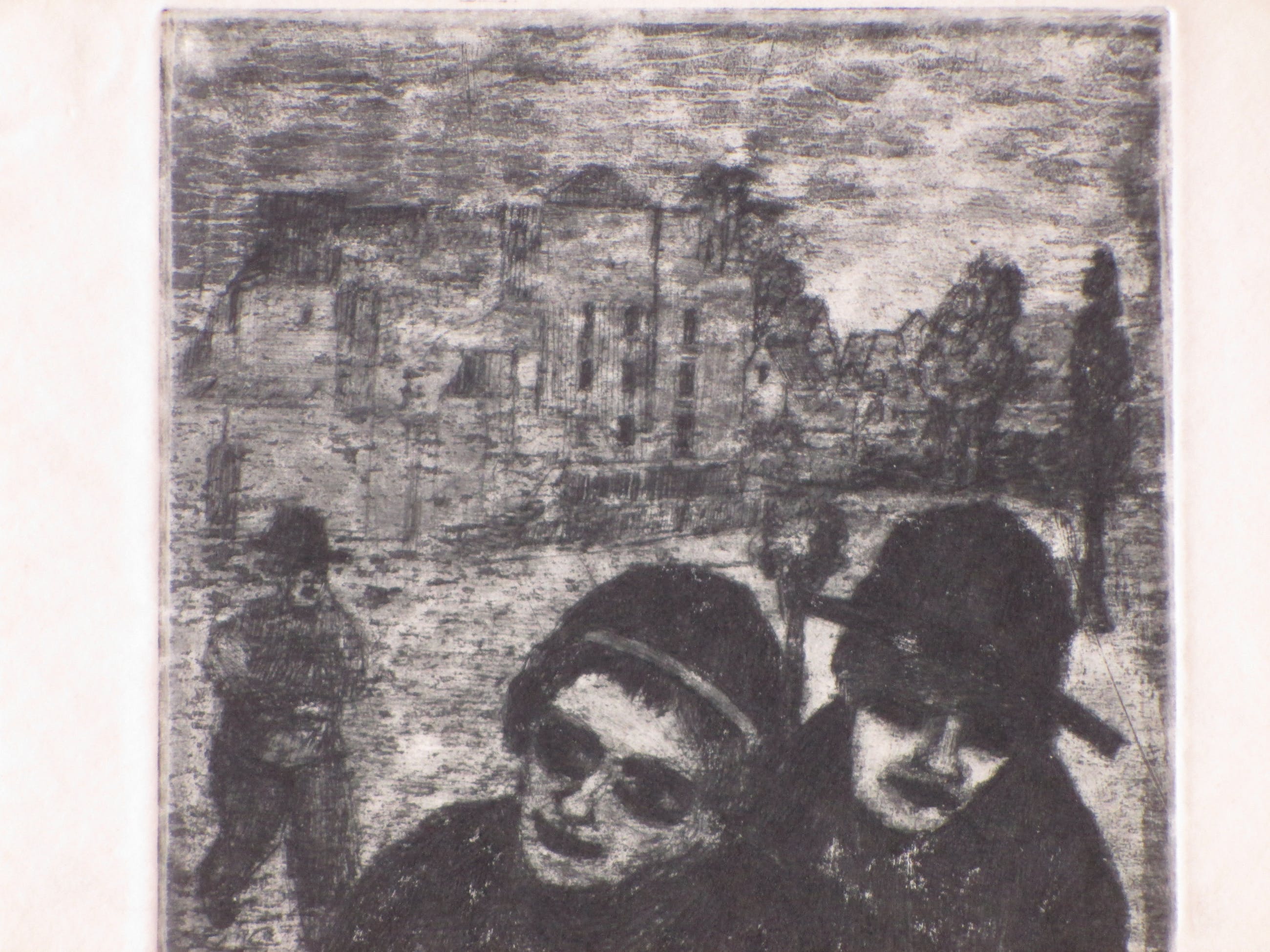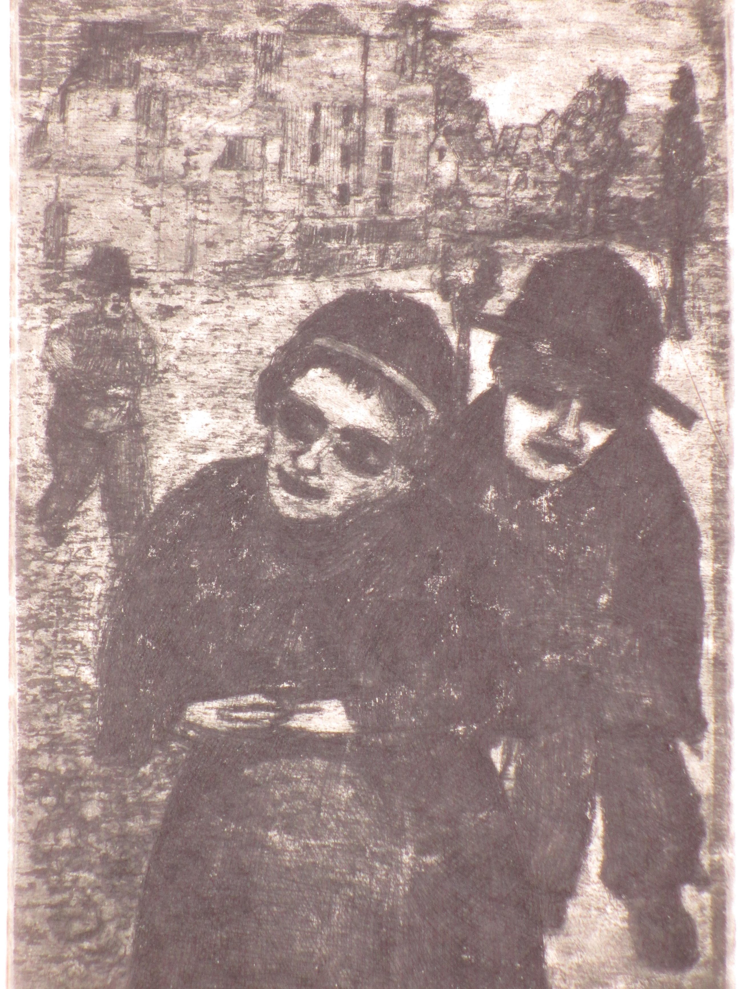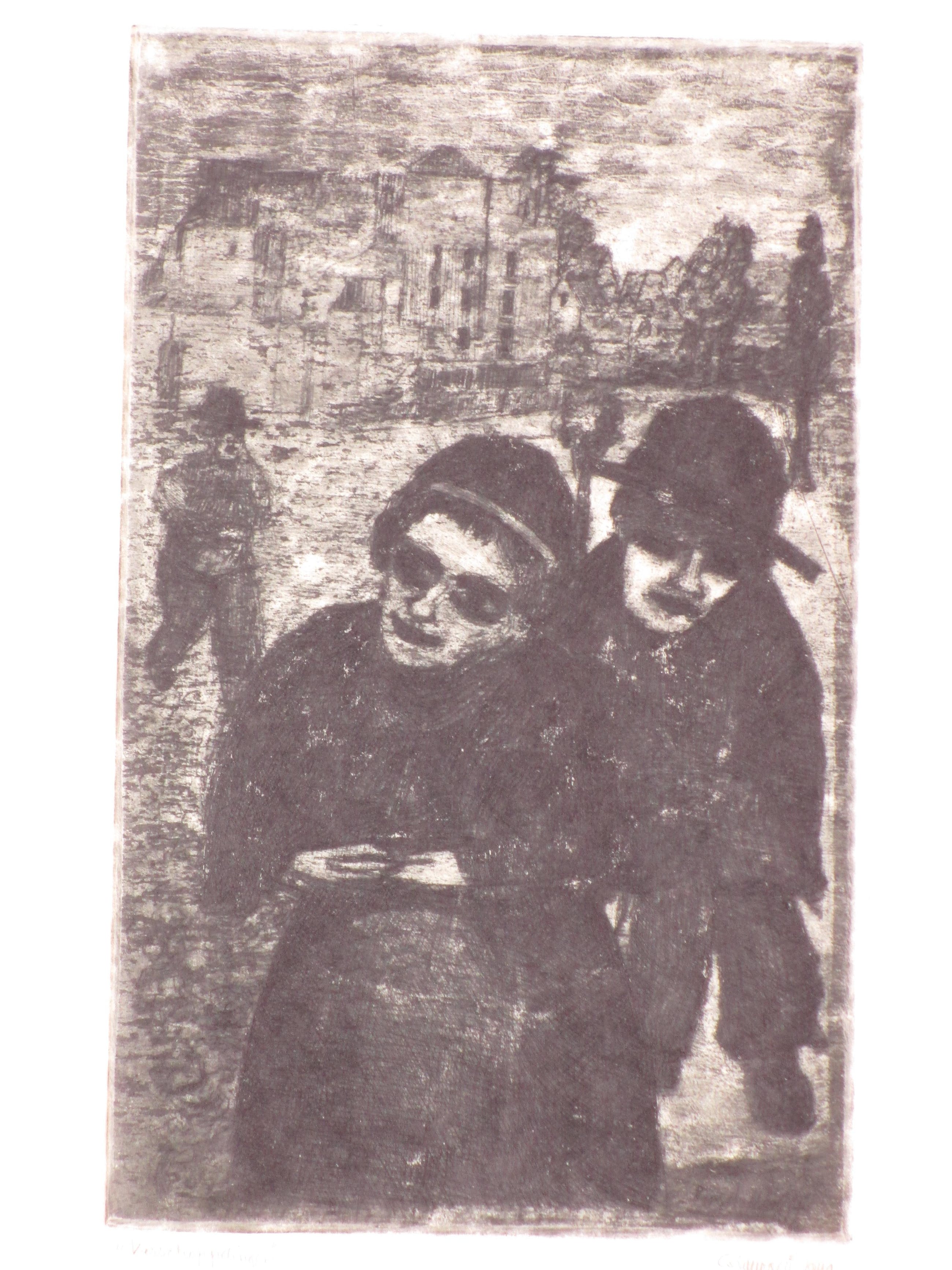 Ets door Cor de WolffVoorstelling van figuren op straat, getiteld ' Verschoppelingen' Losbladig onder passepartout, beeldmaat 24x15, bladmaat 32x21Gesigneerd en gedateerd r.o. 'CordeWolff 1949' Getiteld l.o. 'Verschoppelingen' Authenticiteit volledig gegarandeerd