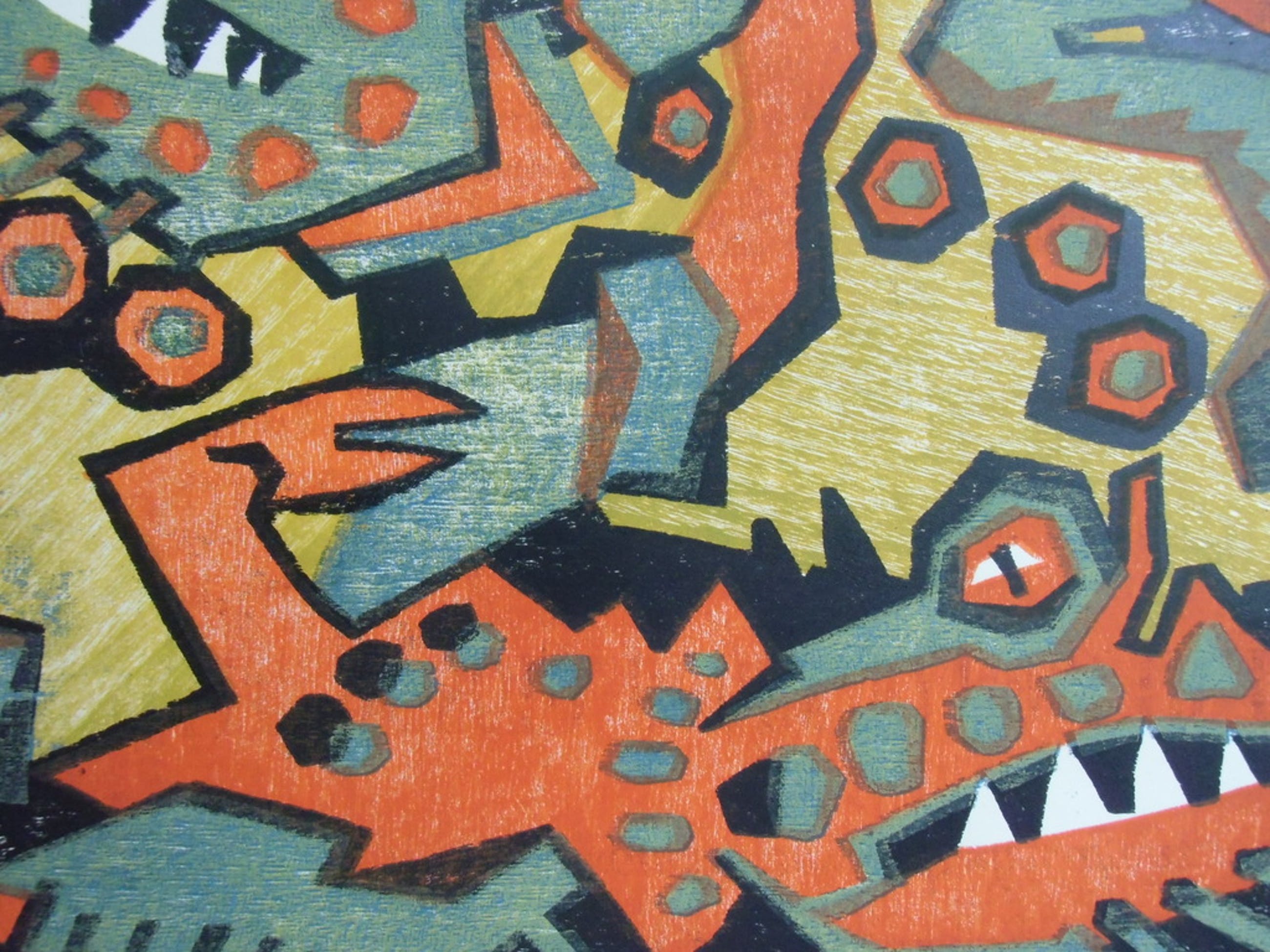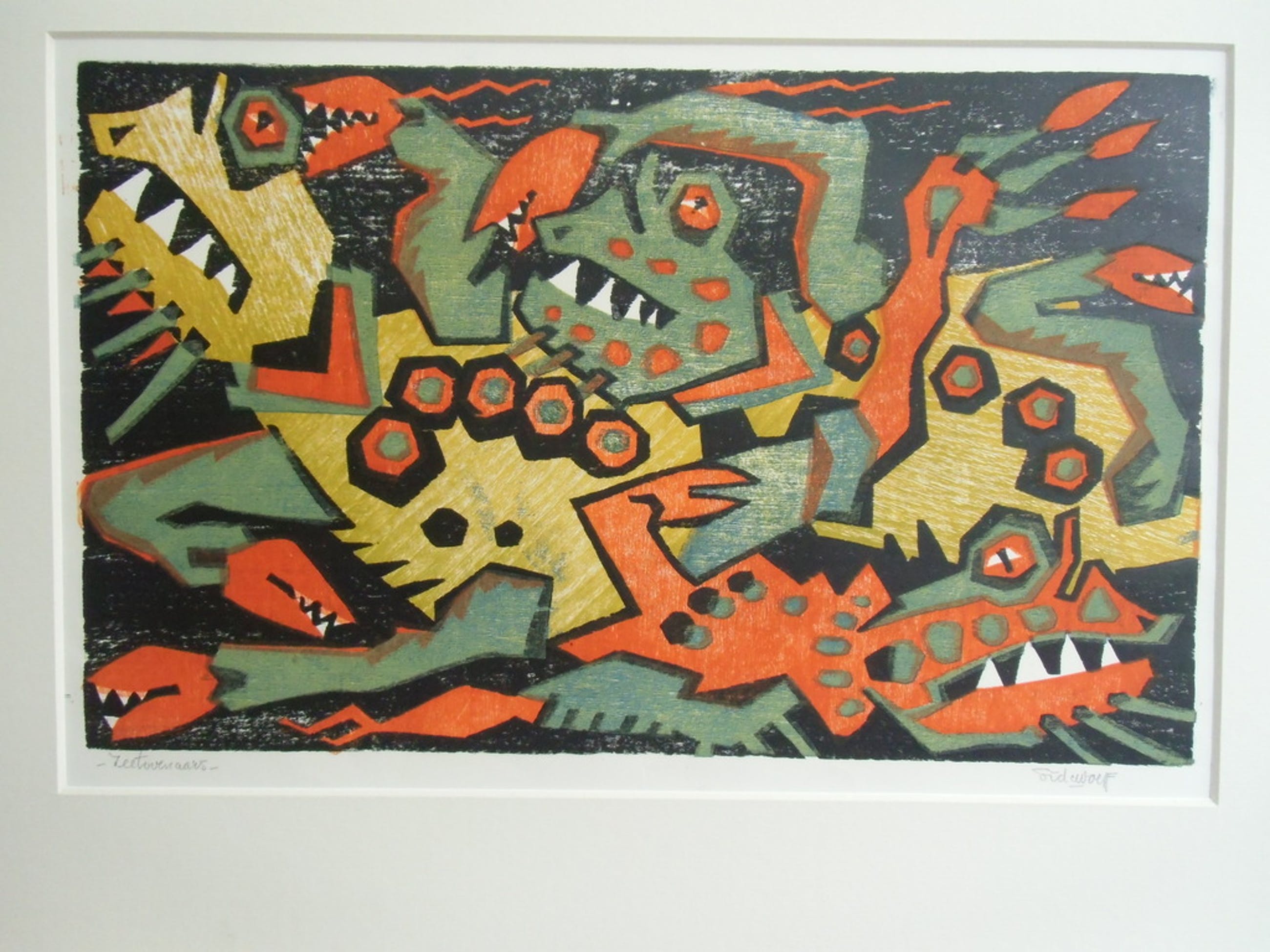 Deze kleurenhoutsnede is afgedrukt van vier blokken en is rond 1954 gemaakt. Beeldmaat 22 x 36 cm. Blad 32 x 46 cm.