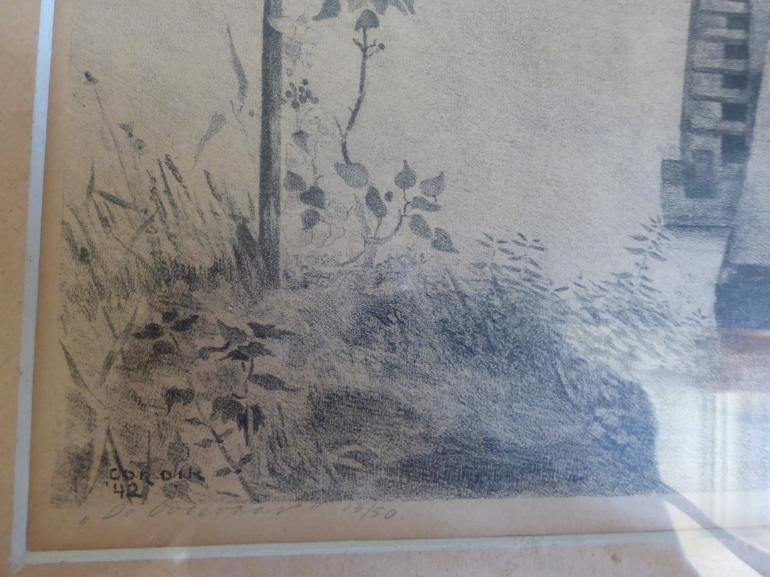 De Ooievaar is een molen, met potlood staat linksonder 13/50 en daarboven in zwarte inkt(?) Cor Dikm, en daaronder '42