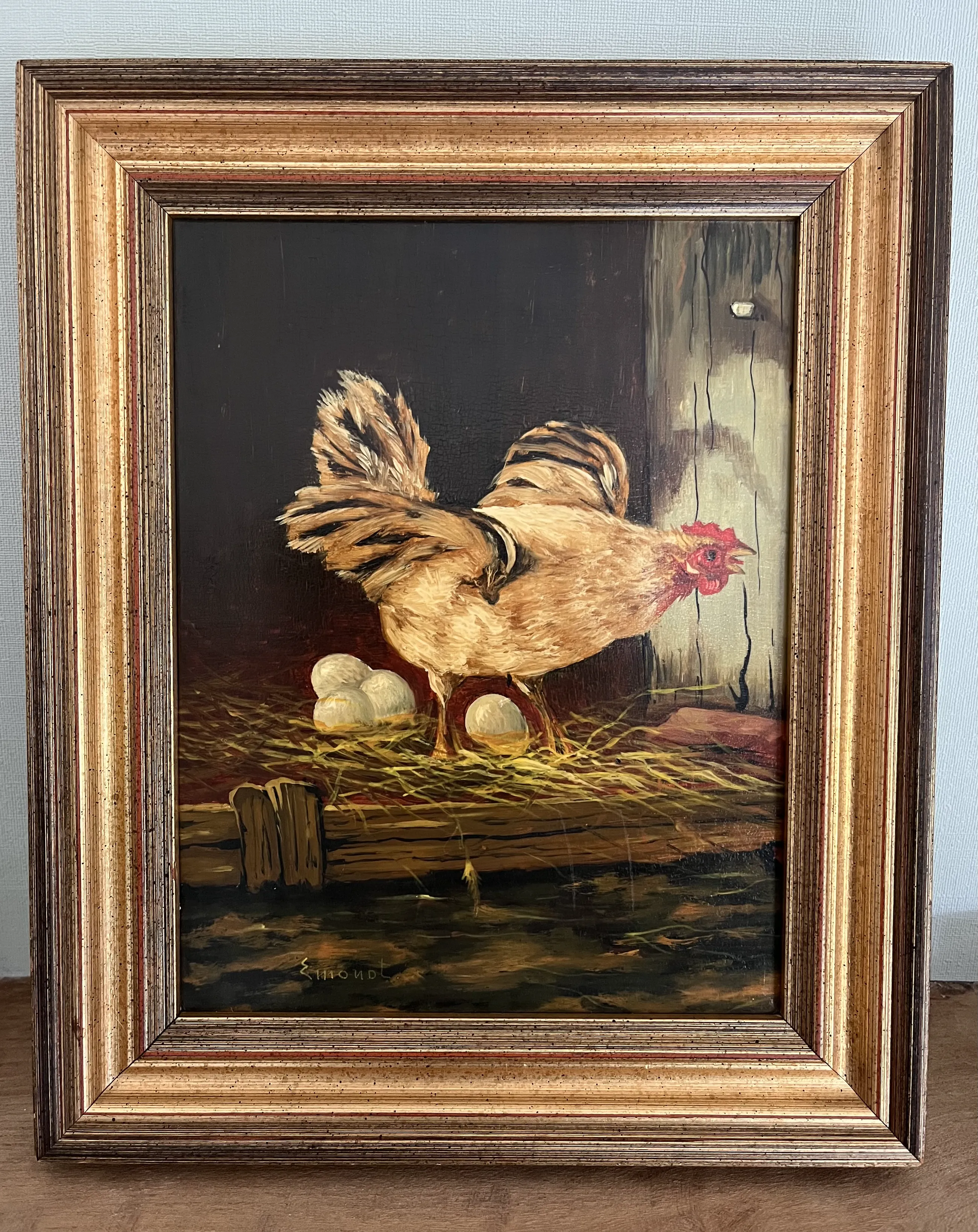 Het werk laat een kip zien die bezig is met het leggen van eieren.