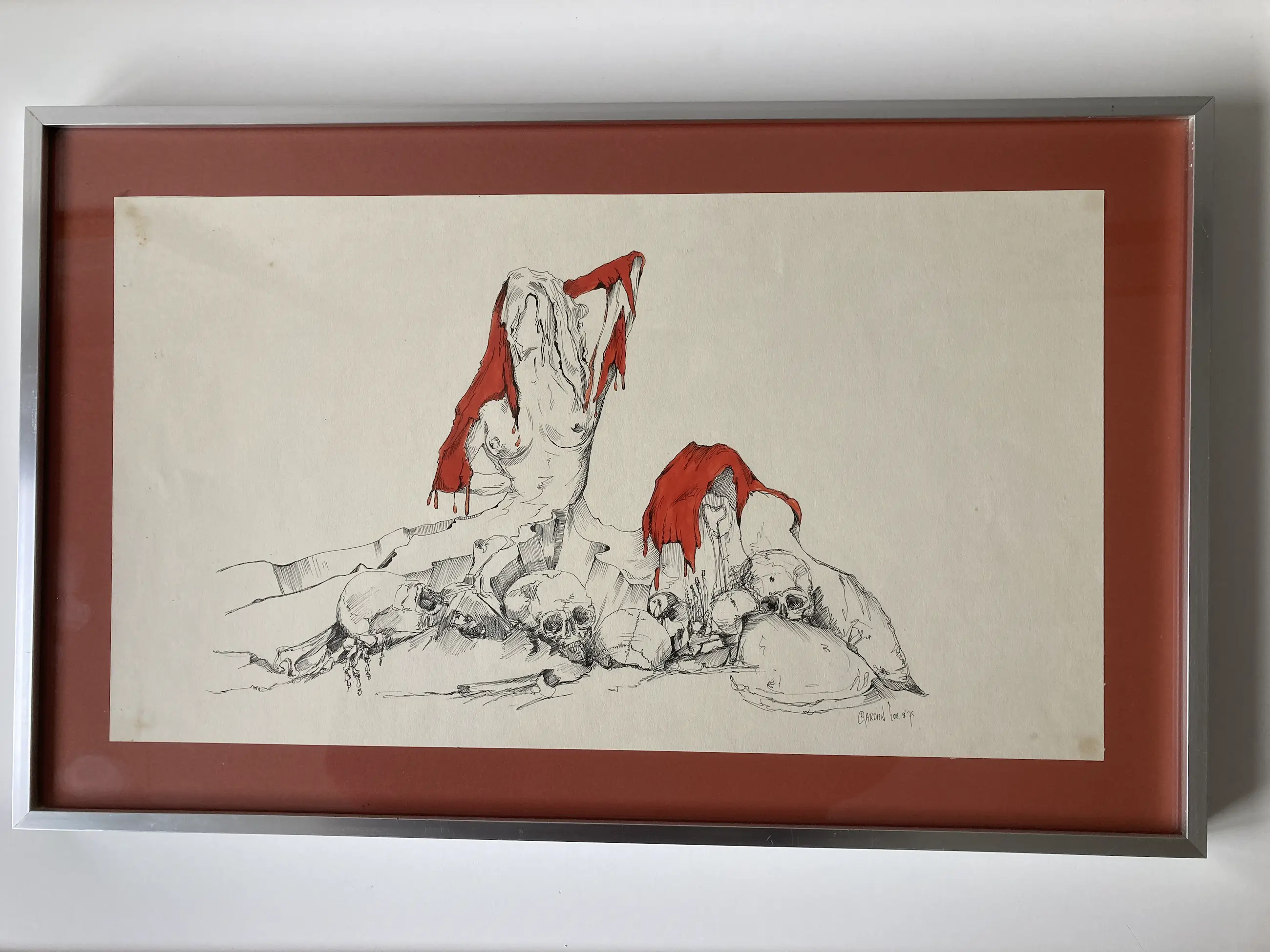 Surrealistische tekening van torso vrouw met doodskoppen