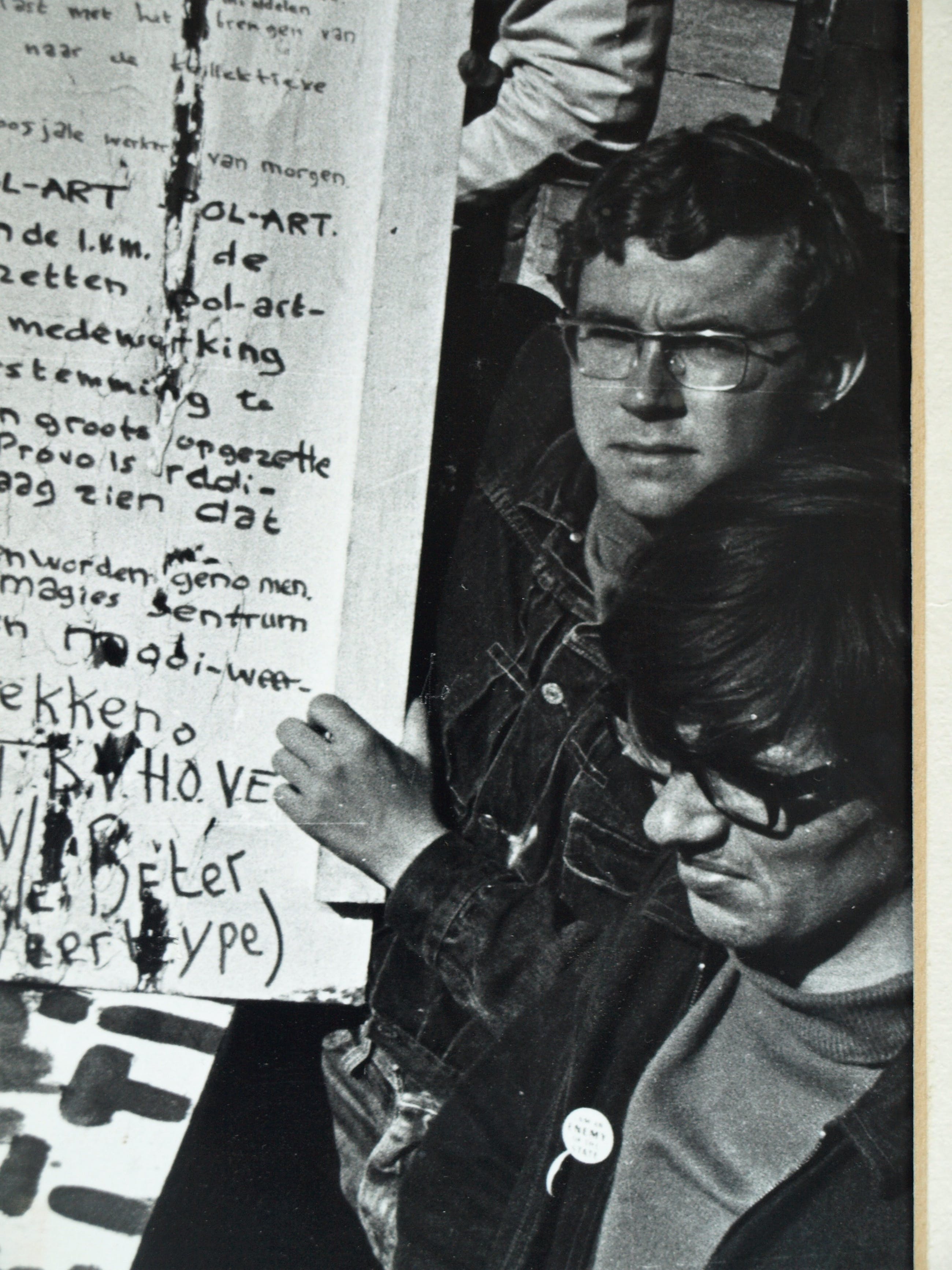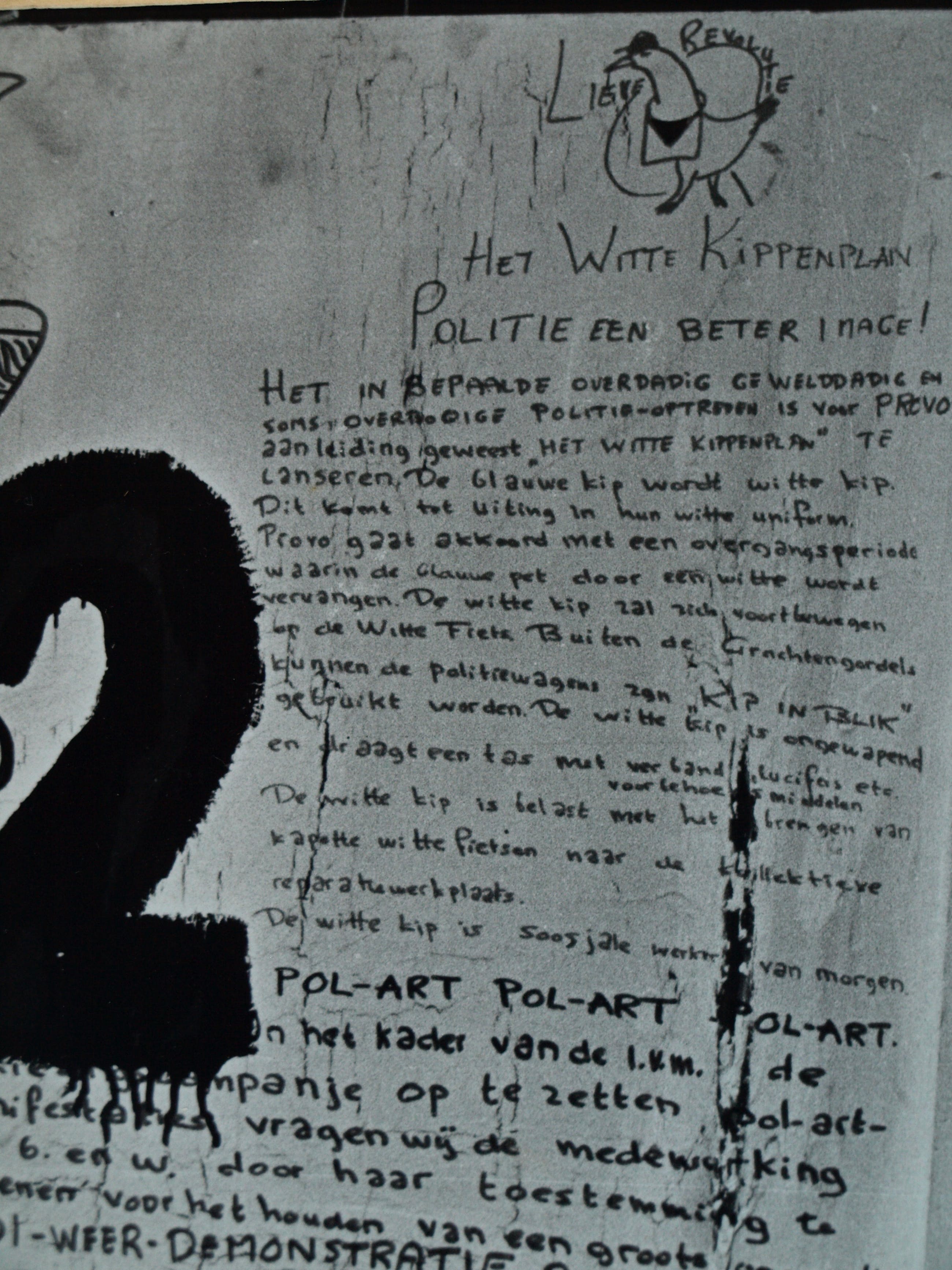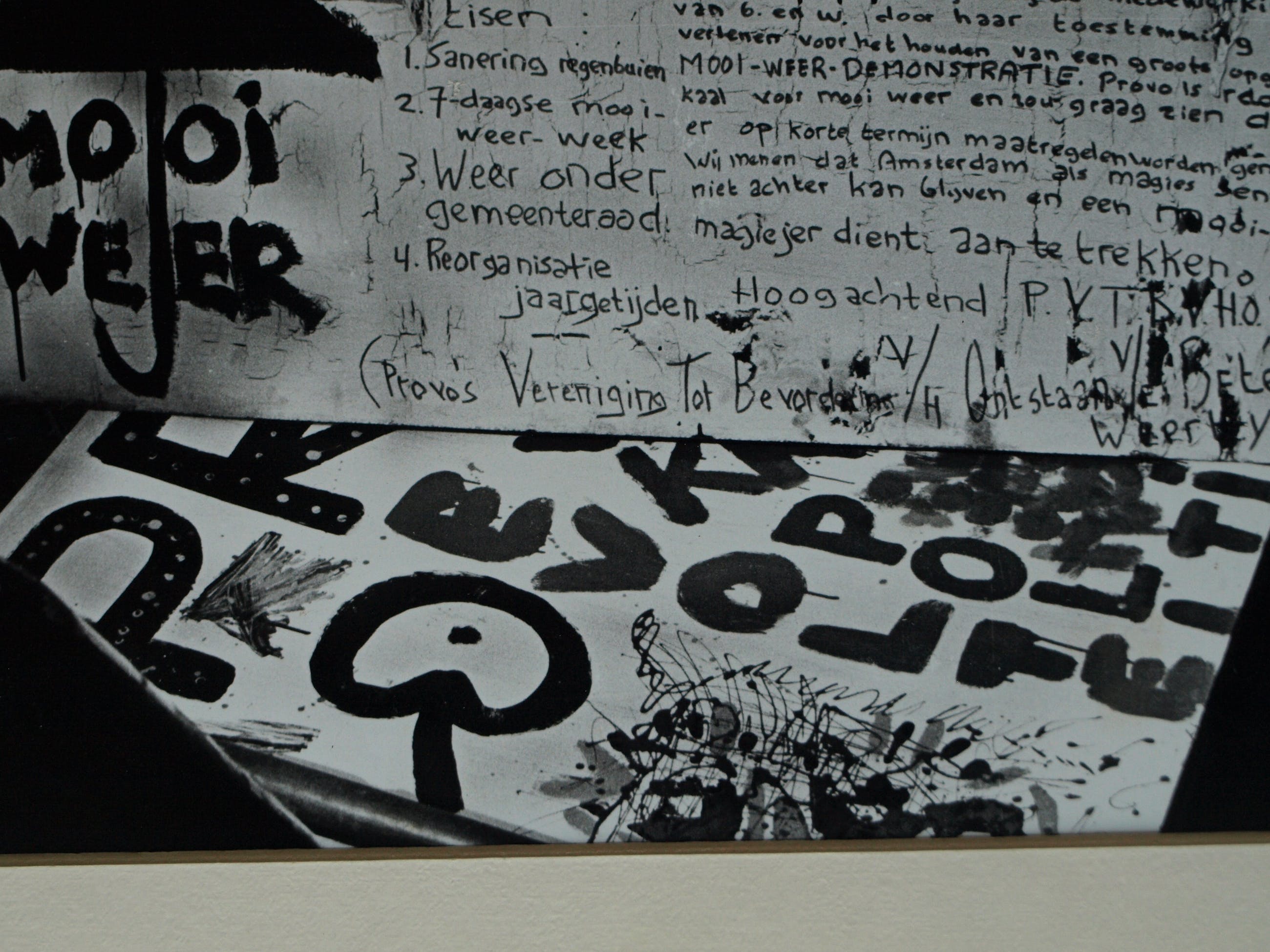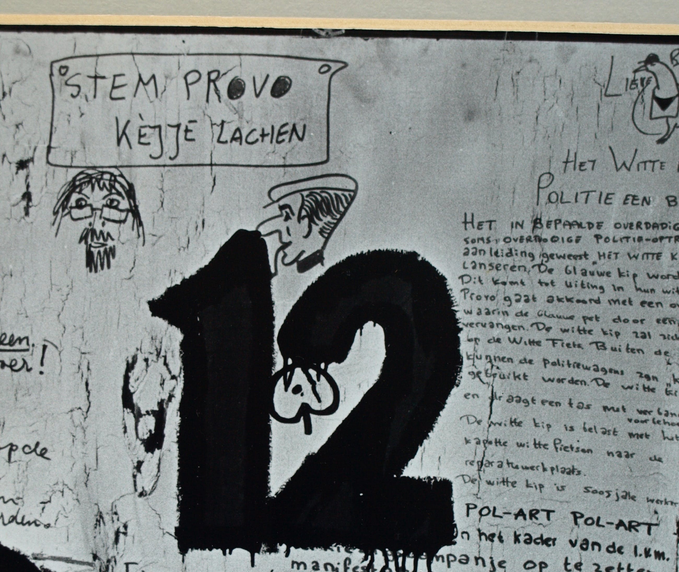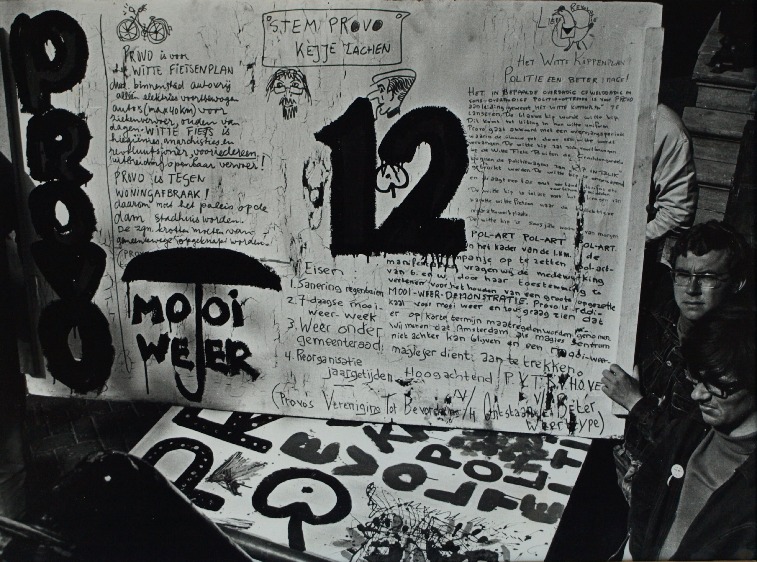 De foto van een verkiezingsbord van de protestbeweging PROVO is gemaakt tijdens de Gemeenteraadsverkiezingen in Amsterdam in 1966.