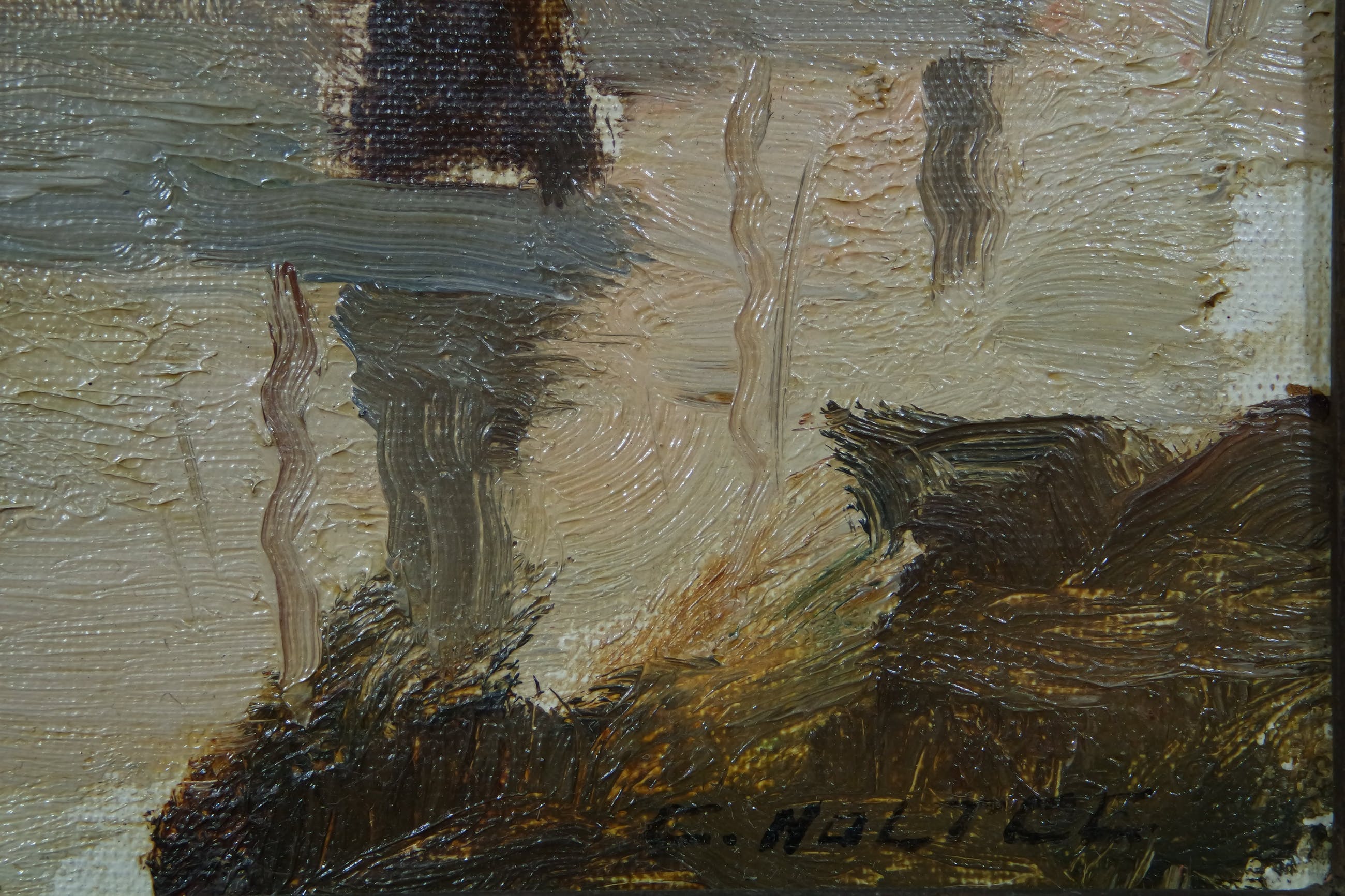 Het doek is in goede conditie. De authentieke lijst heeft wat kleine beschadigingen (echter zeker niet hinderlijk).