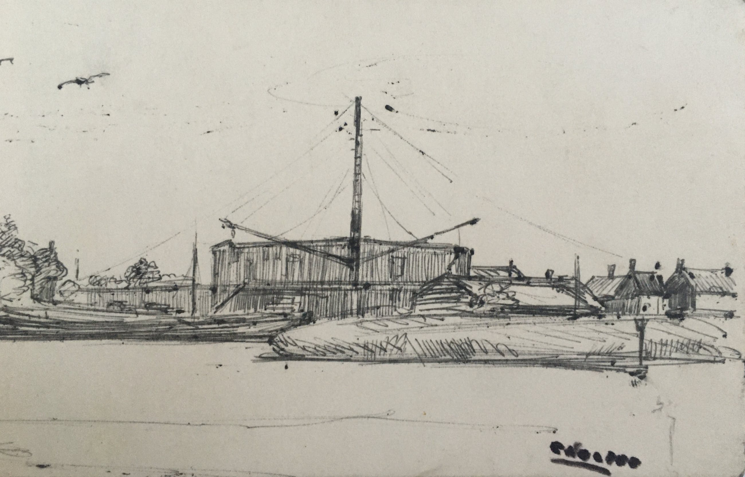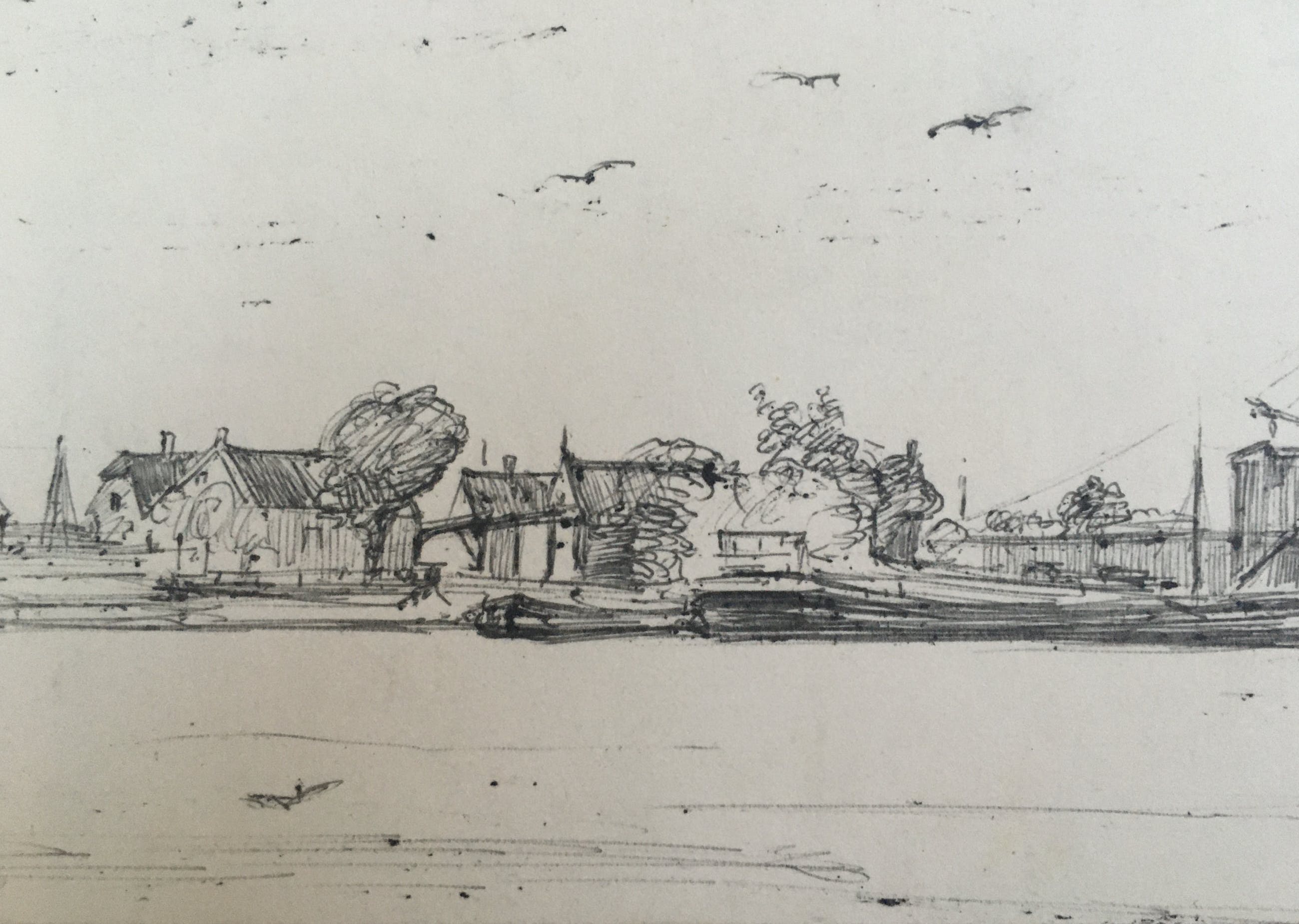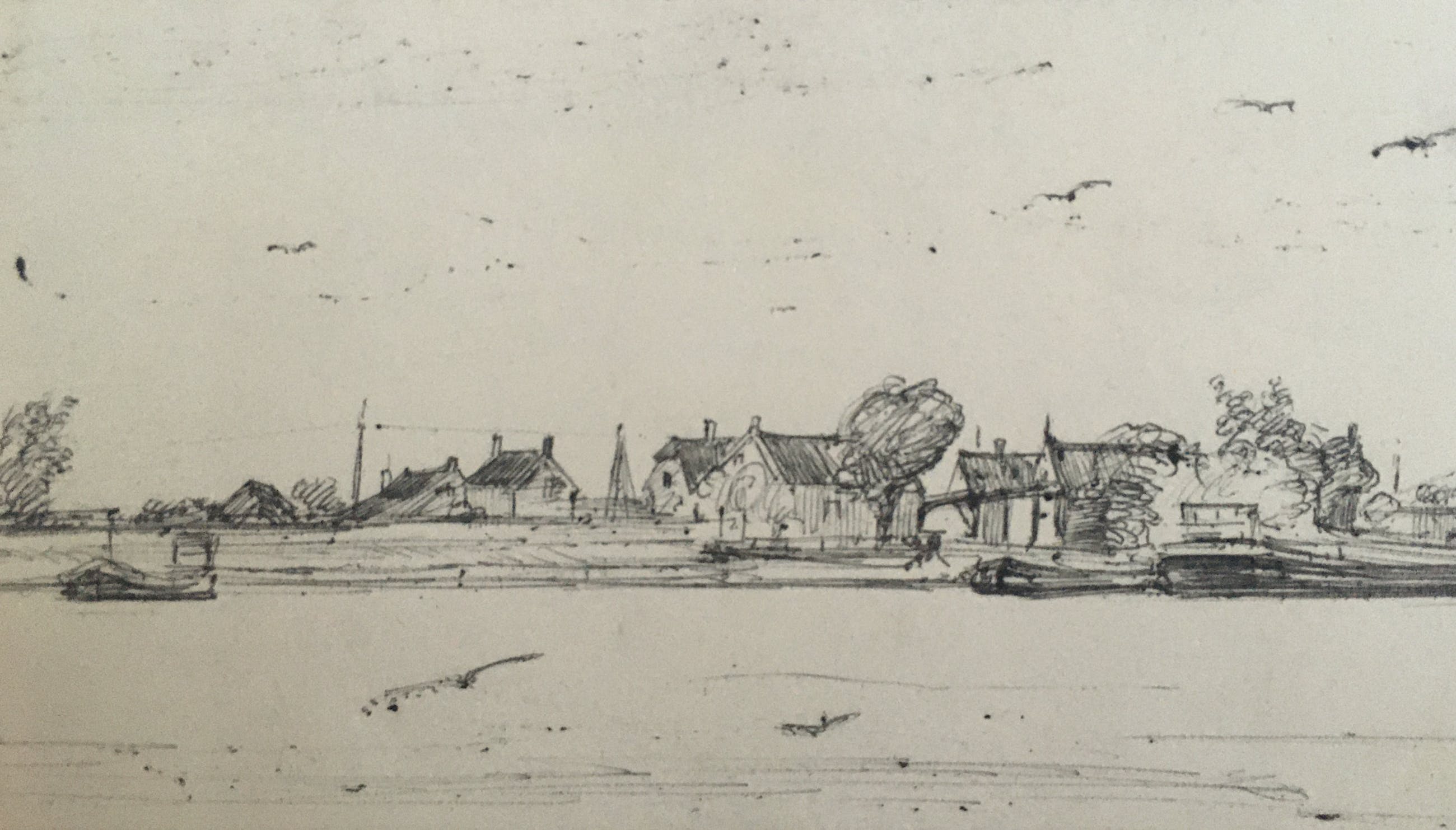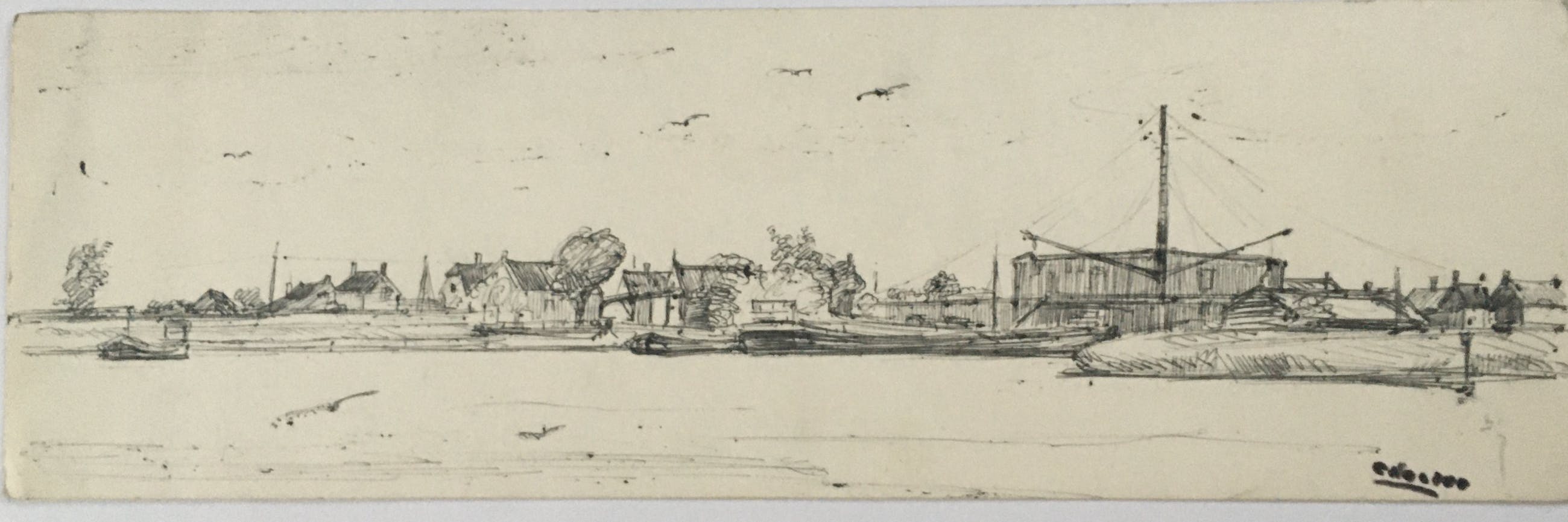 Fraaie panorama tekening van Cor Noltee. Afkomstig uit nalatenschap familie. Voluit gesigneerd rechts onder.