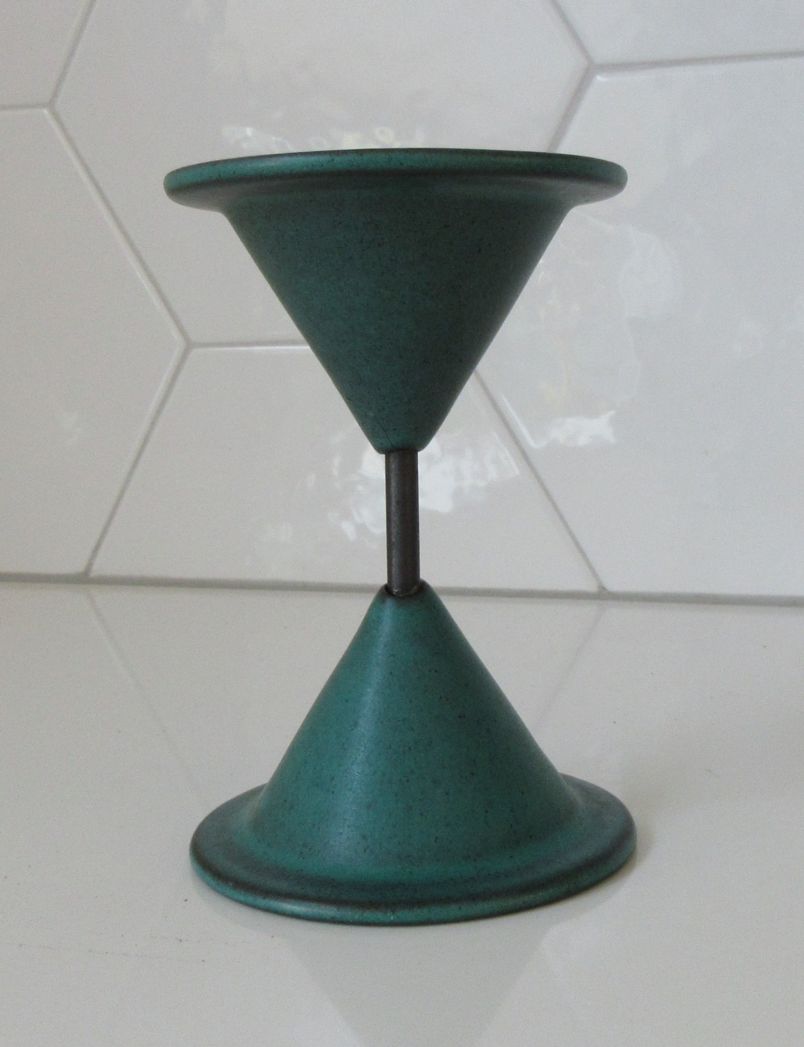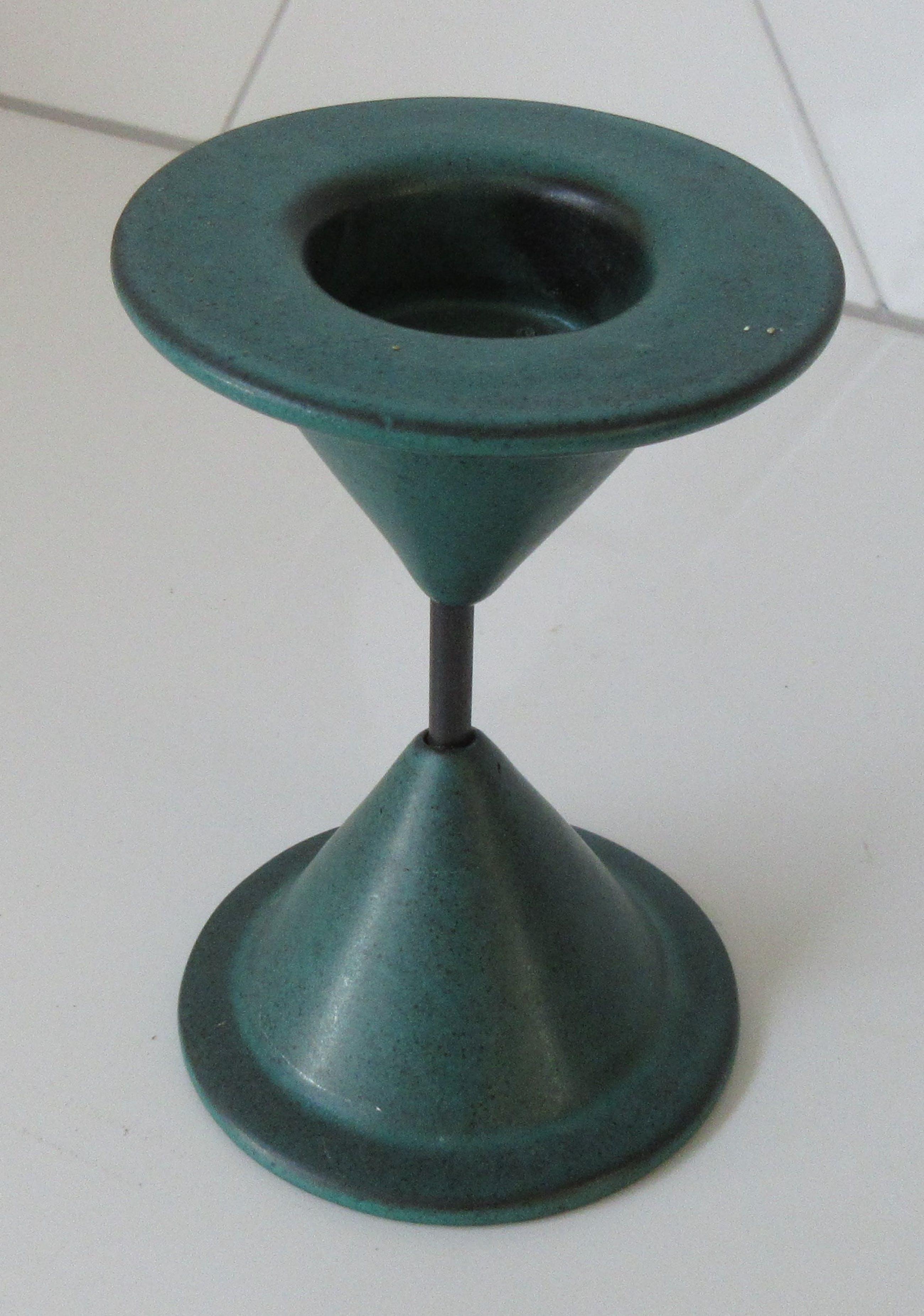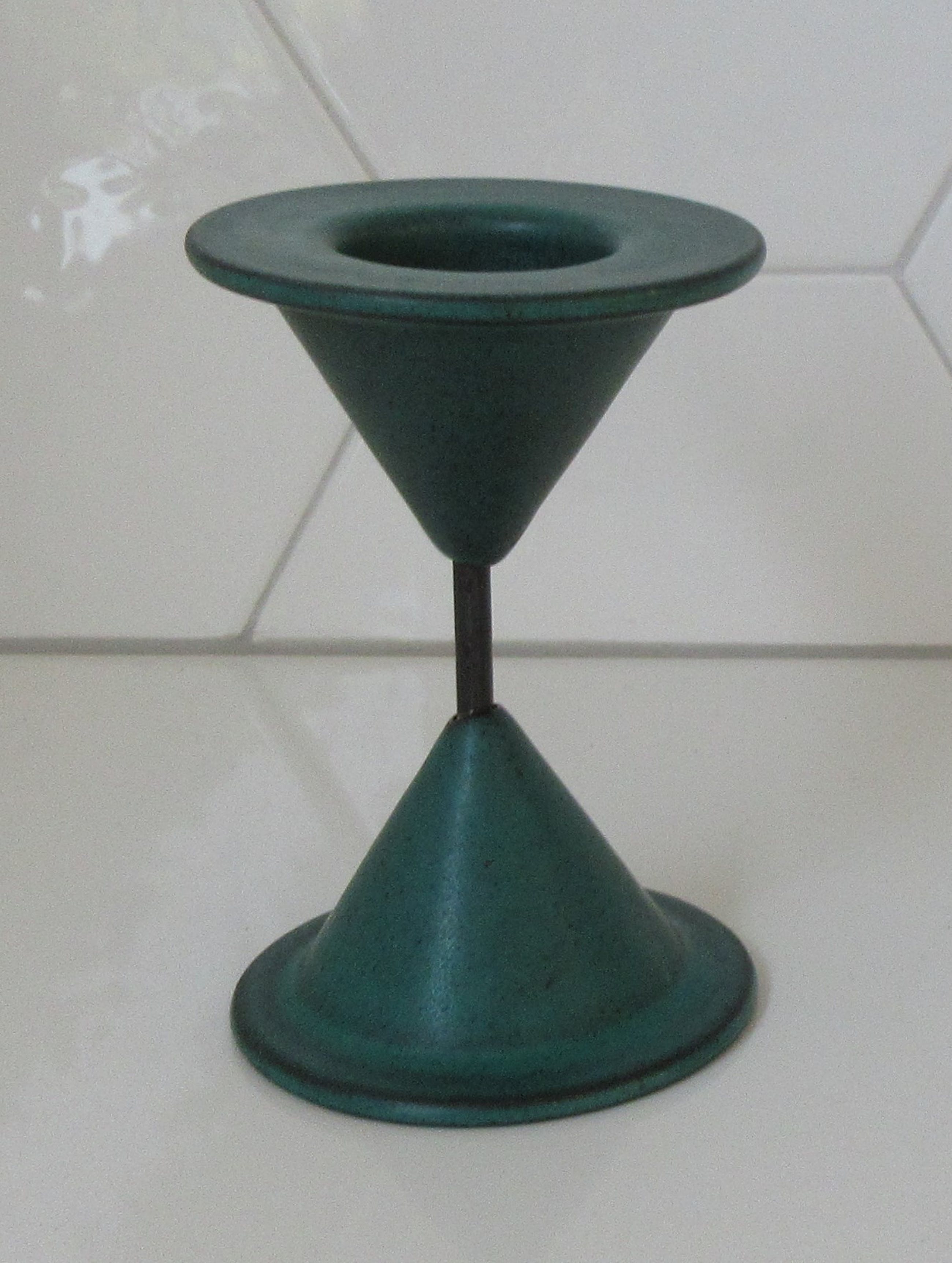 Diabolo kandelaar ontwerp Theo Potmeer en Bart-Jan Reeser in 1991. Uitvoering Cor Unum Den Bosch. De keramische heeft de kleur groen en kan aan twee zijden worden gebruikt, de delen zijn verbonden door een stalen draad.