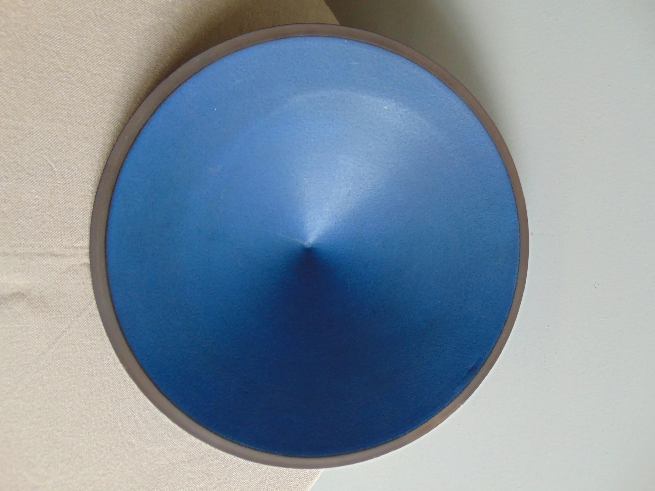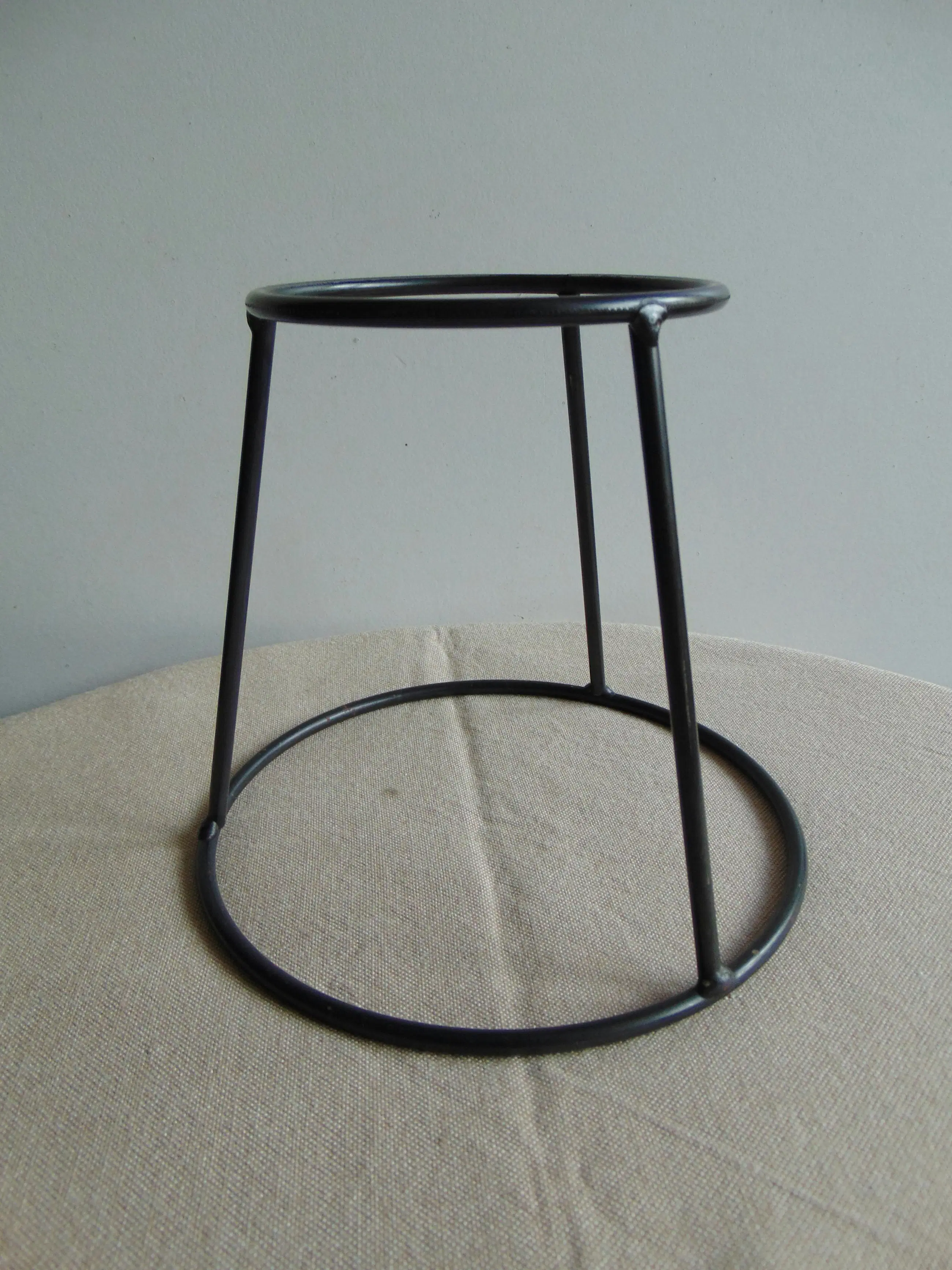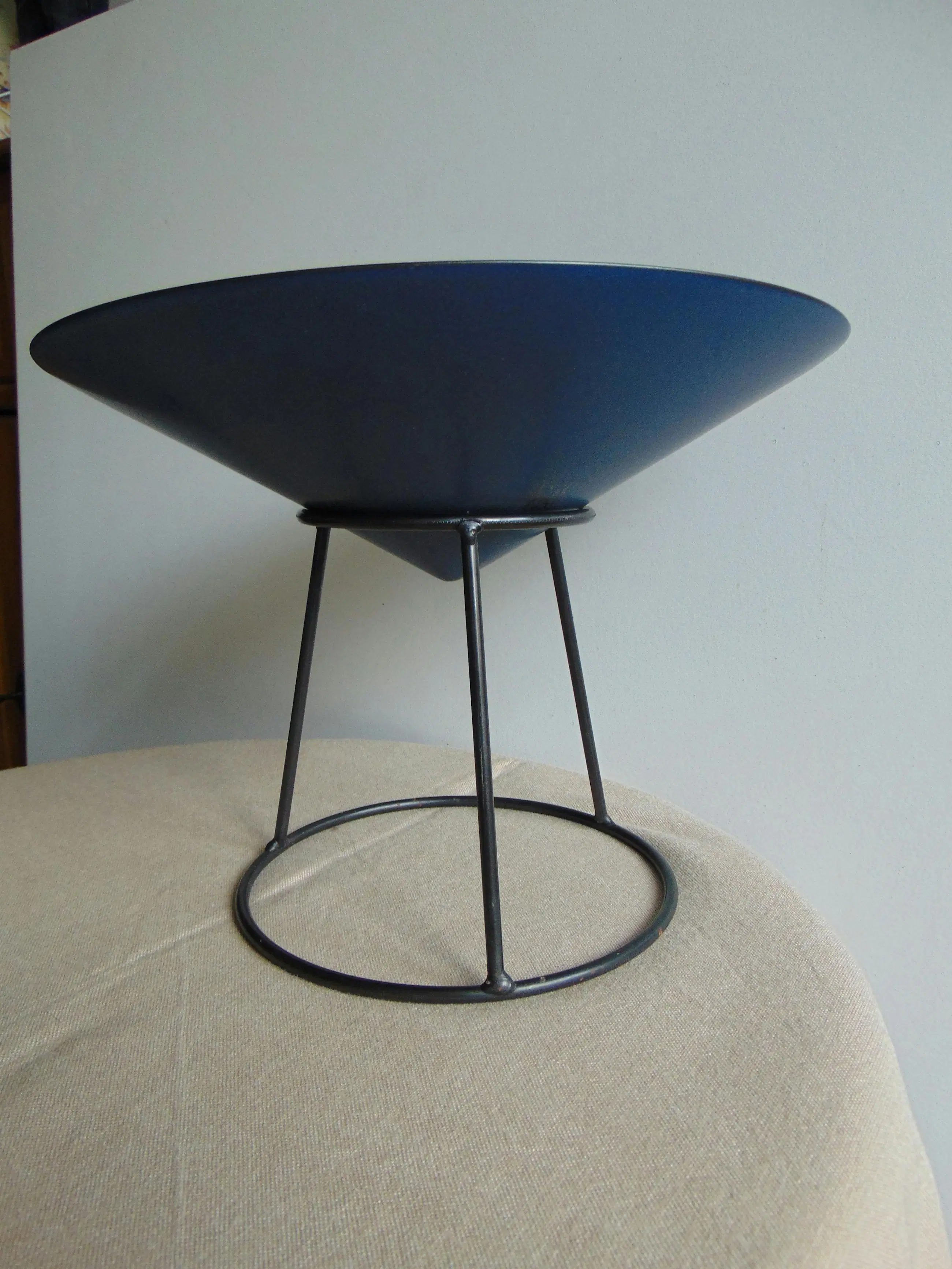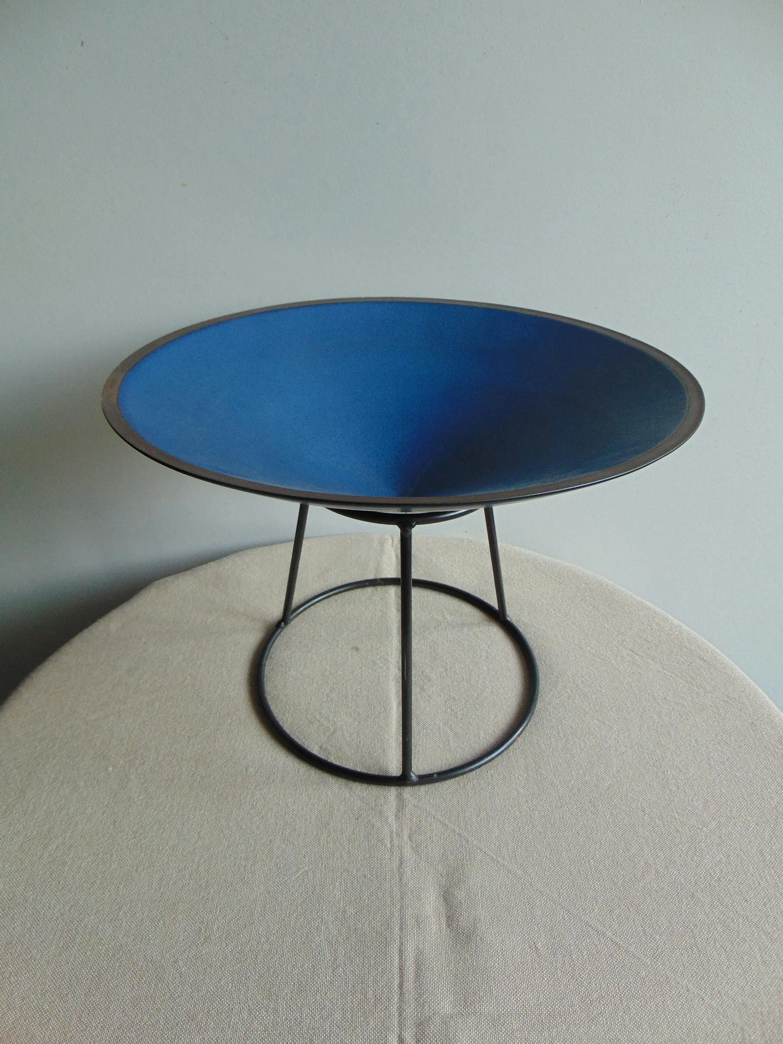 Deze fruitschaal bestaat uit een keramieken schaal en een ijzeren standaard.