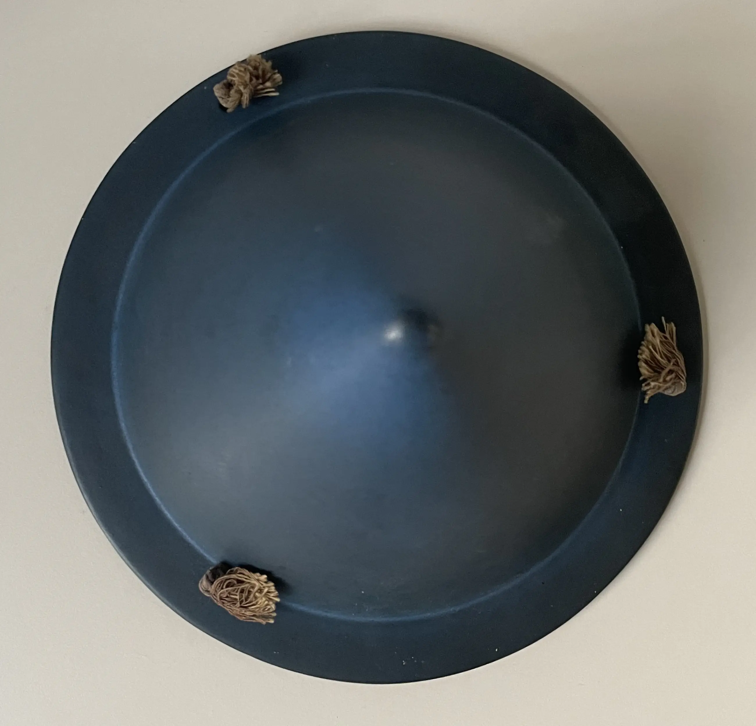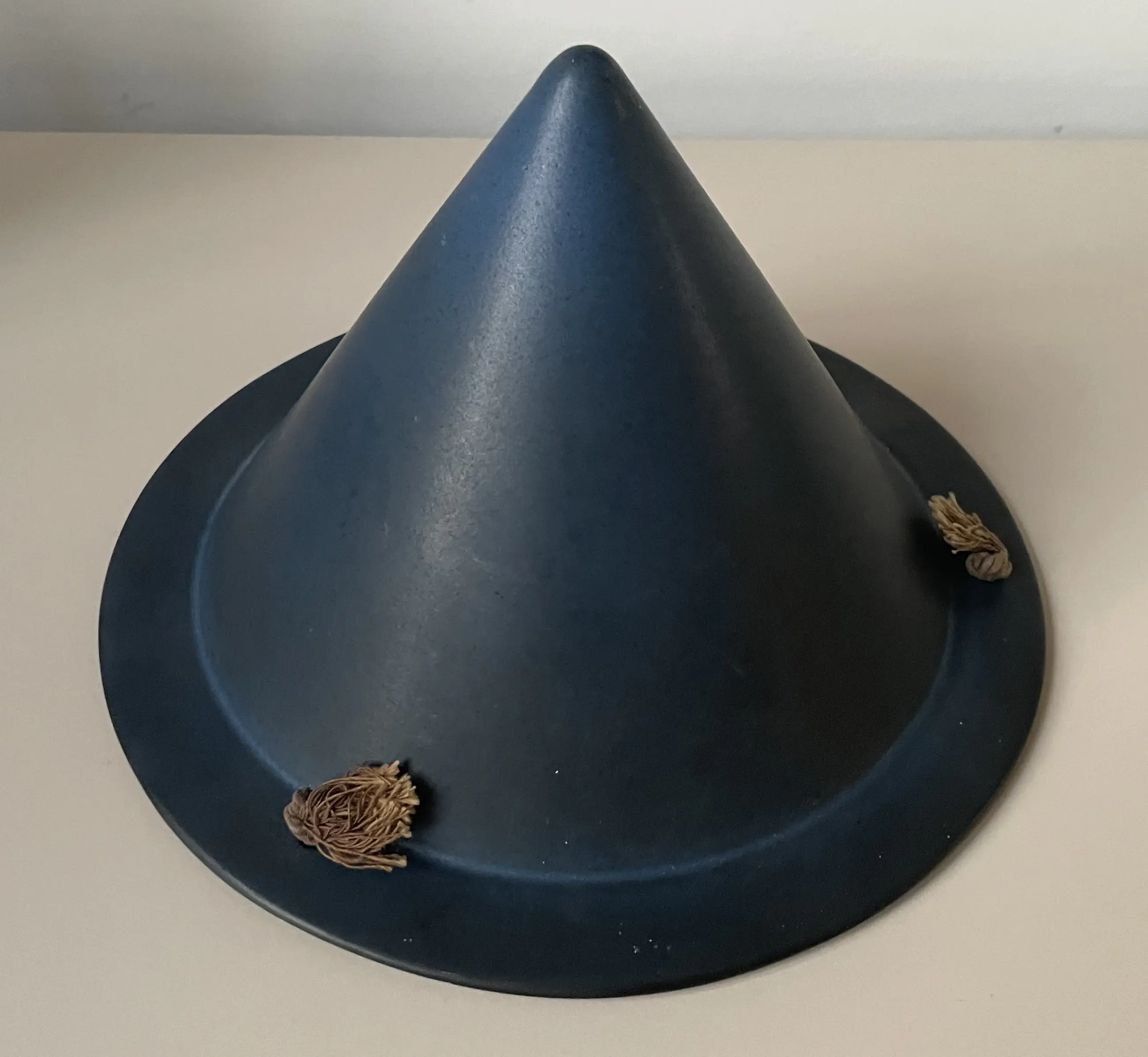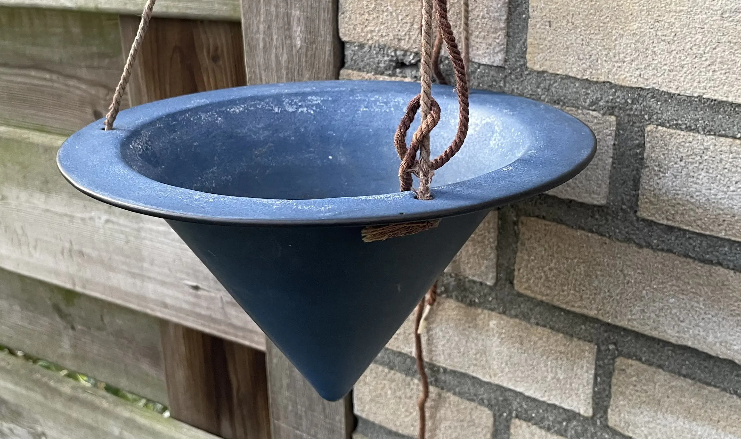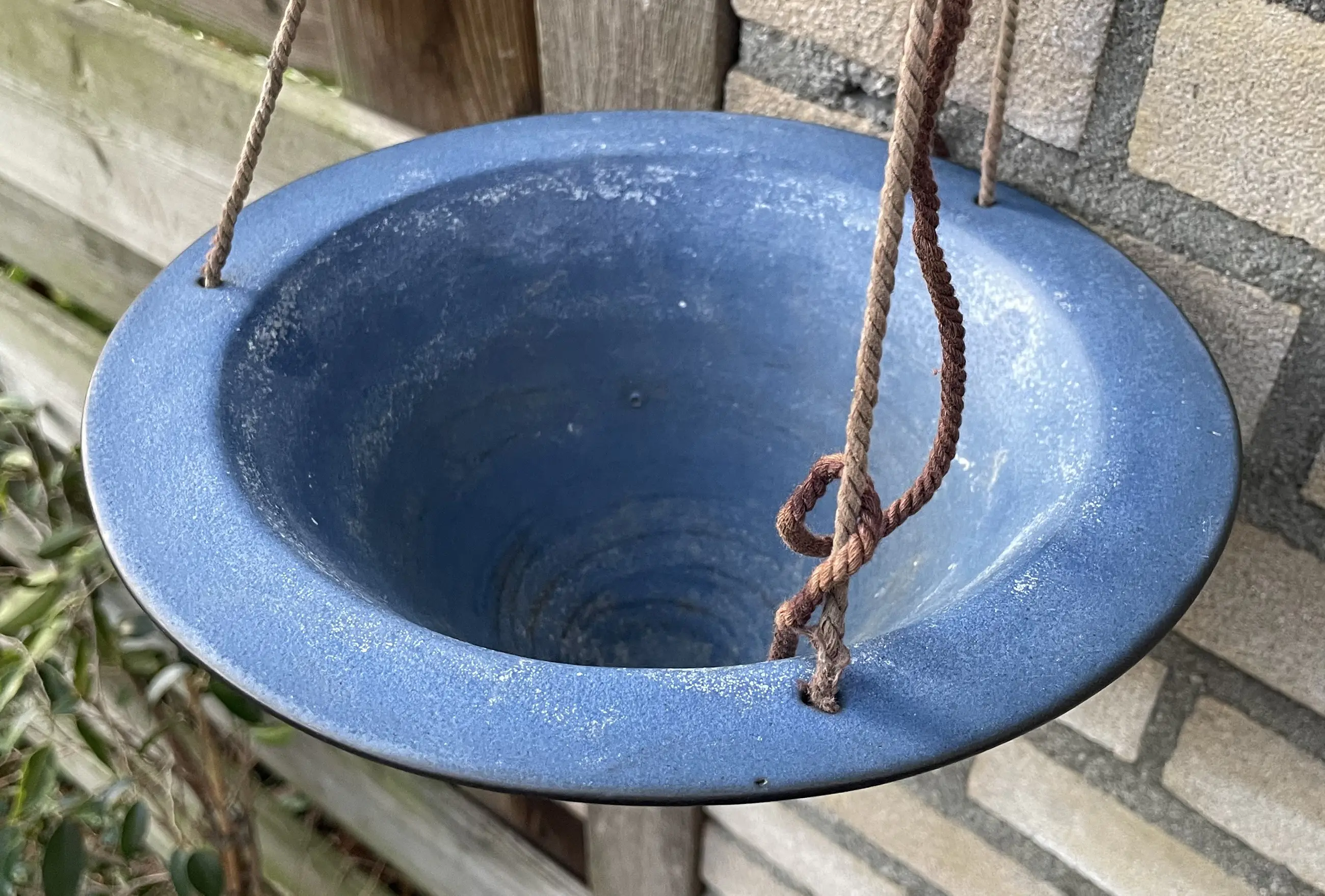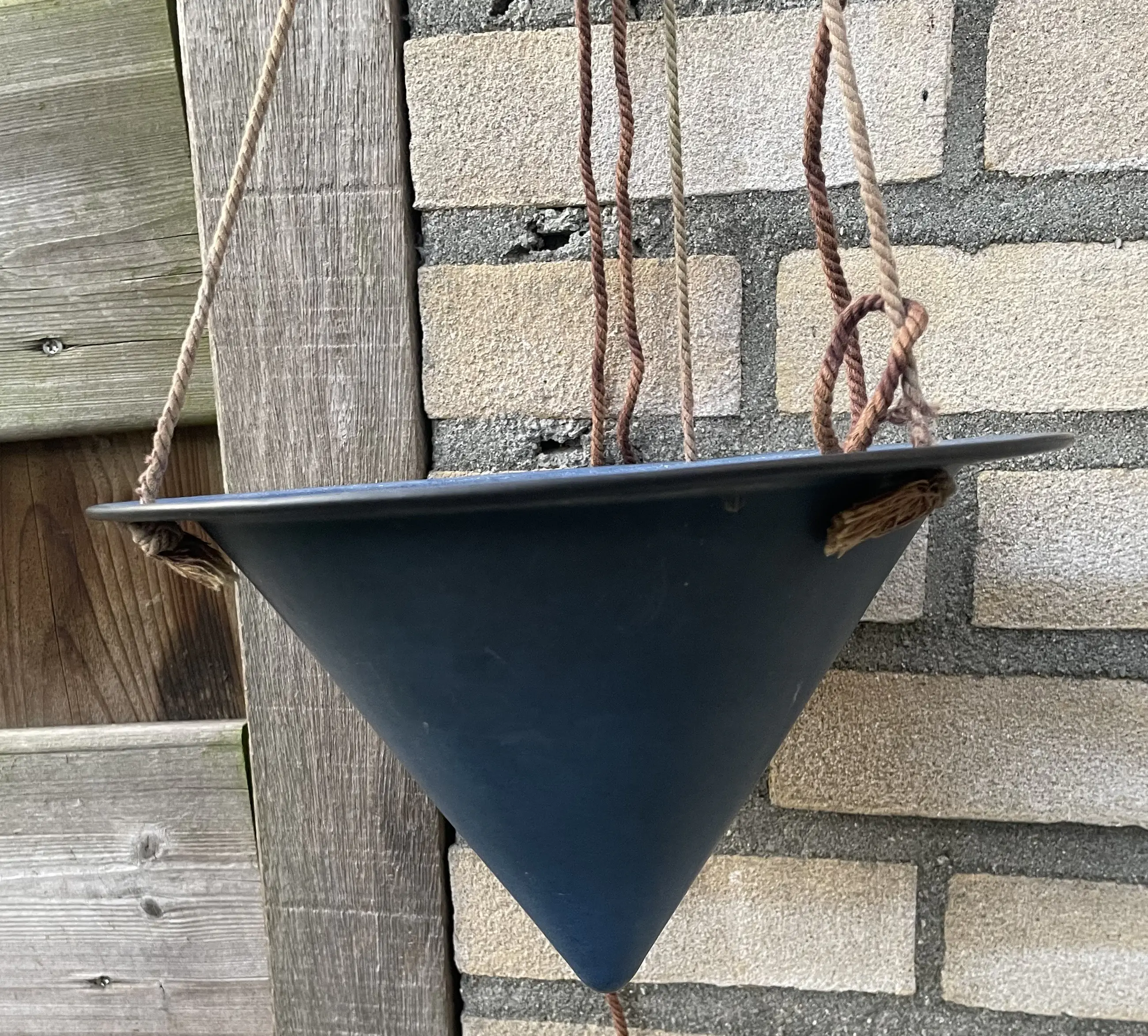 Vintage’90s conisch gevormde blauw aardewerken design plantenhanger ontworpen door Theo Potmeer en Bart-Jan Reese voor Cor Unum keramiek uit Den Bosch. In goede gebruikte staat, geen chips oid maar wel (kalk) aanslag aan de binnenkant ivm gebruik. Niet gemerkt.