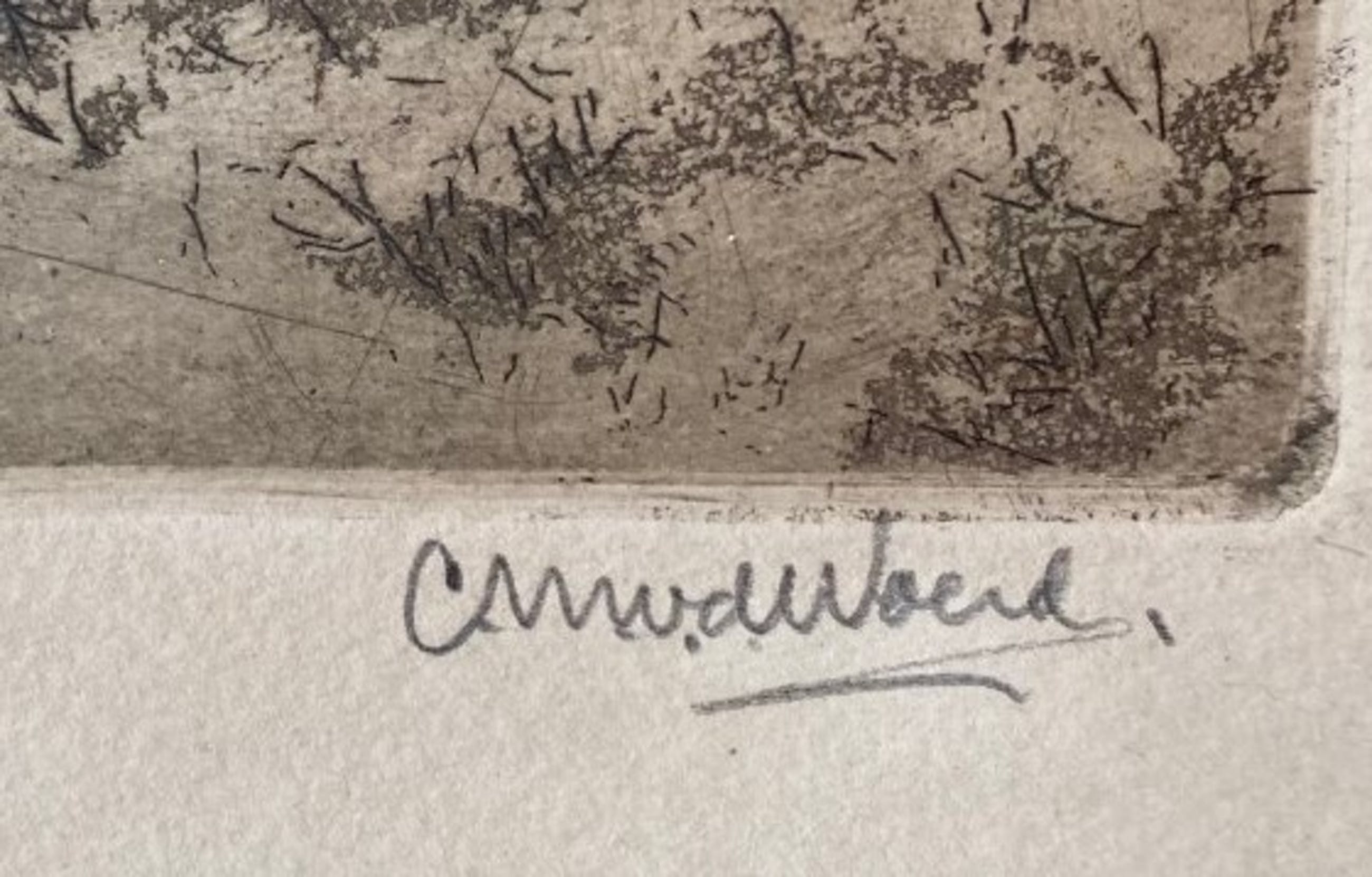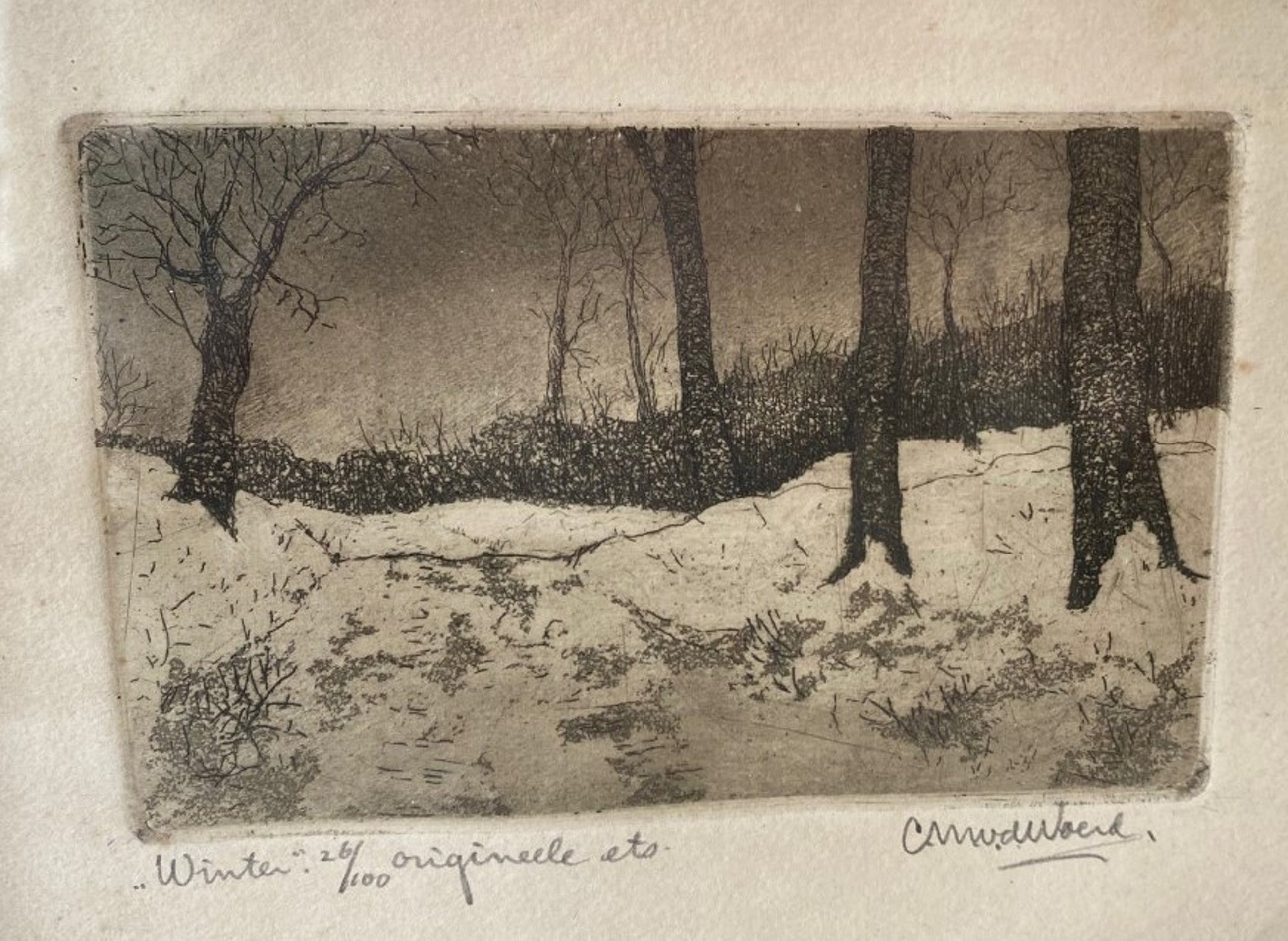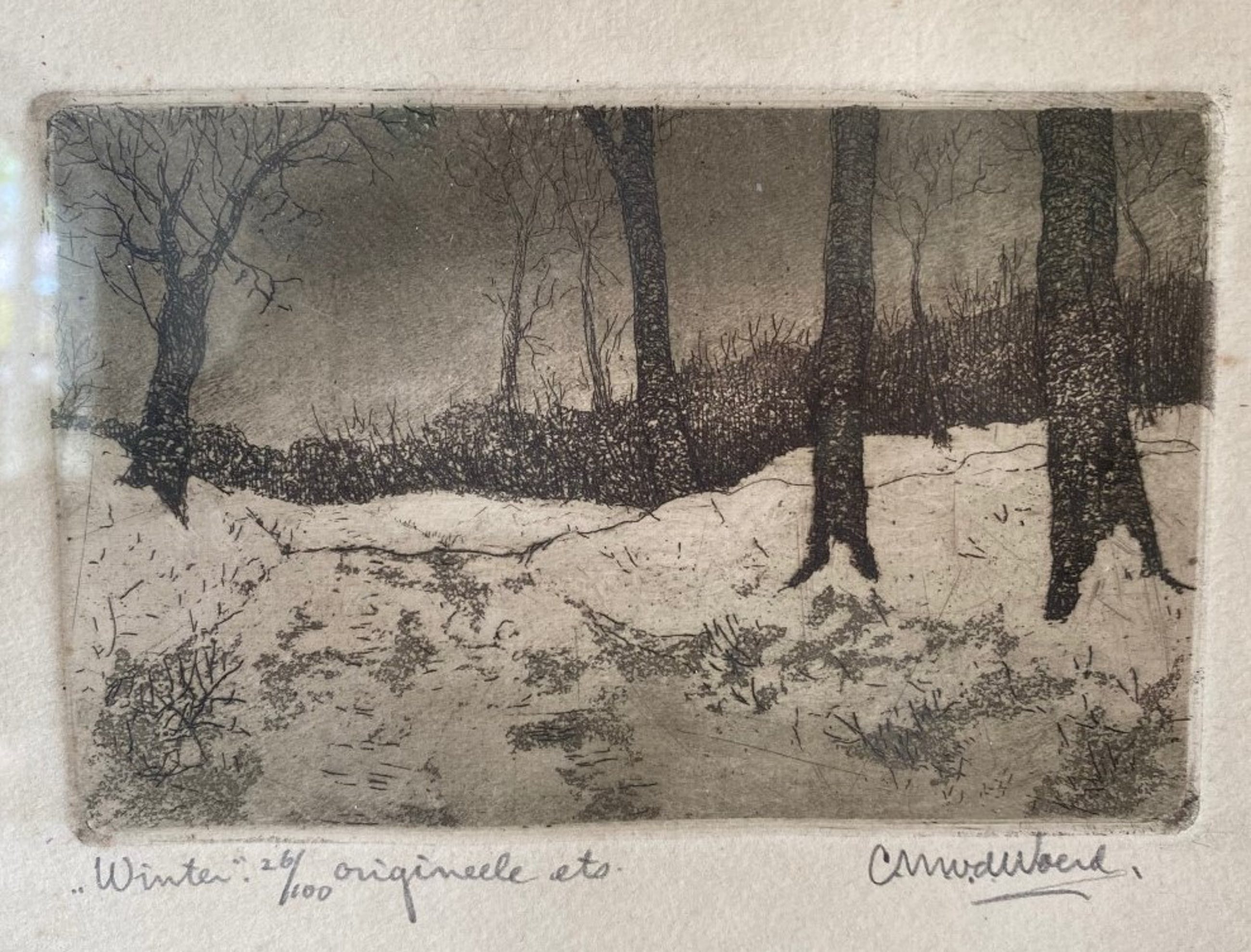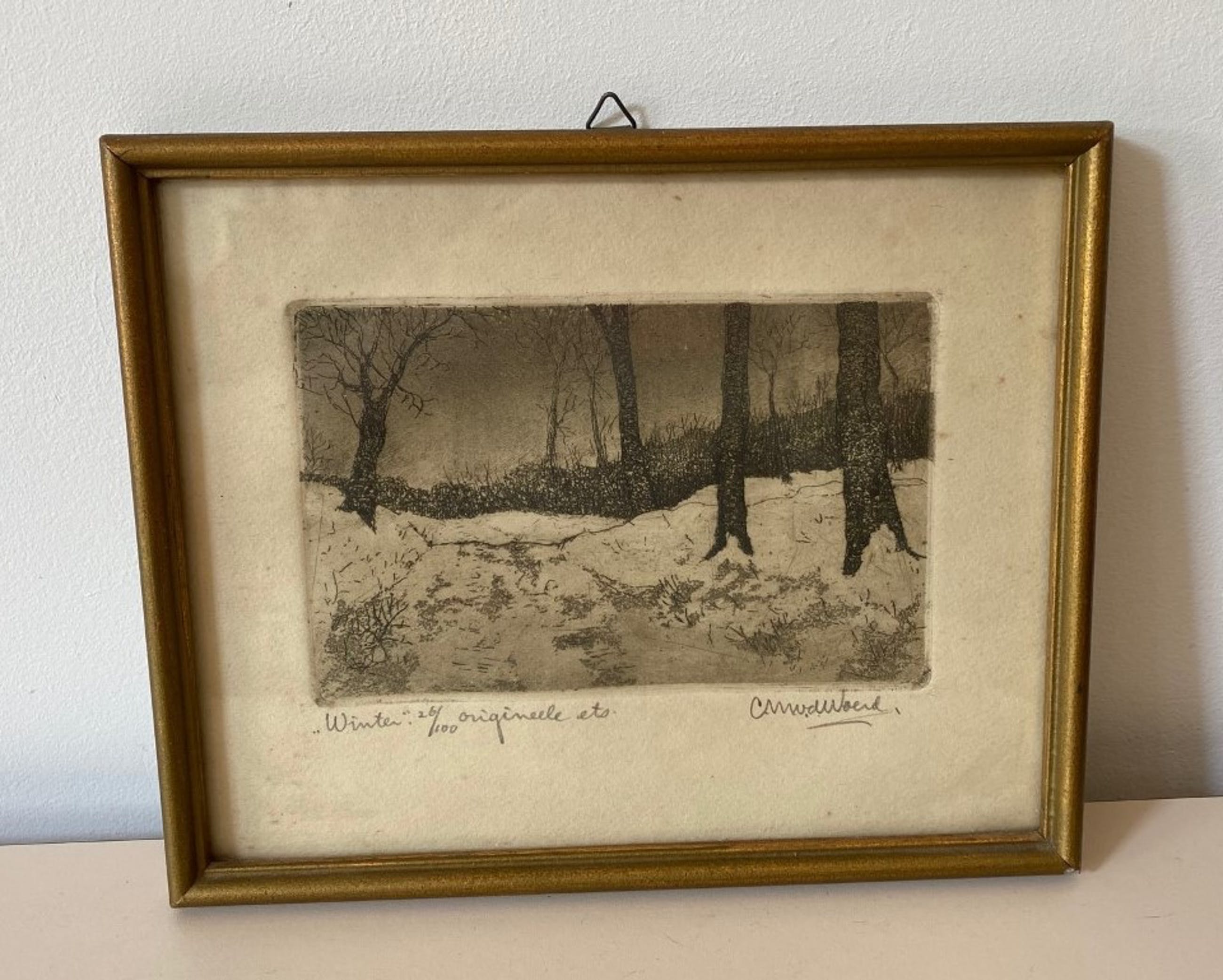 Kleine ets van Cor van der Woerd (1901-1994). Ets is rechtsonder in potlood gesigneerd C.M. vd Woerd in marge. Linksonder staat in potlood " Winter" en 26/100". Op geschept papier. In zeer goede conditie. De lijst is mat verguld en heeft een minimaal chipje rechts onderin.