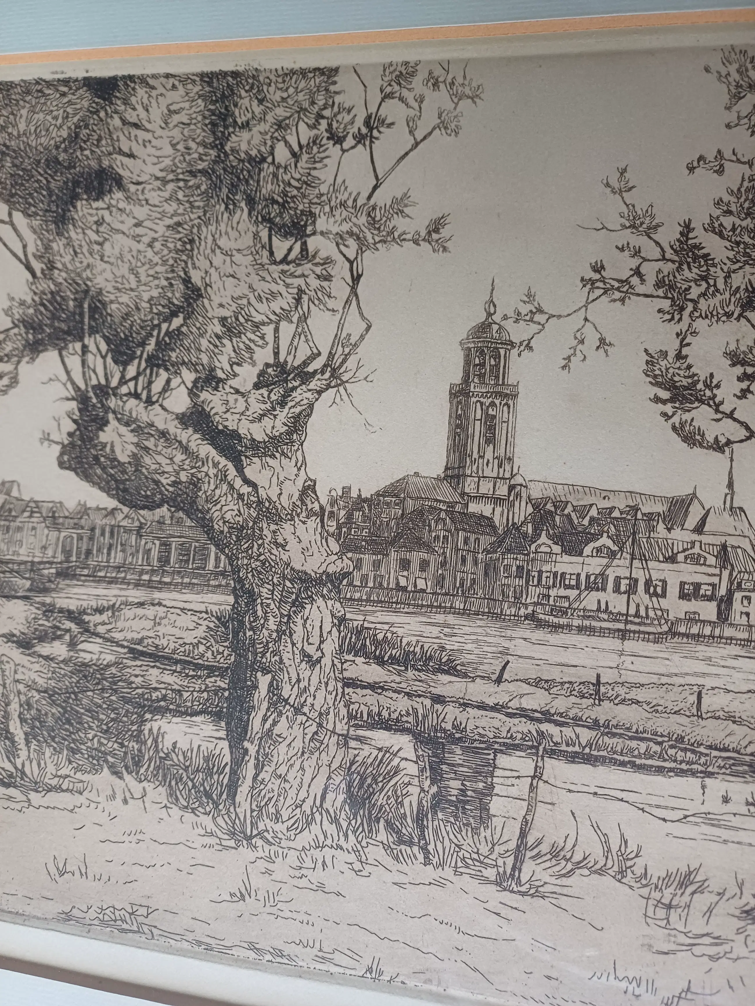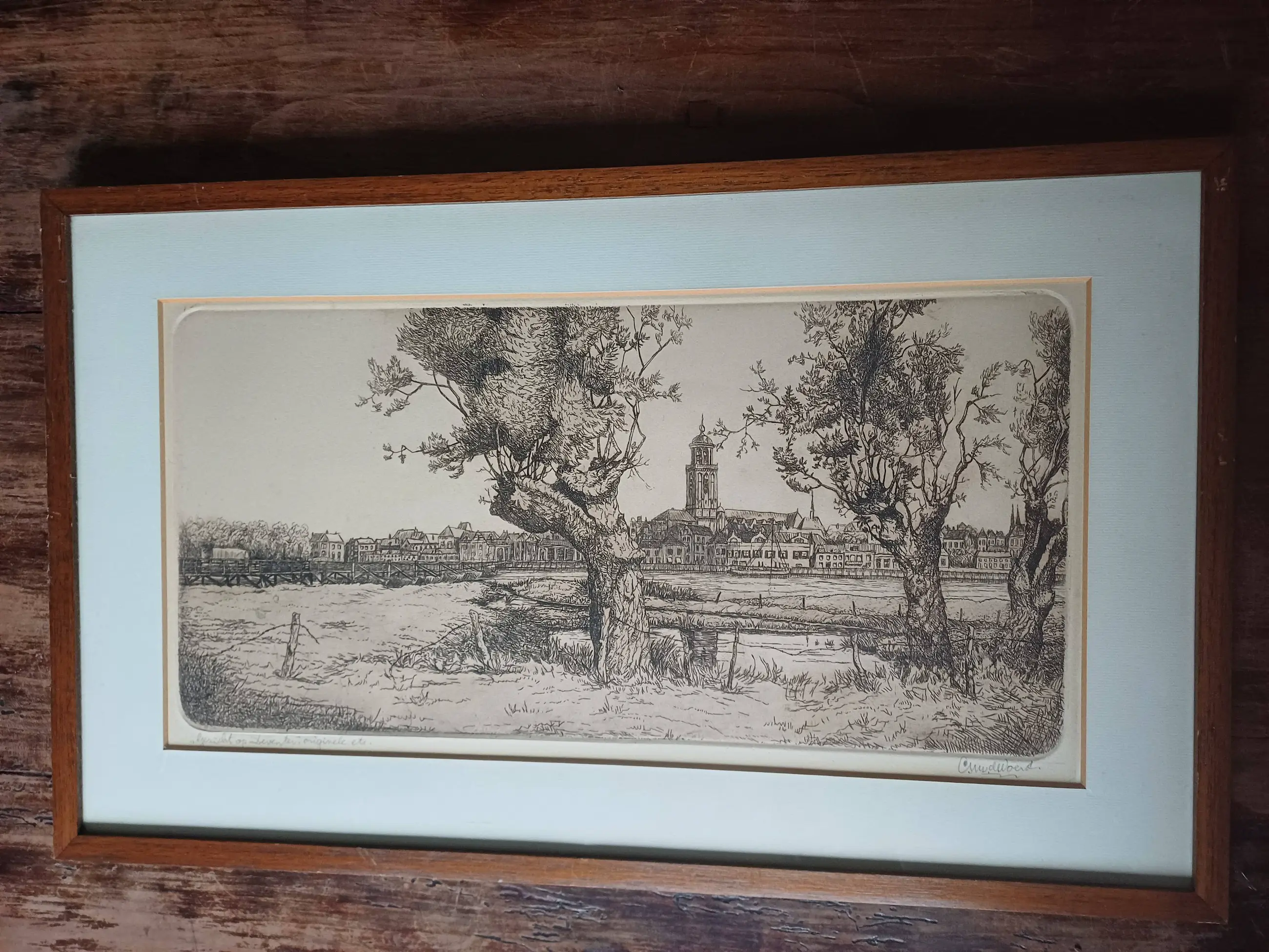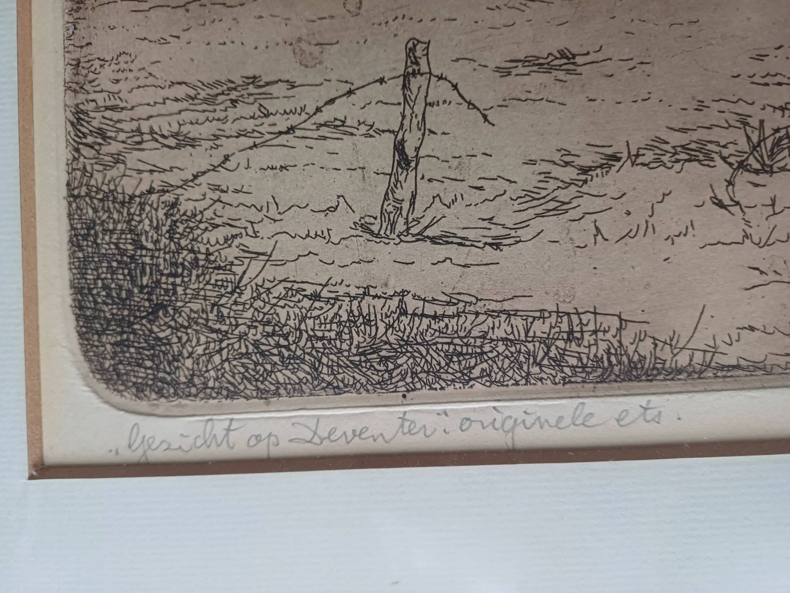 Gezicht op Deventer, met o.a. de Muntentoren. Iets verkleuring van de passe-partout, verder in prima staat. Op de achterkant zit een sticker van Kunsthandel Krooswijk uit Deventer, verder is er een verjaardag wens op geschreven.