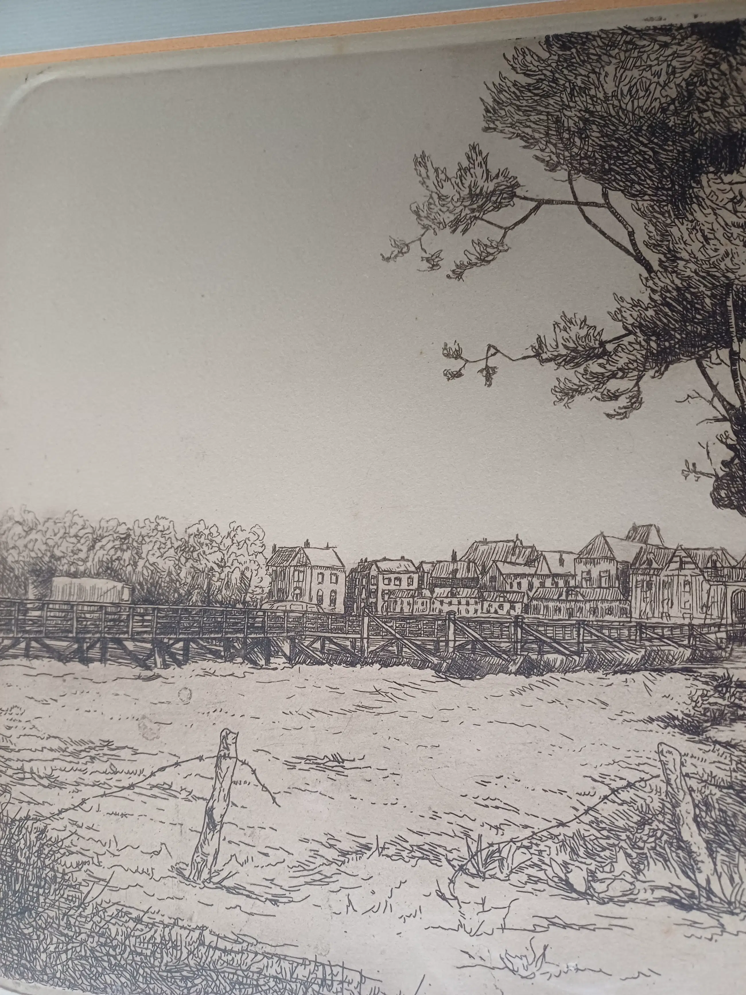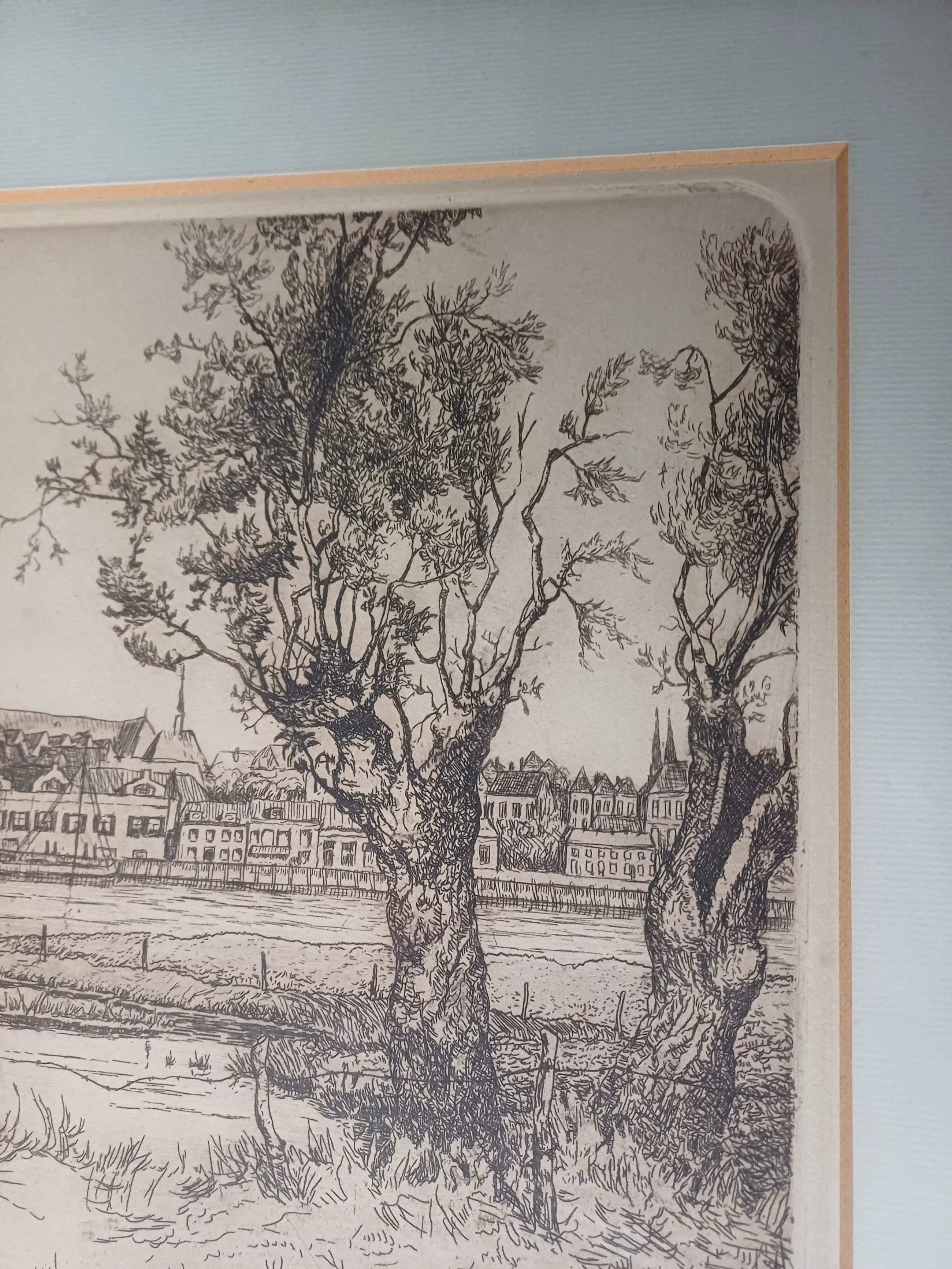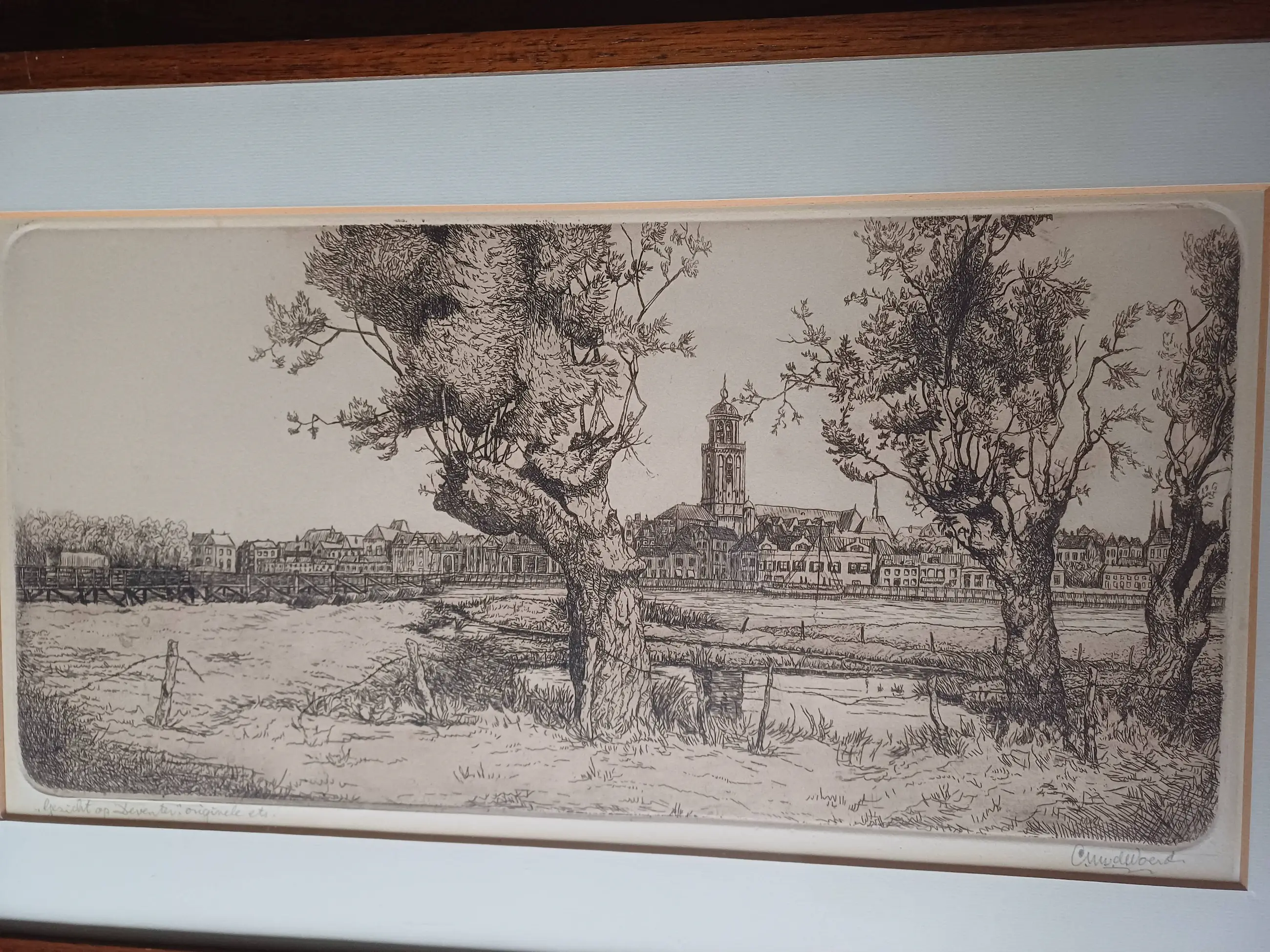 Gezicht op Deventer, met o.a. de Muntentoren. Iets verkleuring van de passe-partout, verder in prima staat. Op de achterkant zit een sticker van Kunsthandel Krooswijk uit Deventer, verder is er een verjaardag wens op geschreven.