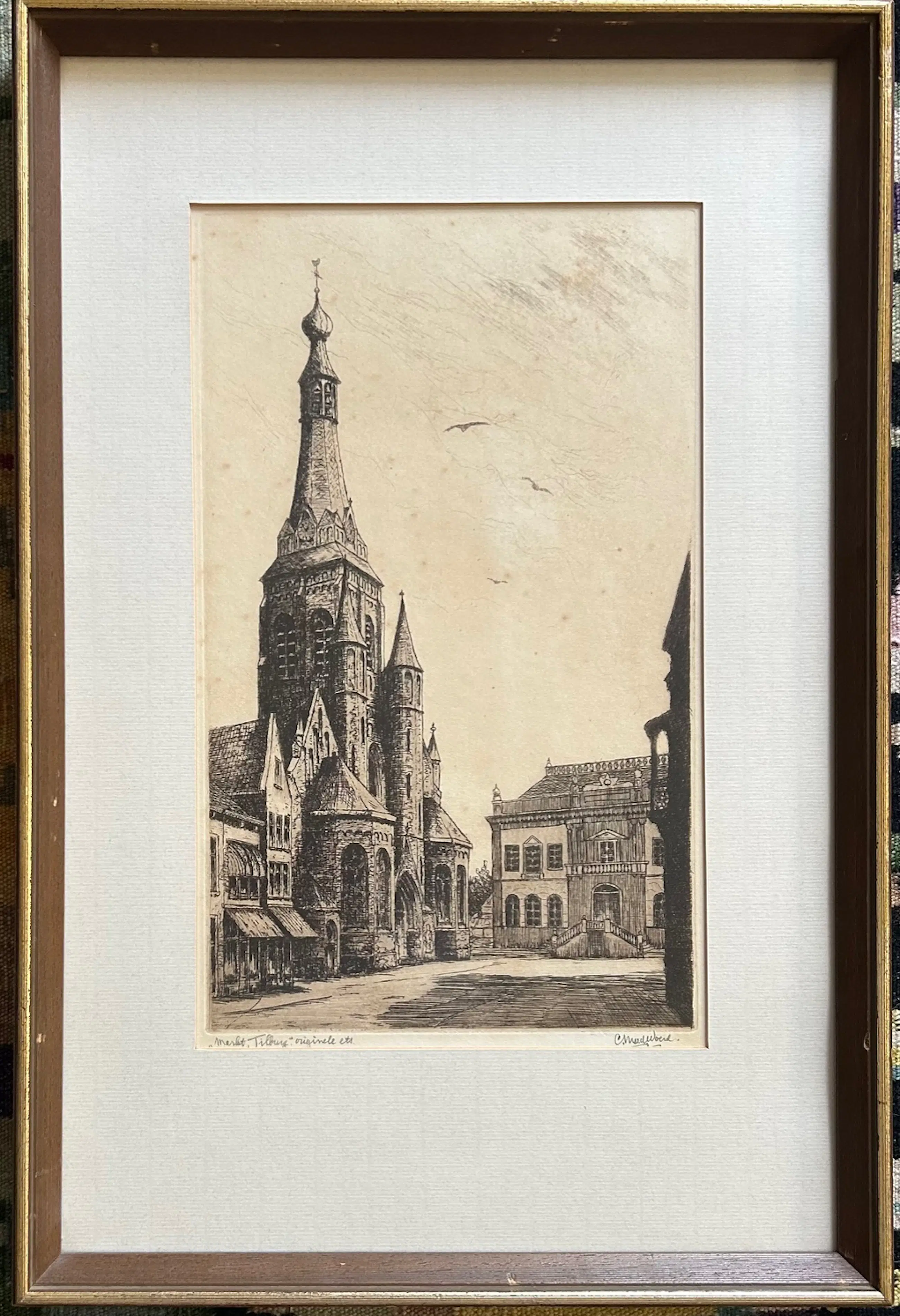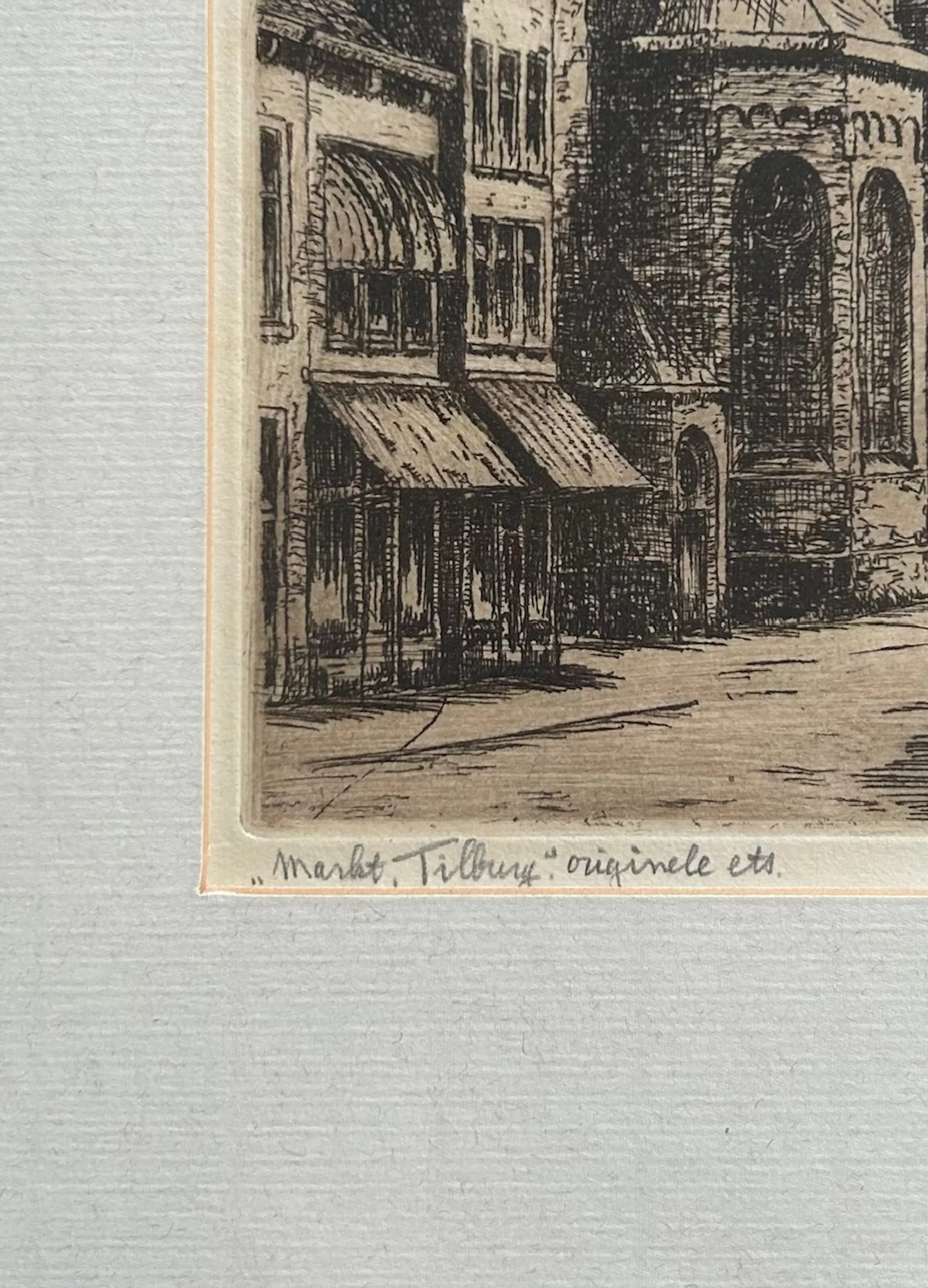 Prachtige originele ets van Cor vd Woerd (1901-1994) voorstellende de markt in Tilburg. Getiteld en gesigneerd in potlood. Mooie lijst. Kan zo aan de muur. Zie foto's.