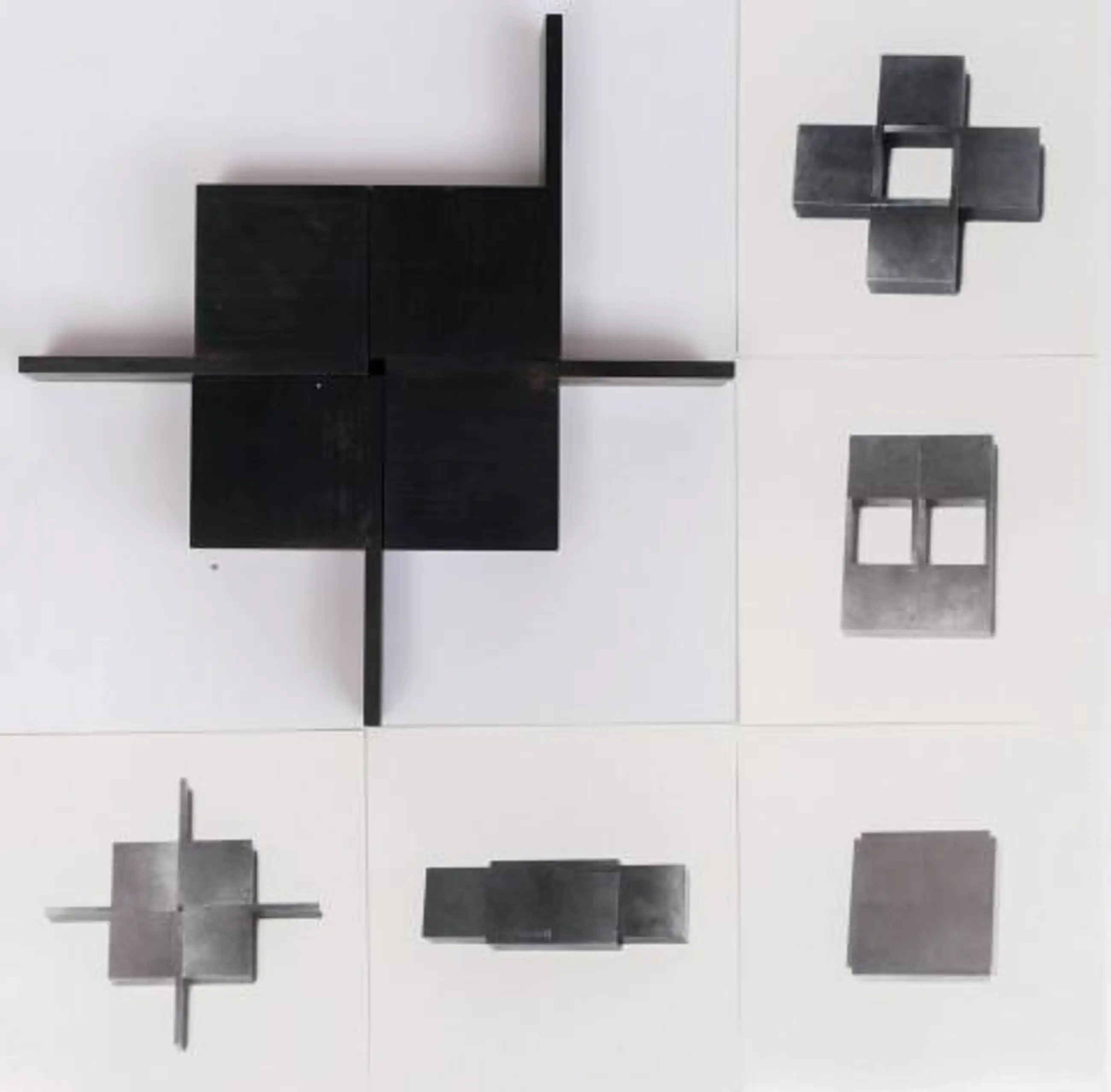 Stalen object, bestaande uit 4 delen-van Cor van Dijk. Chemisch gezwart. Zonder titel. Oplage: 97/400. Afmetingen beeld: H8 x b4.2 x d2cm. Het werk is gemonogrammeerd 'CvD' (op een van de blokken). De authenticiteit van het aangeboden werk kan, op aanvraag, worden gemaild. Een certificaat van echtheid kan, op aanvraag, worden gemaild.