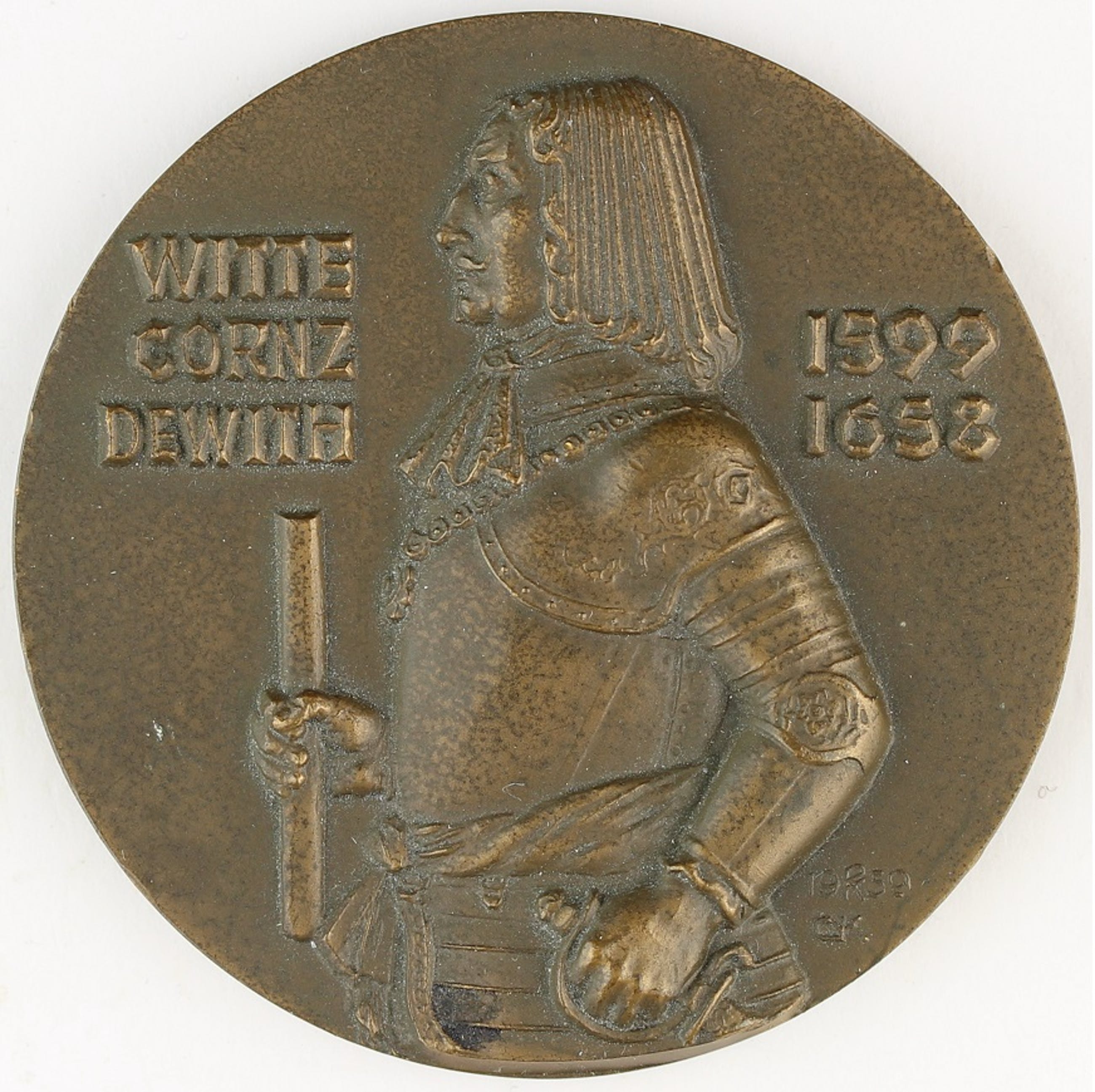 De Rotterdamse beeldhouwer Van Kralingen ontwierp de laatste echt antiquiserende slagpenning voor de Vereniging; een onderwerp dat eerder bij de jaren '30 hoort dan bij de jaren '60. De Zuidhollandse zeeheld Witte Cornelisz. de With, 300 jaar geleden overleden, was werkzaam onder Tromp, maar is na diens dood geen opperbevelhebber geworden. Van Kralingen heeft hem met harnas in vol ornaat in profiel uitgebeeld; de steile ongewassen haren zijn opvallend; de handen en kop komen goed uit. De keerzijde geeft een panoramische impressie van een zeeslag: zes grote schepen en vijf kleine tot zeer kleine in een los verband geschikt met een zeer schematische weergave van de zee die alles zou moeten en kunnen verbinden. De penning is in nauwe samenwerking met de Rotterdamse Kunststichting tot stand gekomen. #Louk Tilanus, Handzame Sculptuur #Louk Tilanus, Handzame Sculptuur