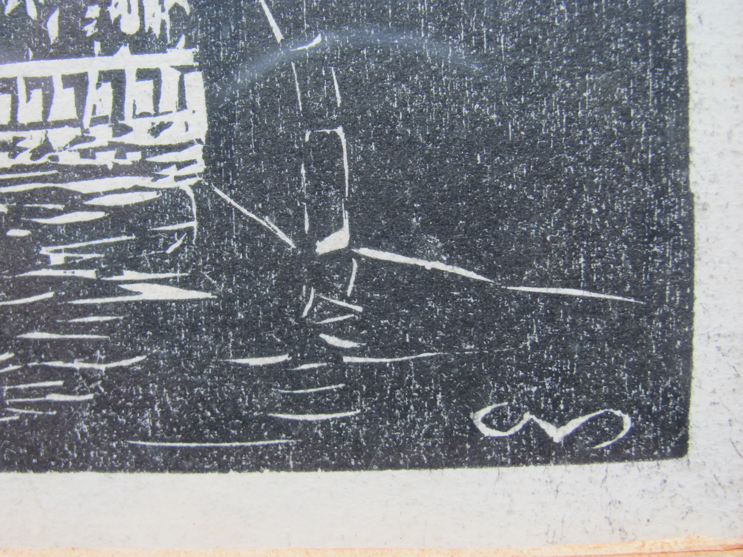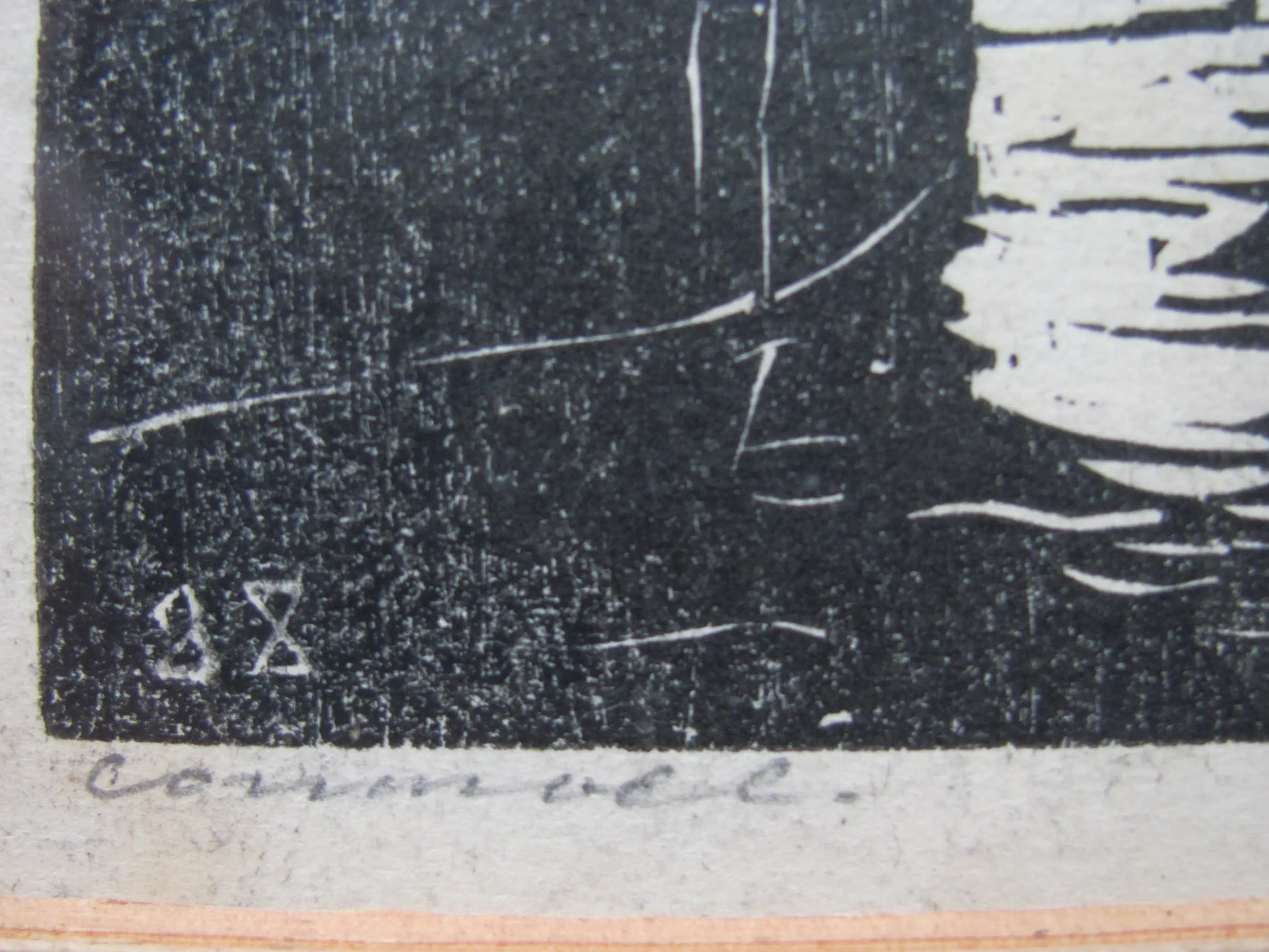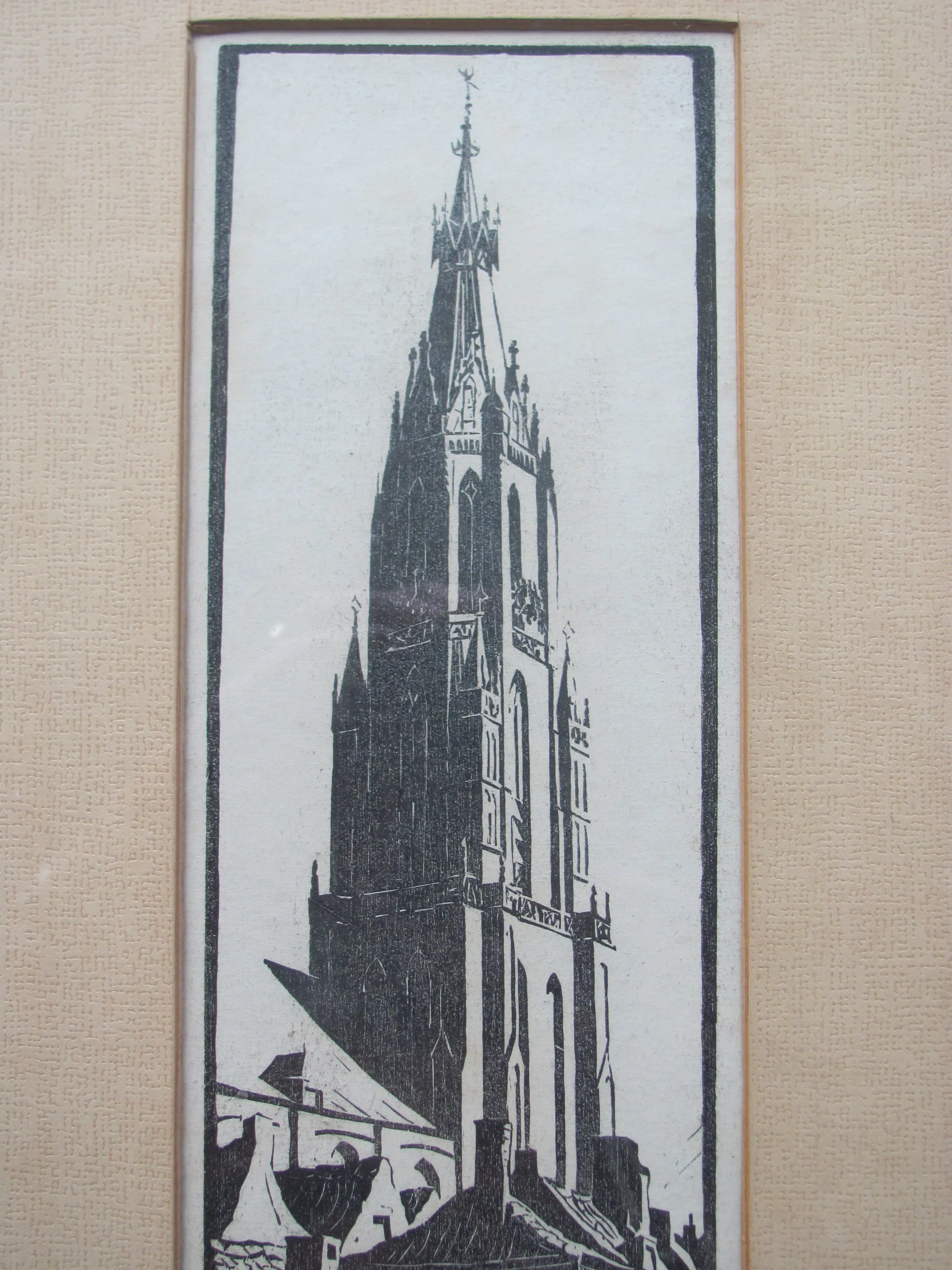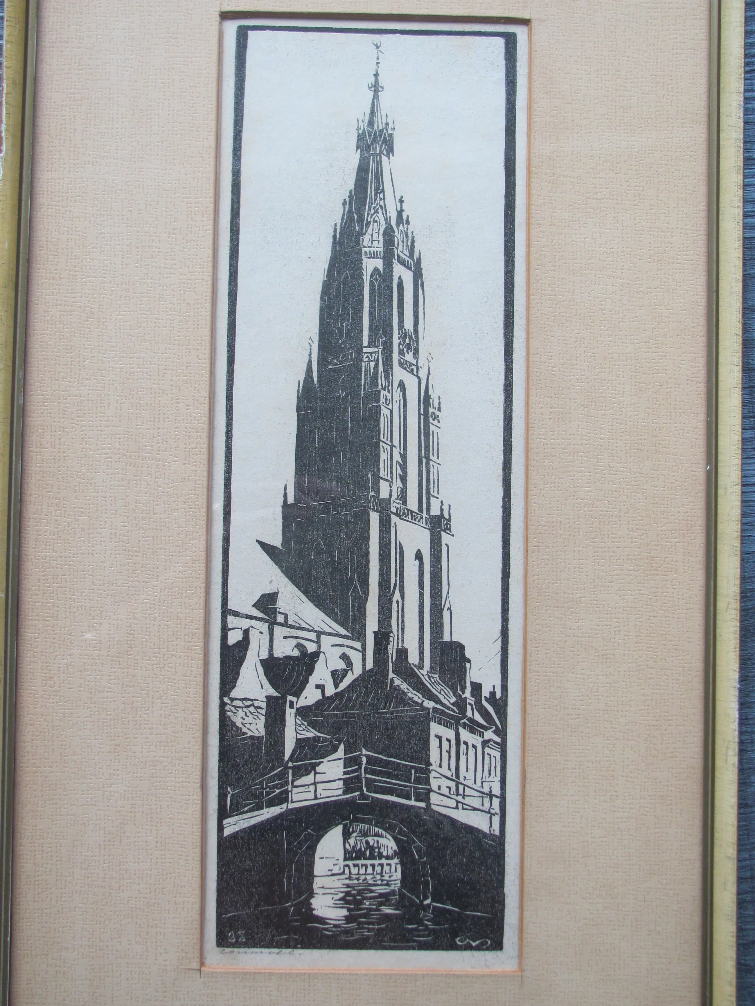 Houtsnede van Cor van Oel (1899-1979) uit 1938 van de Nieuwe kerk in Delft. Linksonder met potlood gesigneerd en gedateerd in de plaat. Rechtsonder ook nog zijn monogram in de plaat.