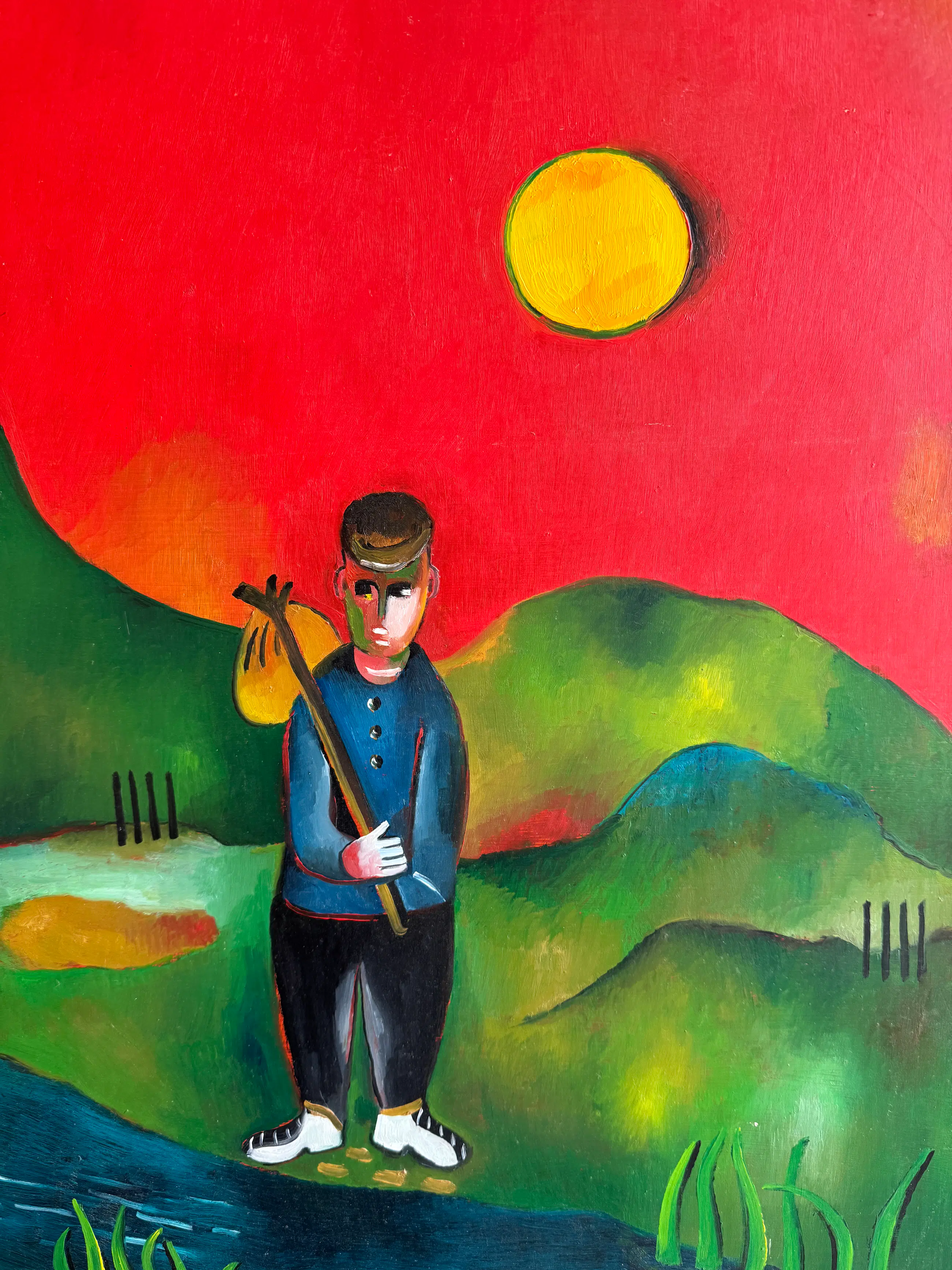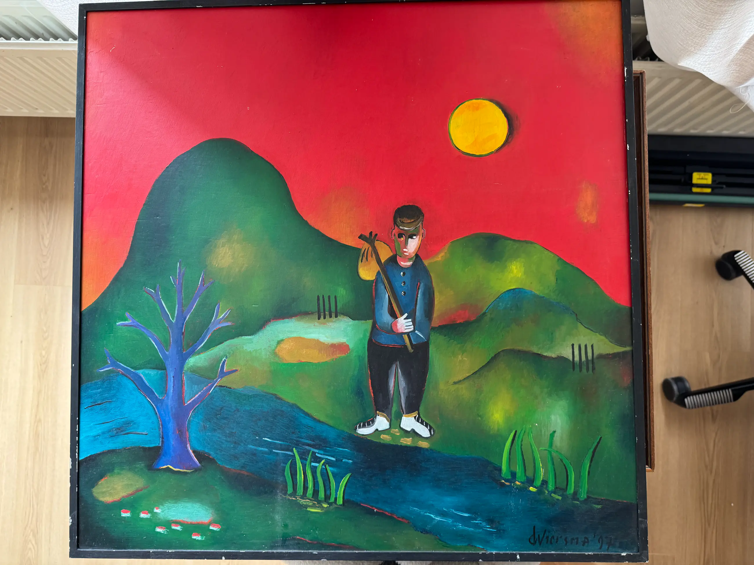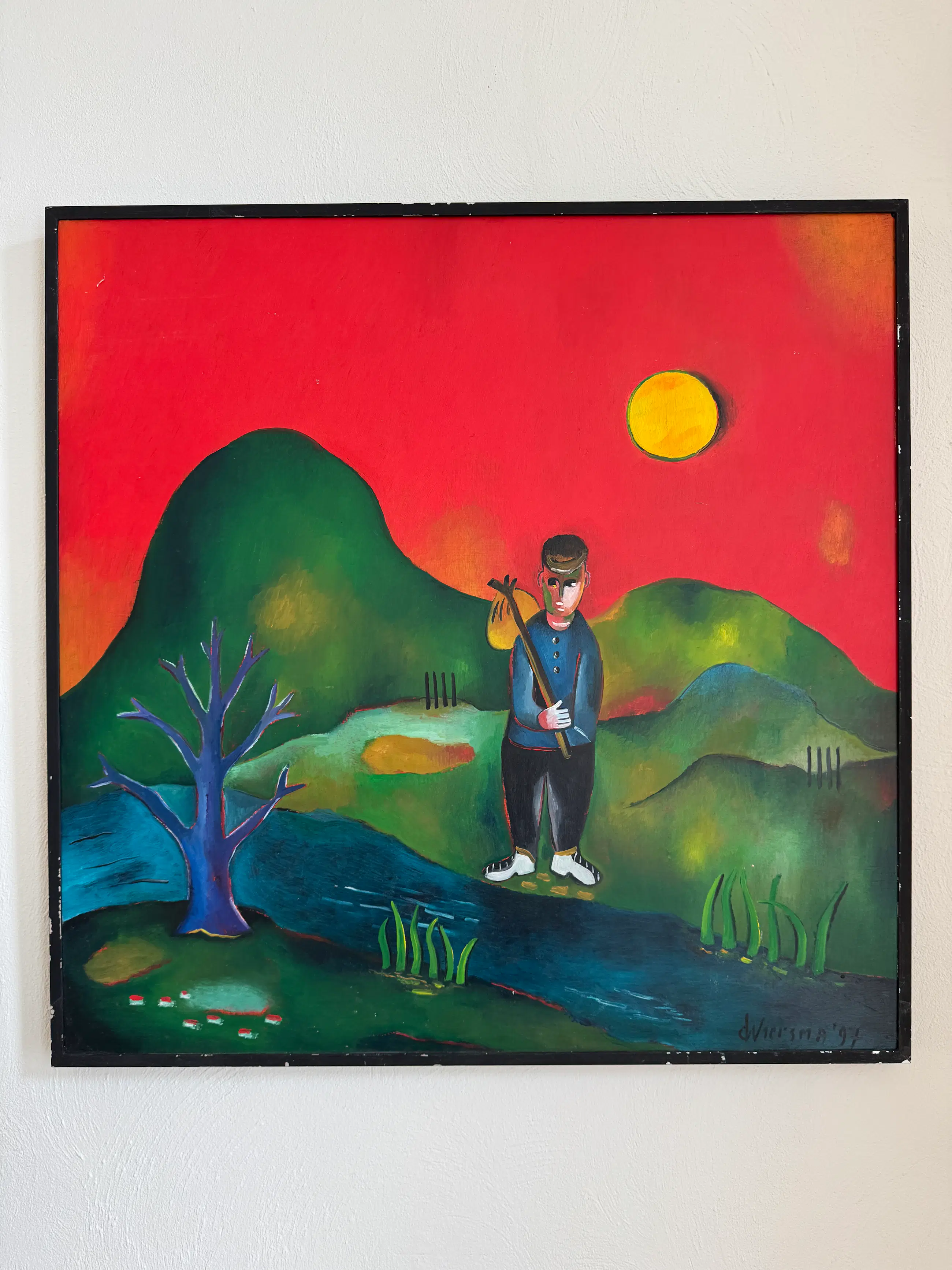 Het werk trekt direct de aandacht door de warme, rood/oranje achtergrond en de krachtige, vereenvoudigde vormen. In de compositie is een wandelende figuur met knapzak te herkennen, afgebeeld in een gestileerd landschap met een opvallende zon. Deze combinatie geeft het schilderij een verhalend en bijna poëtisch karakter.