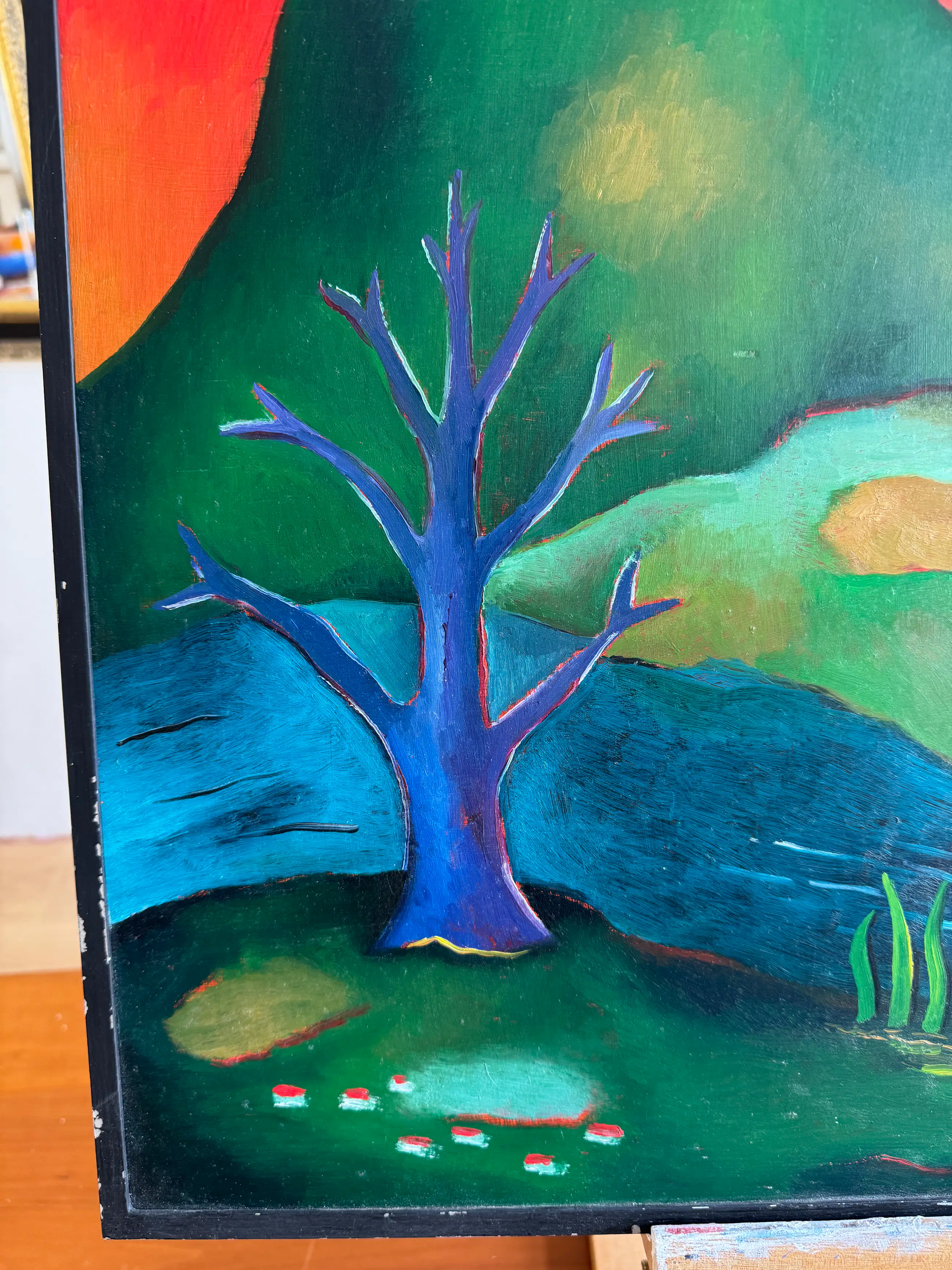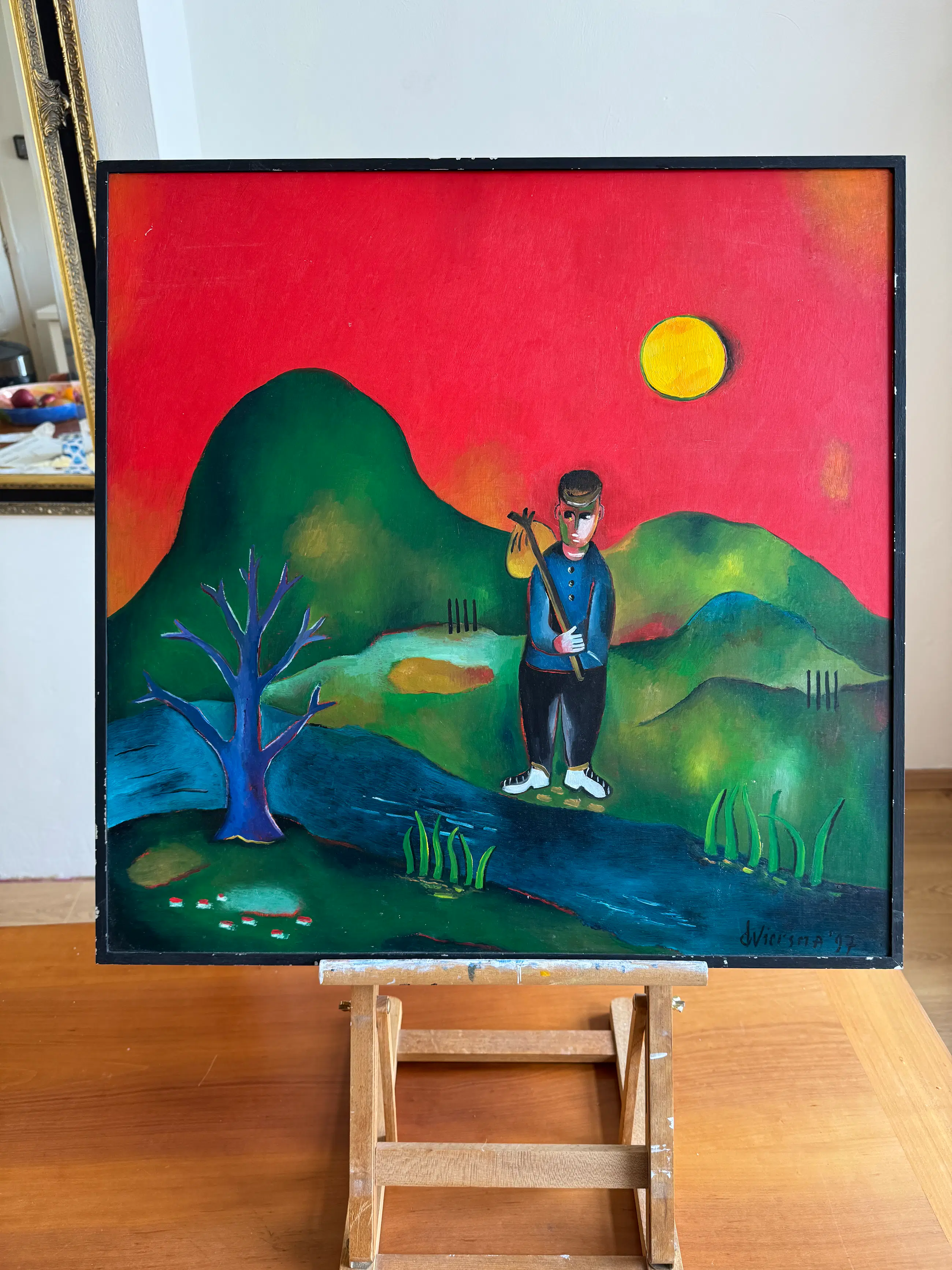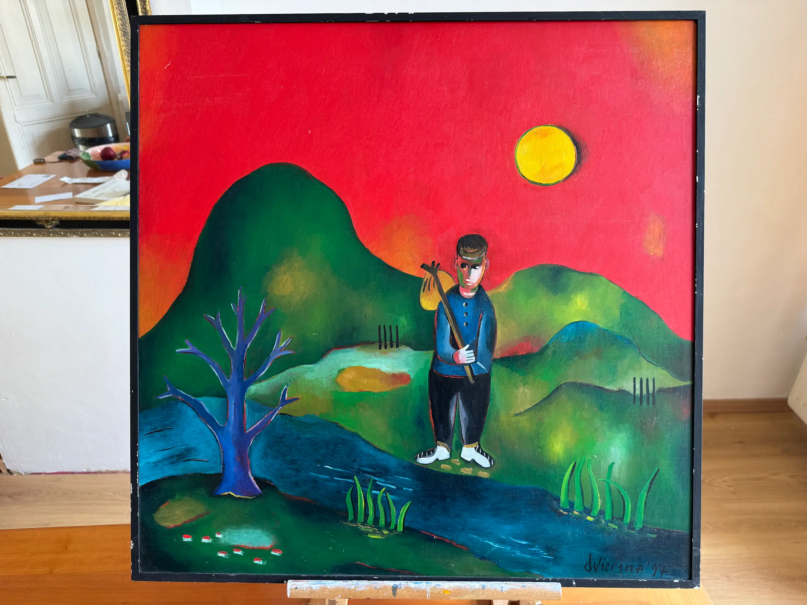 Het werk trekt direct de aandacht door de warme, rood/oranje achtergrond en de krachtige, vereenvoudigde vormen. In de compositie is een wandelende figuur met knapzak te herkennen, afgebeeld in een gestileerd landschap met een opvallende zon. Deze combinatie geeft het schilderij een verhalend en bijna poëtisch karakter.