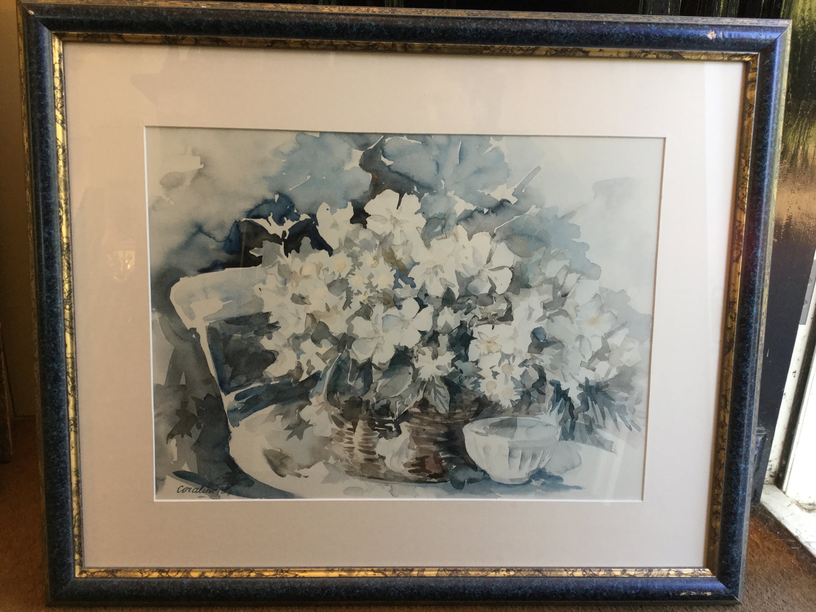 Coraline, stilleven met bloemen en kommetje, aquarel, linkonder gesigneerd en gedateerd 1987, beeldmaat 40x53, lijstmaat 64x78.