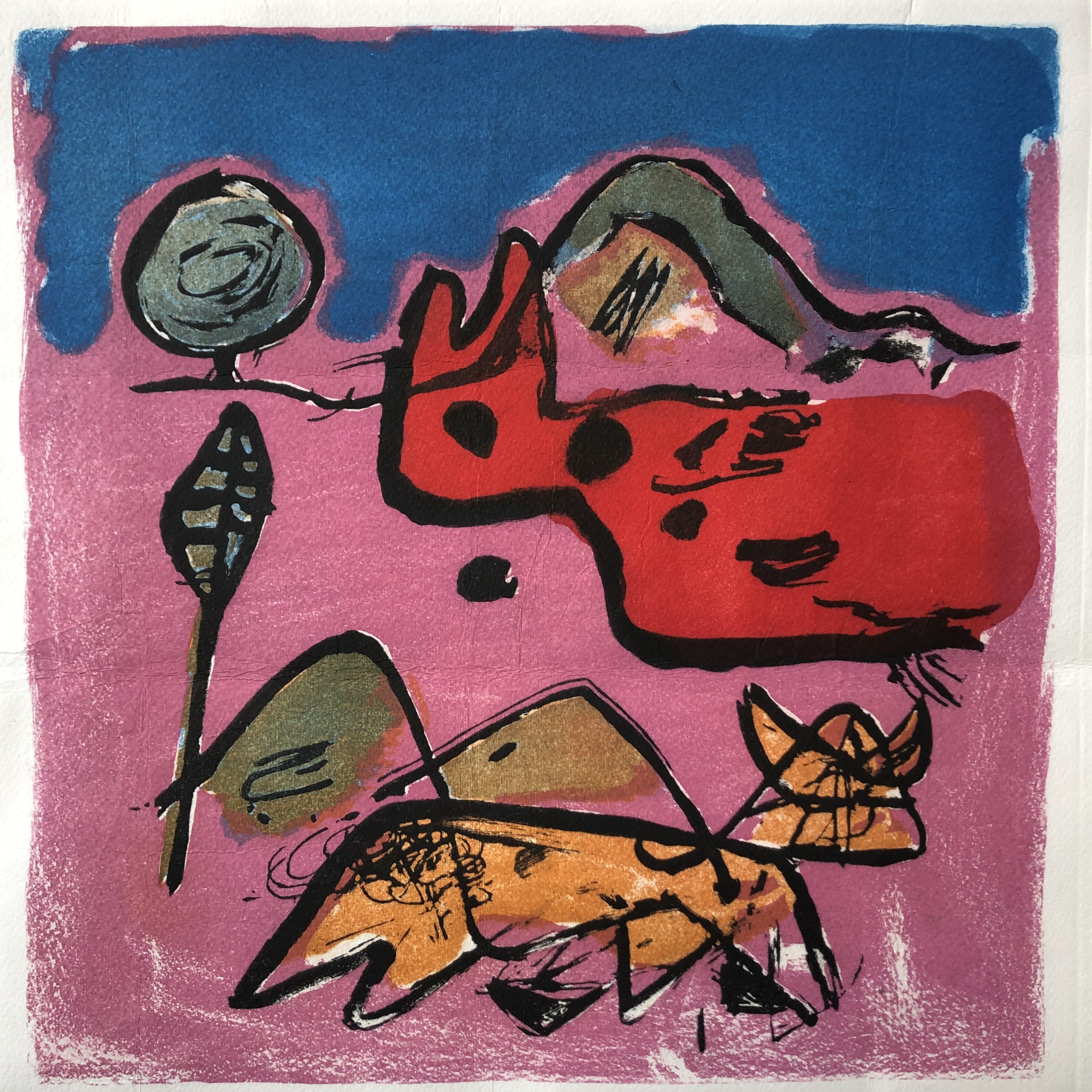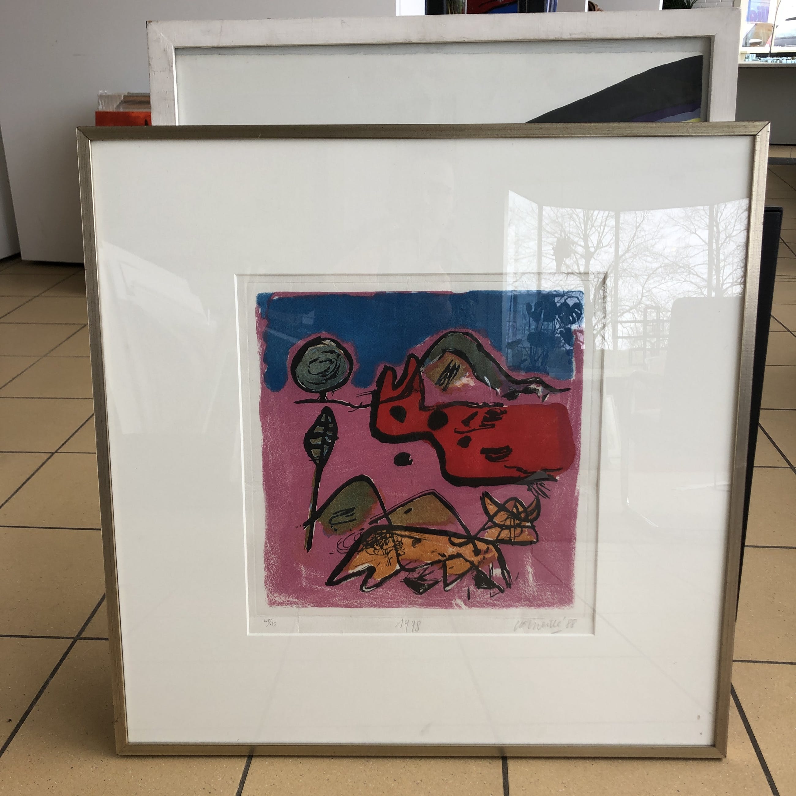Kleurrijk werk van Corneille met goudkleurige houten lijst. U kunt het werk vooraf komen beoordelen.