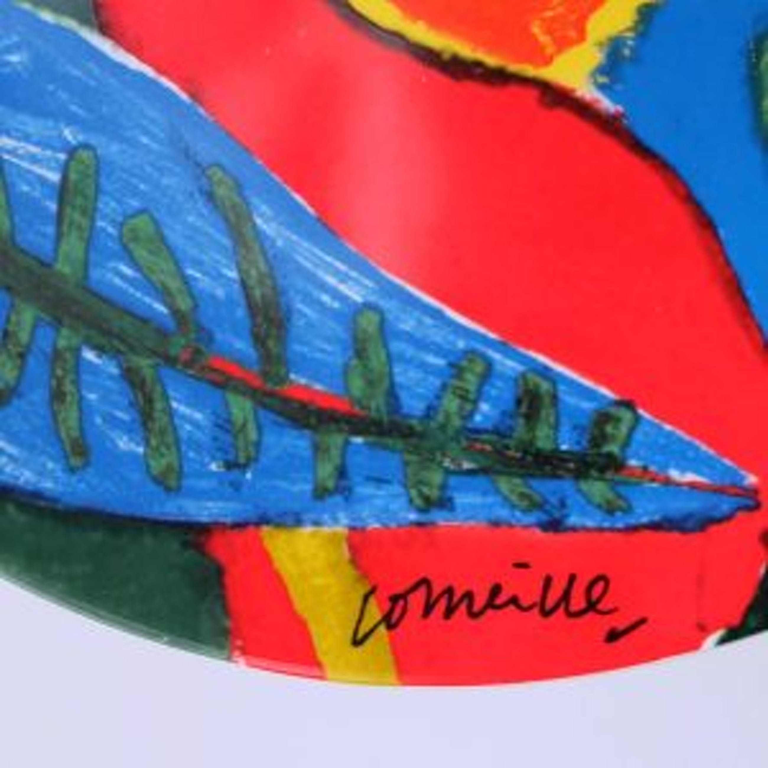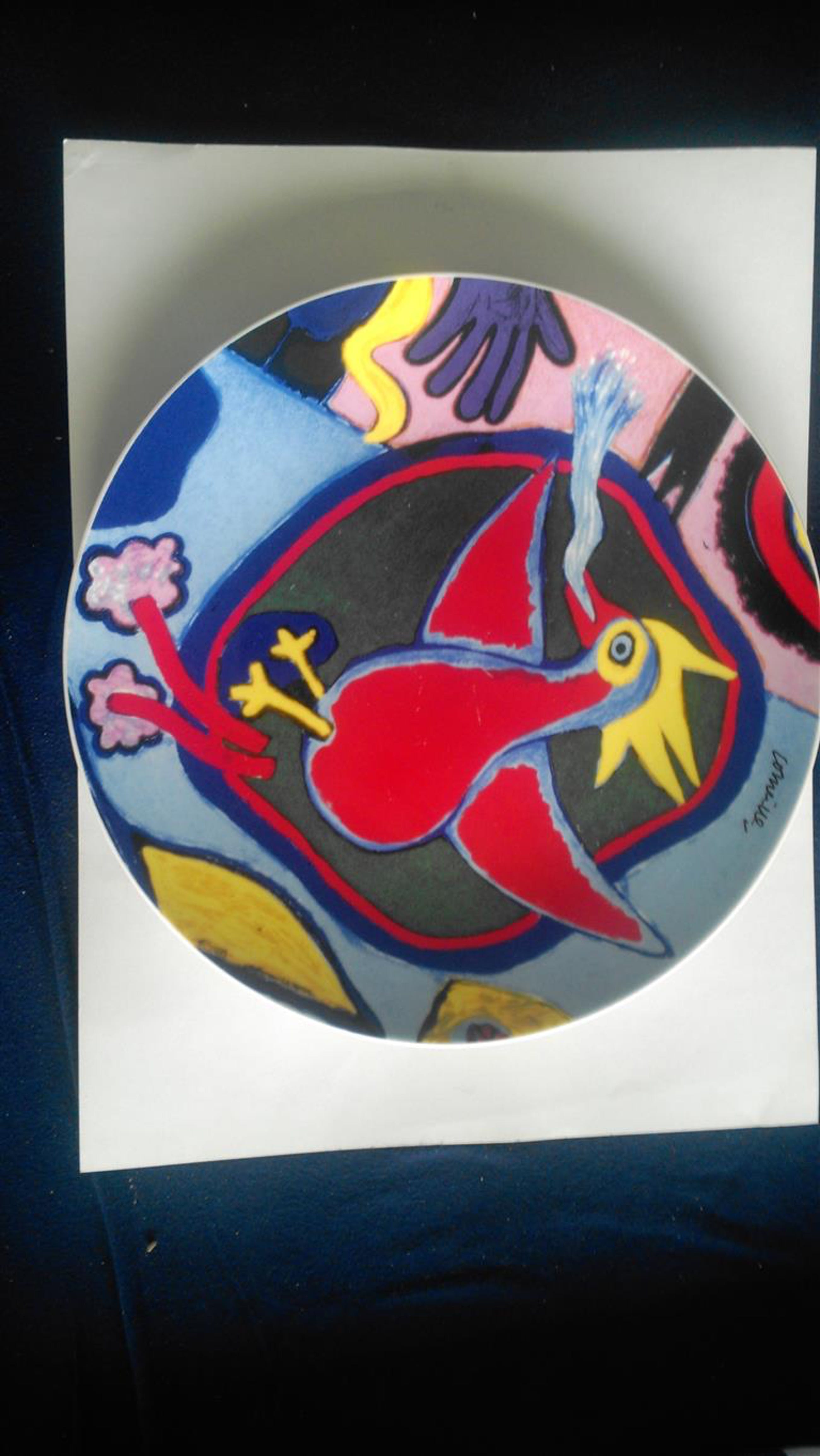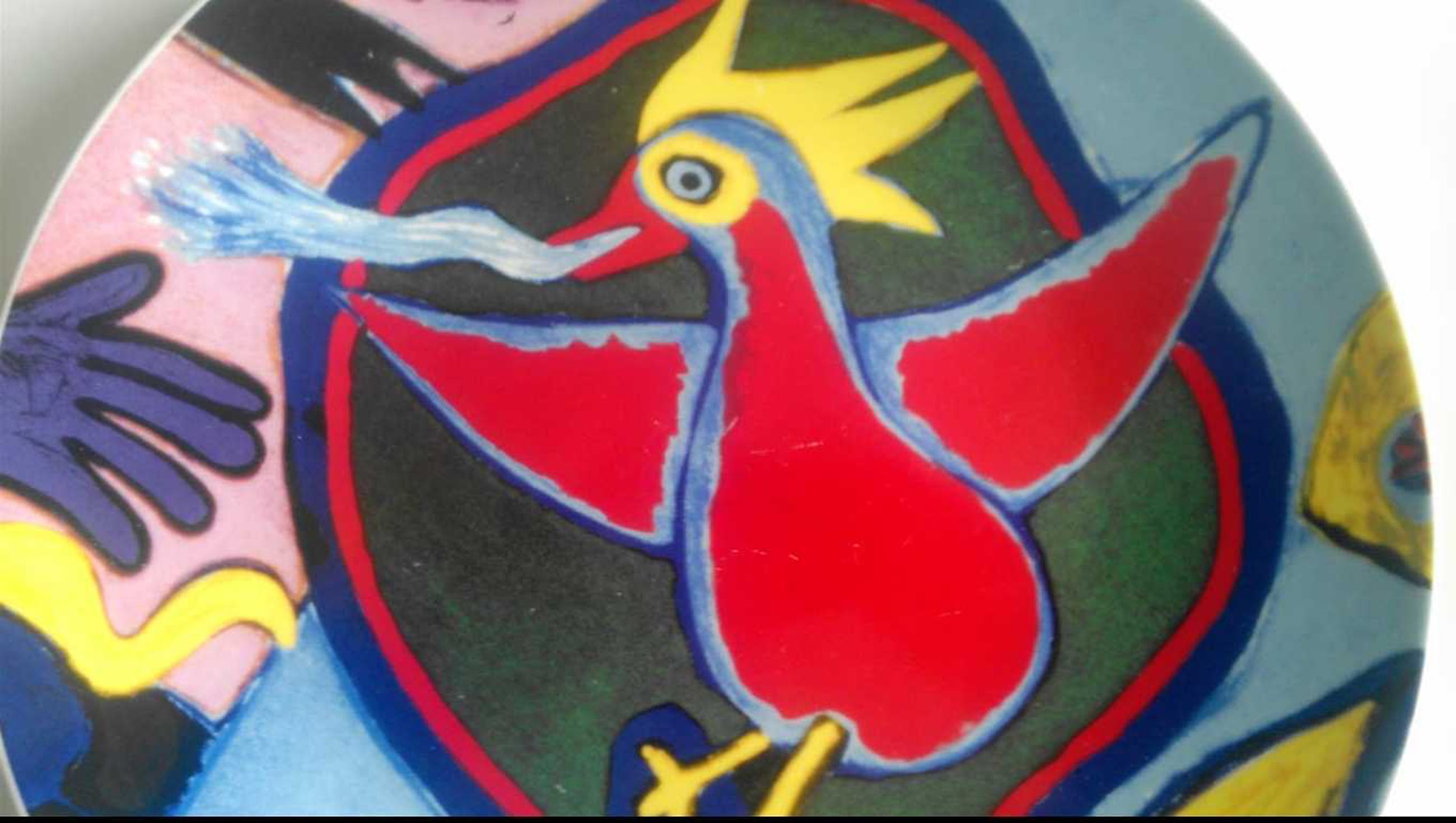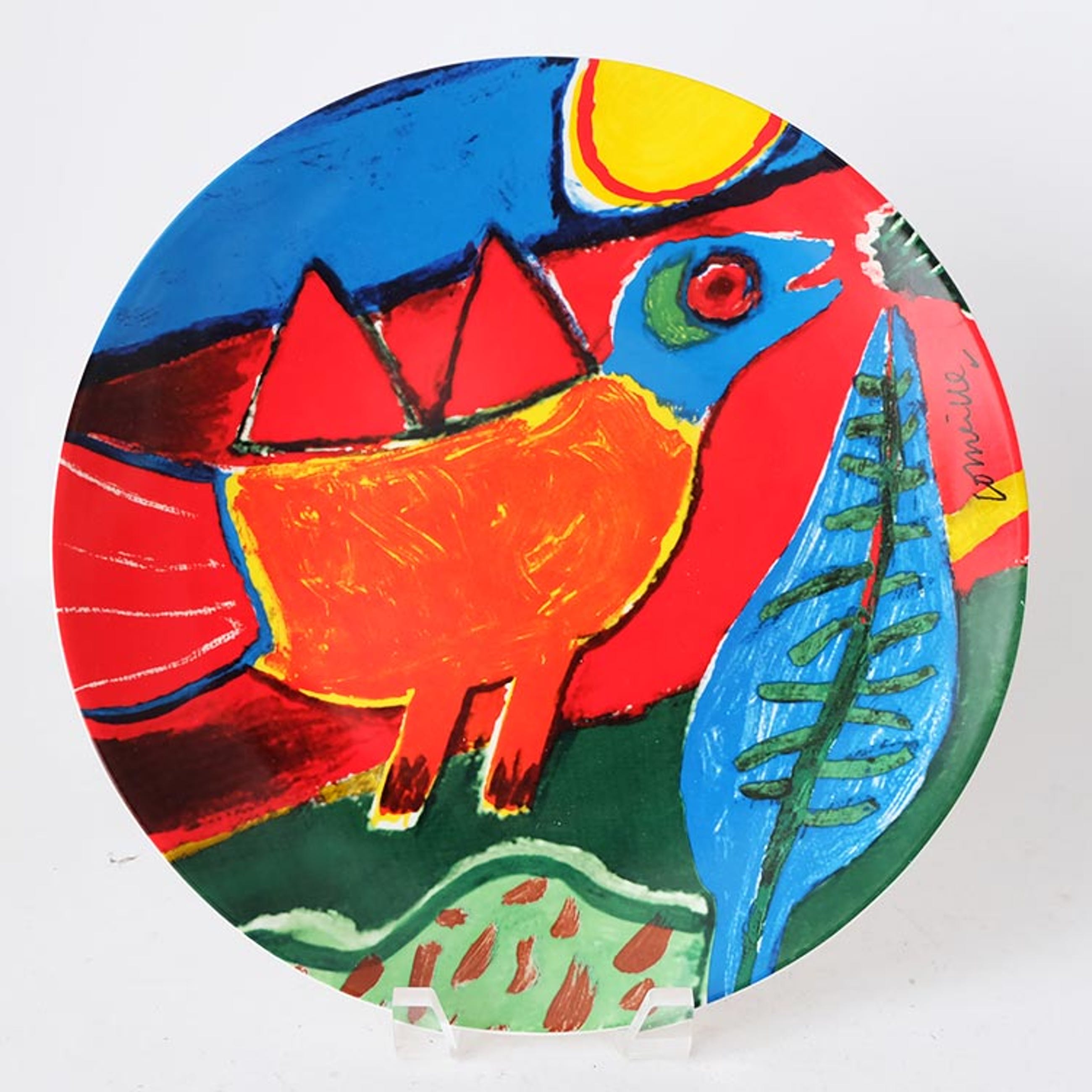 Twee sierborden of schalen met voor Corneille typerende onderwerp vogel in felle kleuren Corneille was medeoprichter van Cobra Deze kunstenaar zag het schilderen niet als werk of hobby maar als pure roeping.