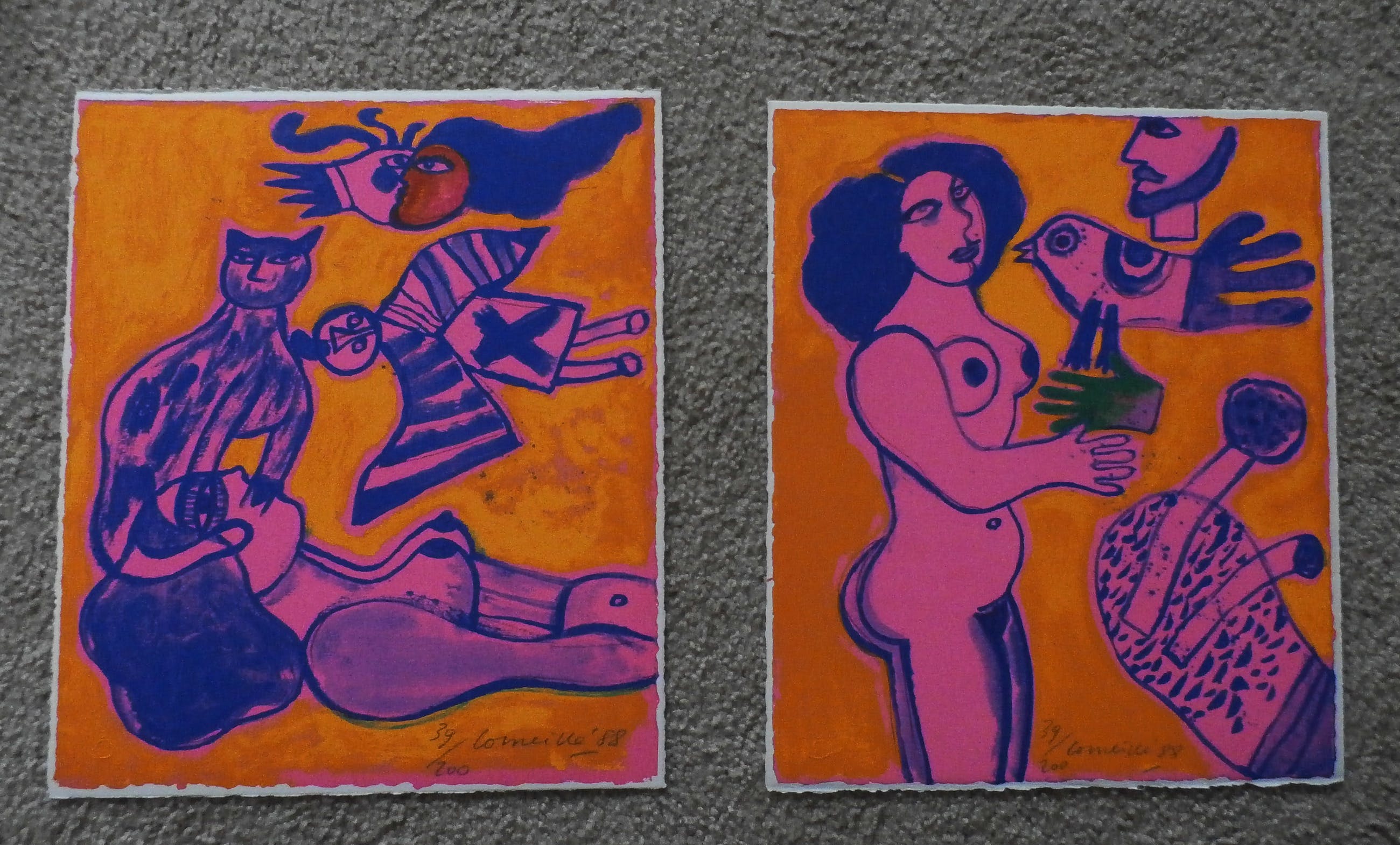 2 gesigneerde litho's van Corneille en een gesigneerd boek in luxe verzamelband. Titel: De sensualiteit van het gevoel. Jaar: 1988. Nummer: 39/200. Afmetingen: H29 x b25 cm. Gesigneerd en genummerd boek over Corneille door Marcel Paquet. Het boek is zowel gesigneerd door Corneille als door Marcel Paquet. Taal: Nederlands. Afmetingen boek: H29,5 x 25 cm. Aantal blz: 149. Boek en litho's zitten in een paarse verzamelband.