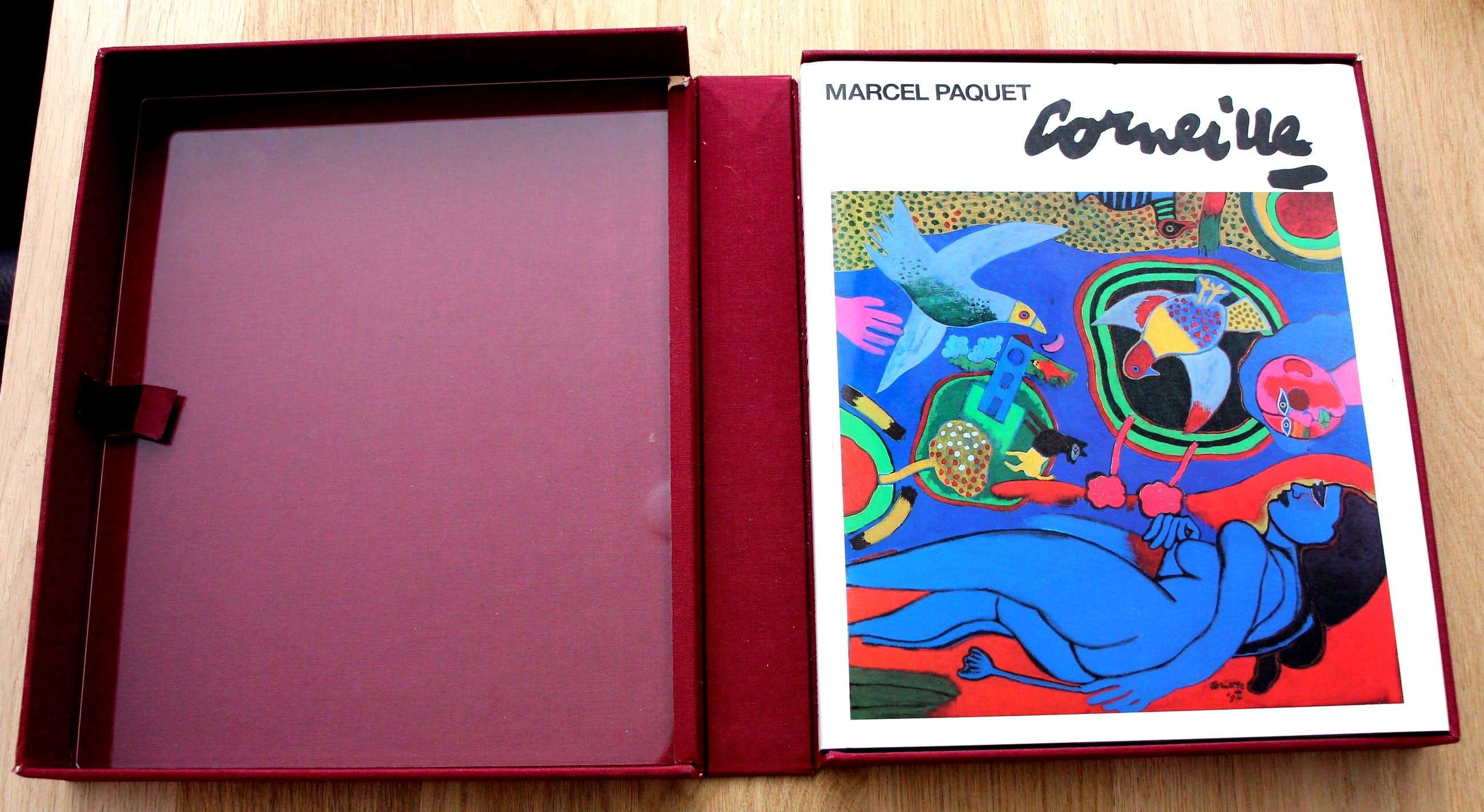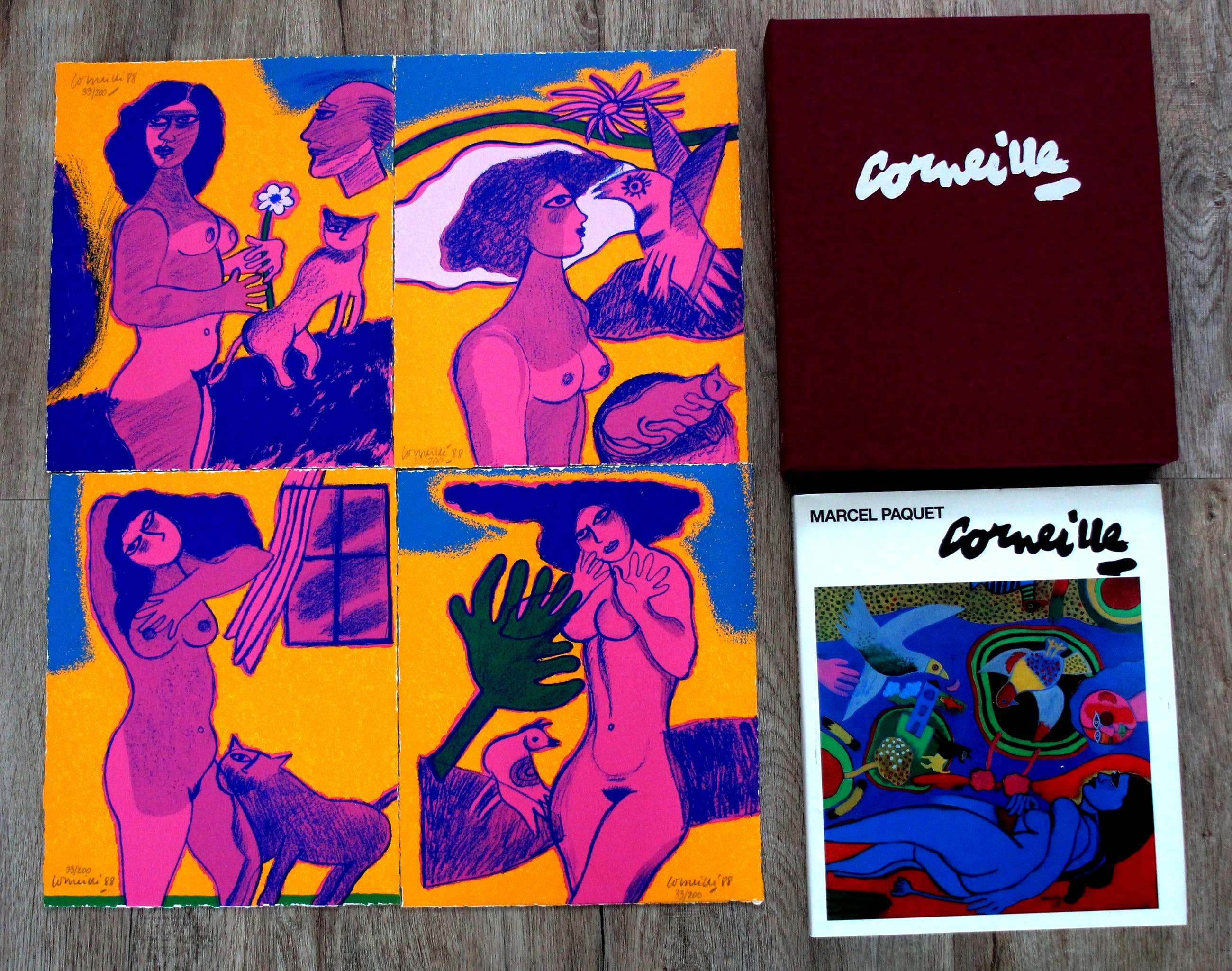 4 gesigneerde litho's van Corneille en een gesigneerd boek in luxe verzamelband. Titel: De sensualiteit van het gevoel. Jaar: 1988. Nummer: 33/200. Afmetingen per zeefdruk: H29 x b25 cm. Gesigneerd en genummerd boek over Corneille door Marcel Paquet. Het boek is zowel gesigneerd door Corneille als door Marcel Paquet. Taal: Nederlands. Afmetingen boek: H29,5 x 25 cm. Aantal blz: 149. Boek en litho's zitten in een paarse verzamelband.