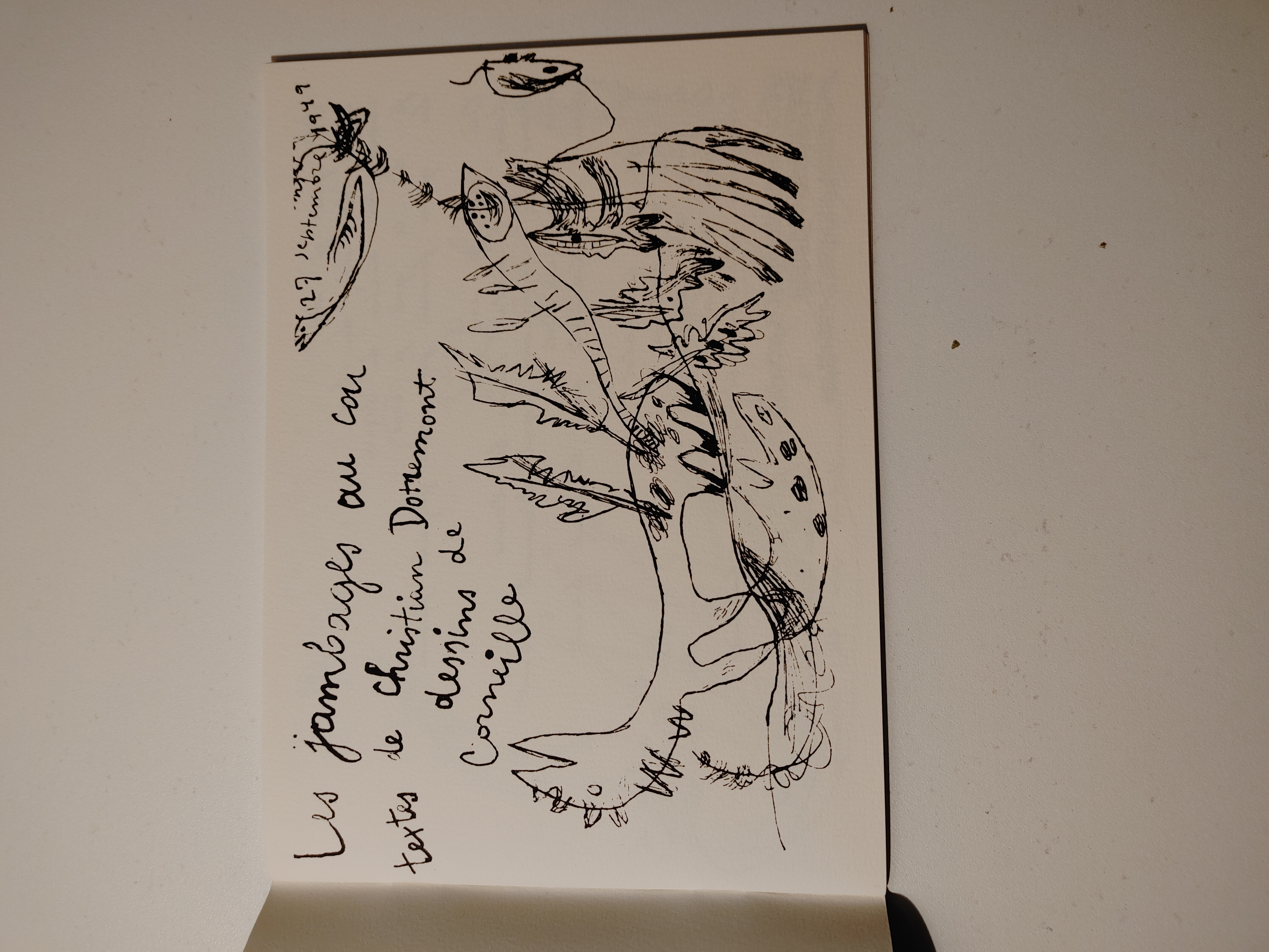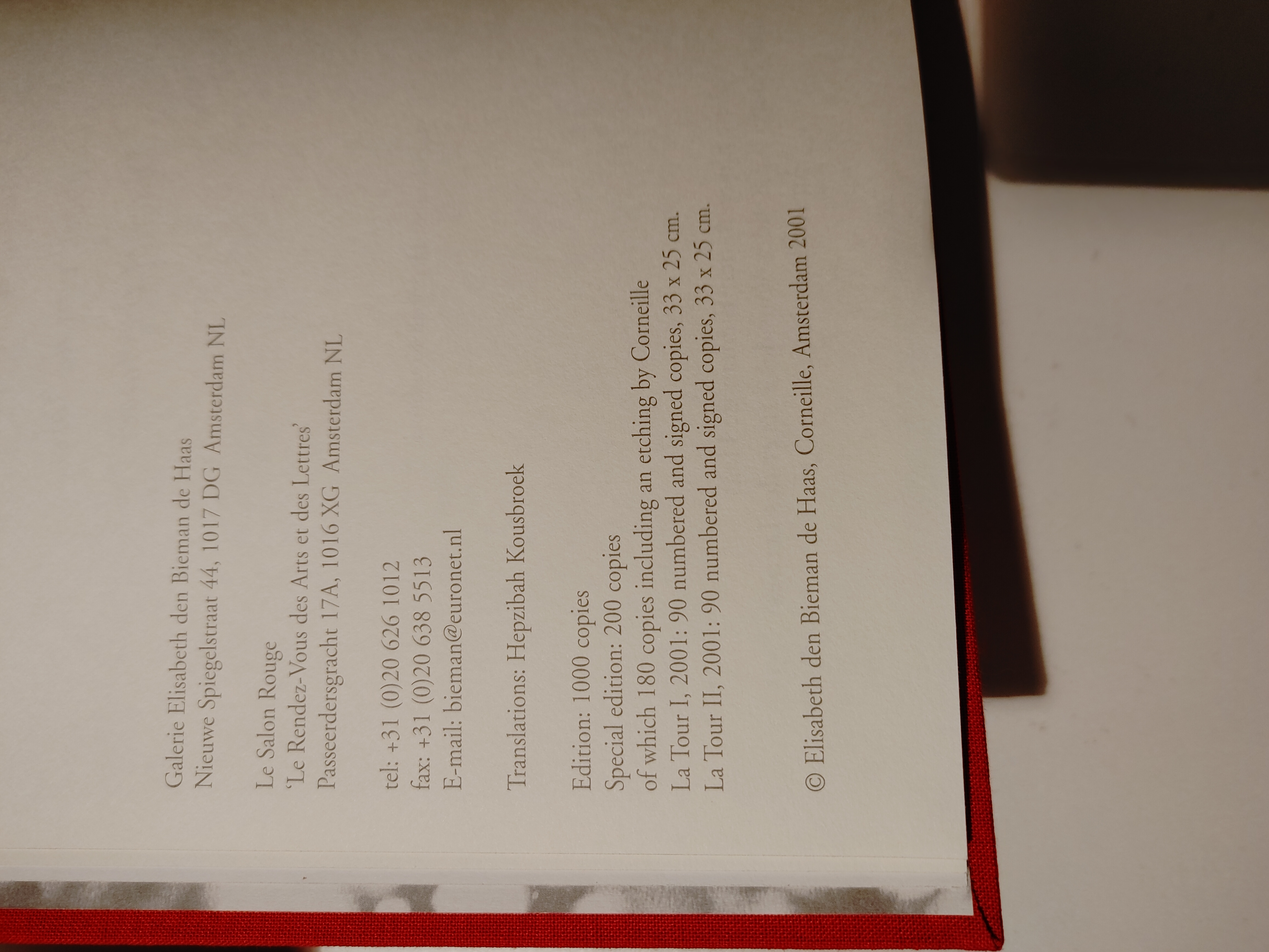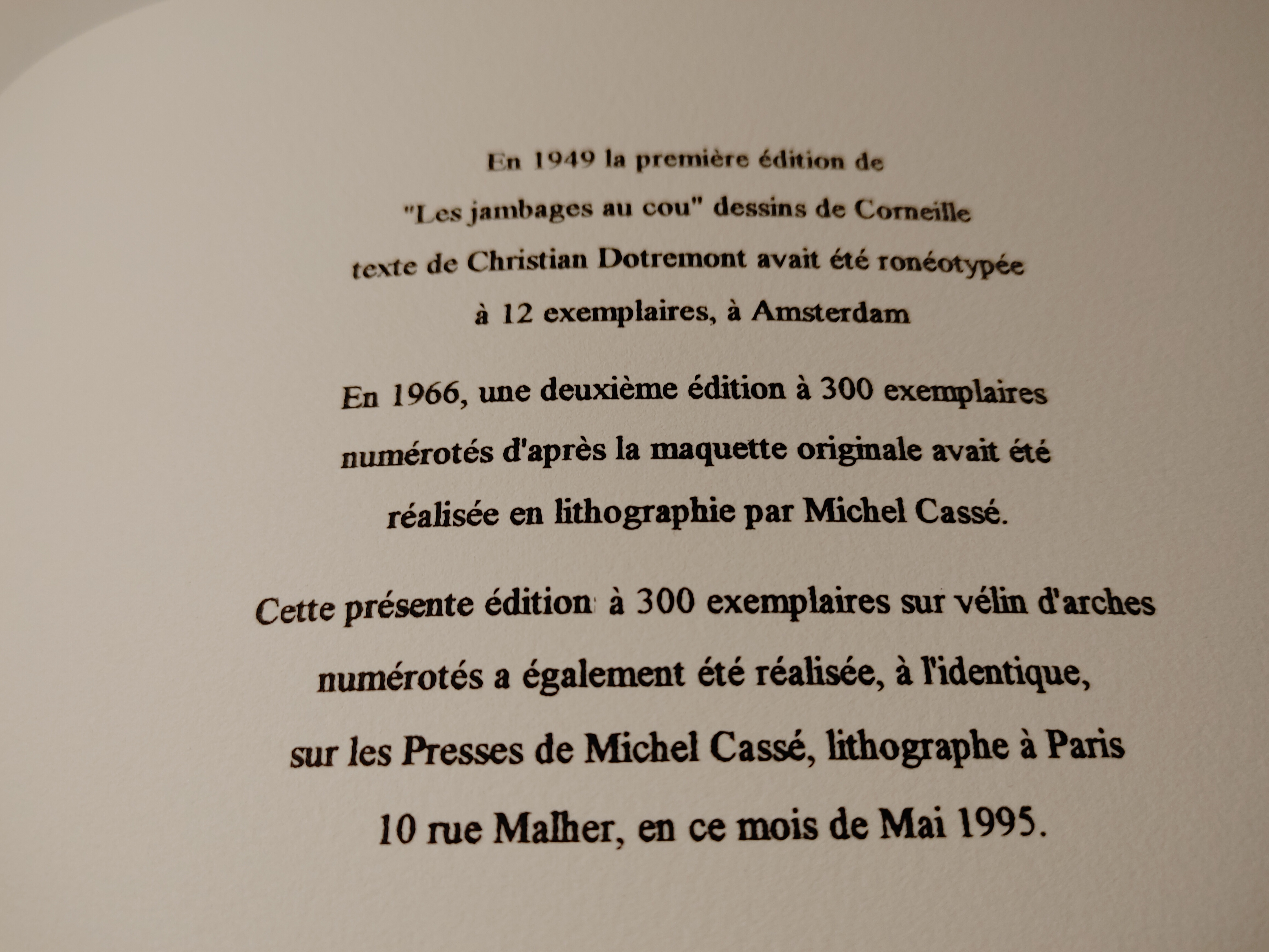 1. Les jambages au cou dessins de Corneille - Facsimile uitgave. Eerste druk Amsterdam 1949 in slechts 12 exemplaren. Tweede druk, 300 ex. 1966. Deze editie (= 3e) geheel in lithografie uitgevoerd door Presses Michel Cassé (litho Parijs) in Mai 1995 in een oplage van 300 exemplaren.