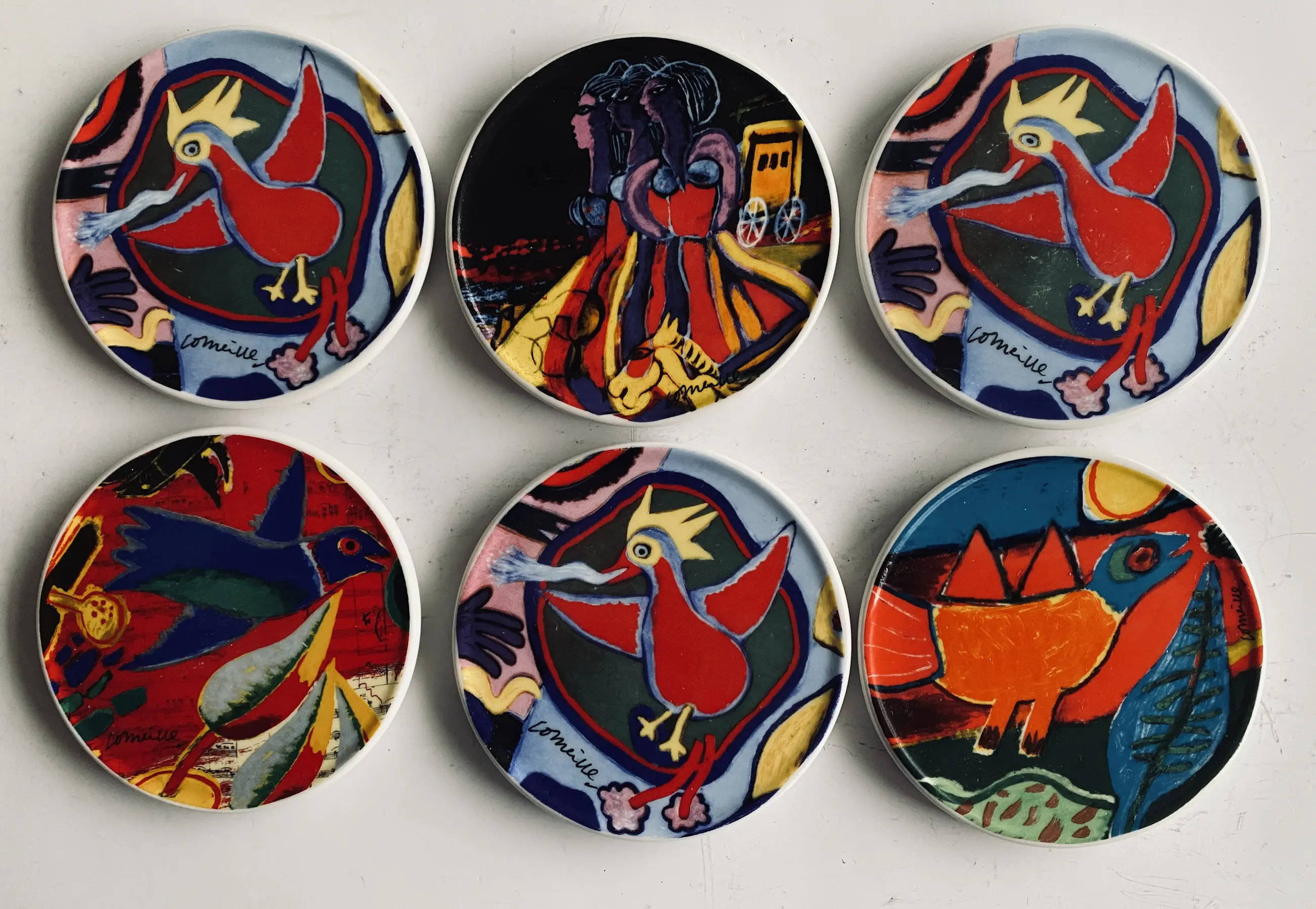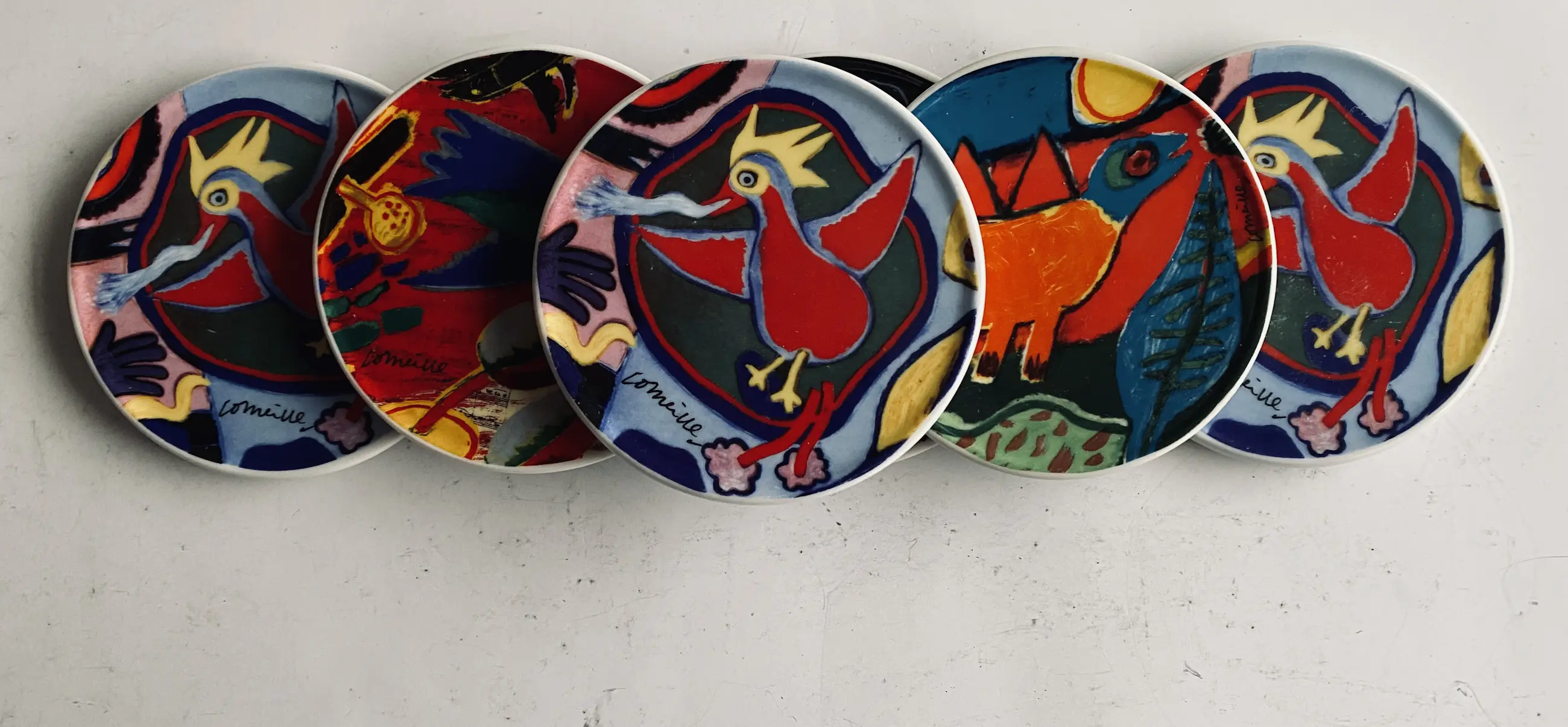 Set van 6 keramische onderzetters – Corneille (CoBrA) Een zeldzame en kleurrijke set van zes keramische onderzetters ontworpen door de internationaal gerenommeerde kunstenaar Guillaume Corneille (1922–2010), medeoprichter van de avant-gardistische CoBrA-beweging. Elk exemplaar toont een uniek tafereel in Corneille’s kenmerkende stijl: expressieve lijnen, levendige kleuren en gestileerde vogels en figuren die verwijzen naar dromen, vrijheid en fantasie.