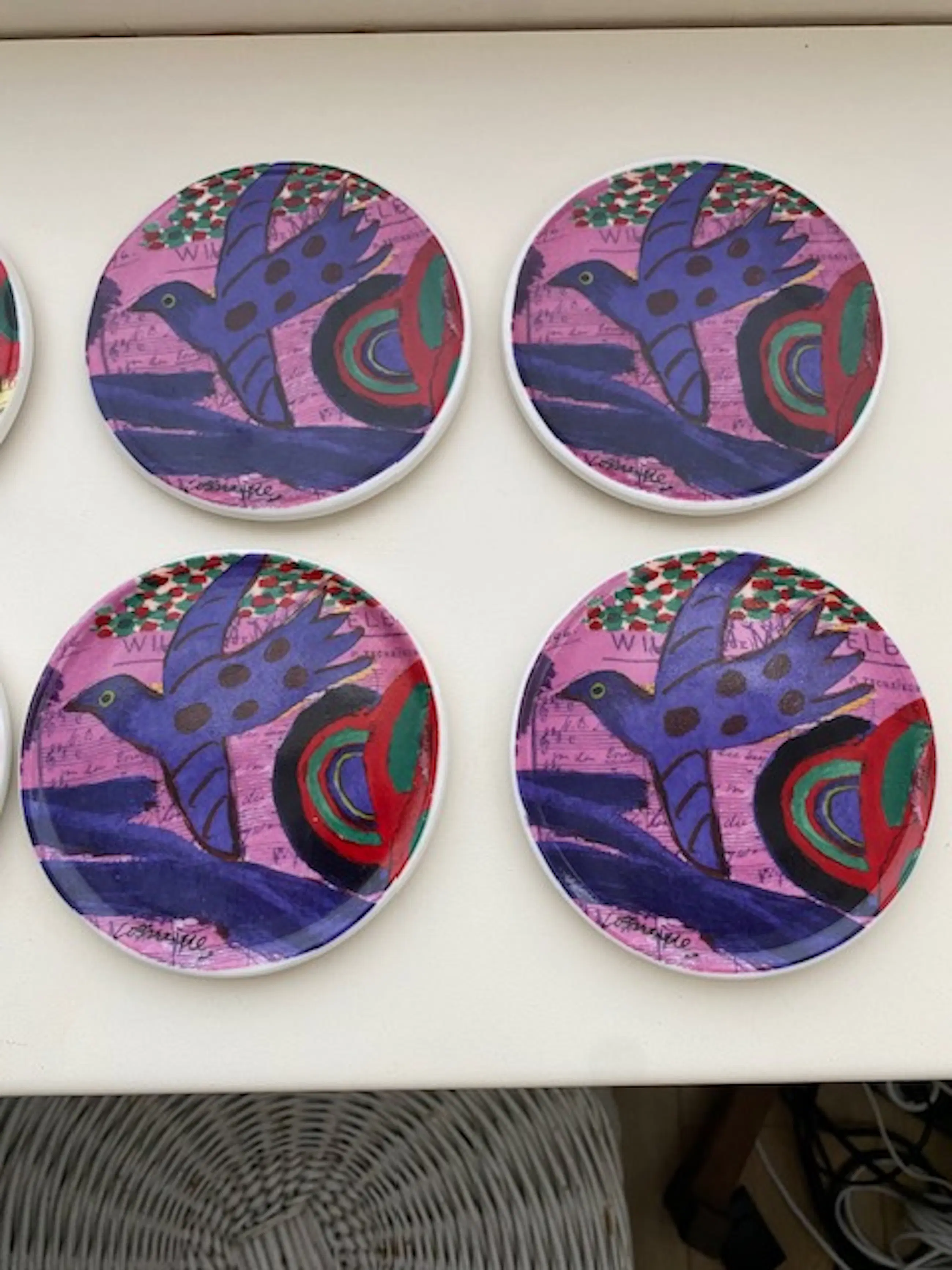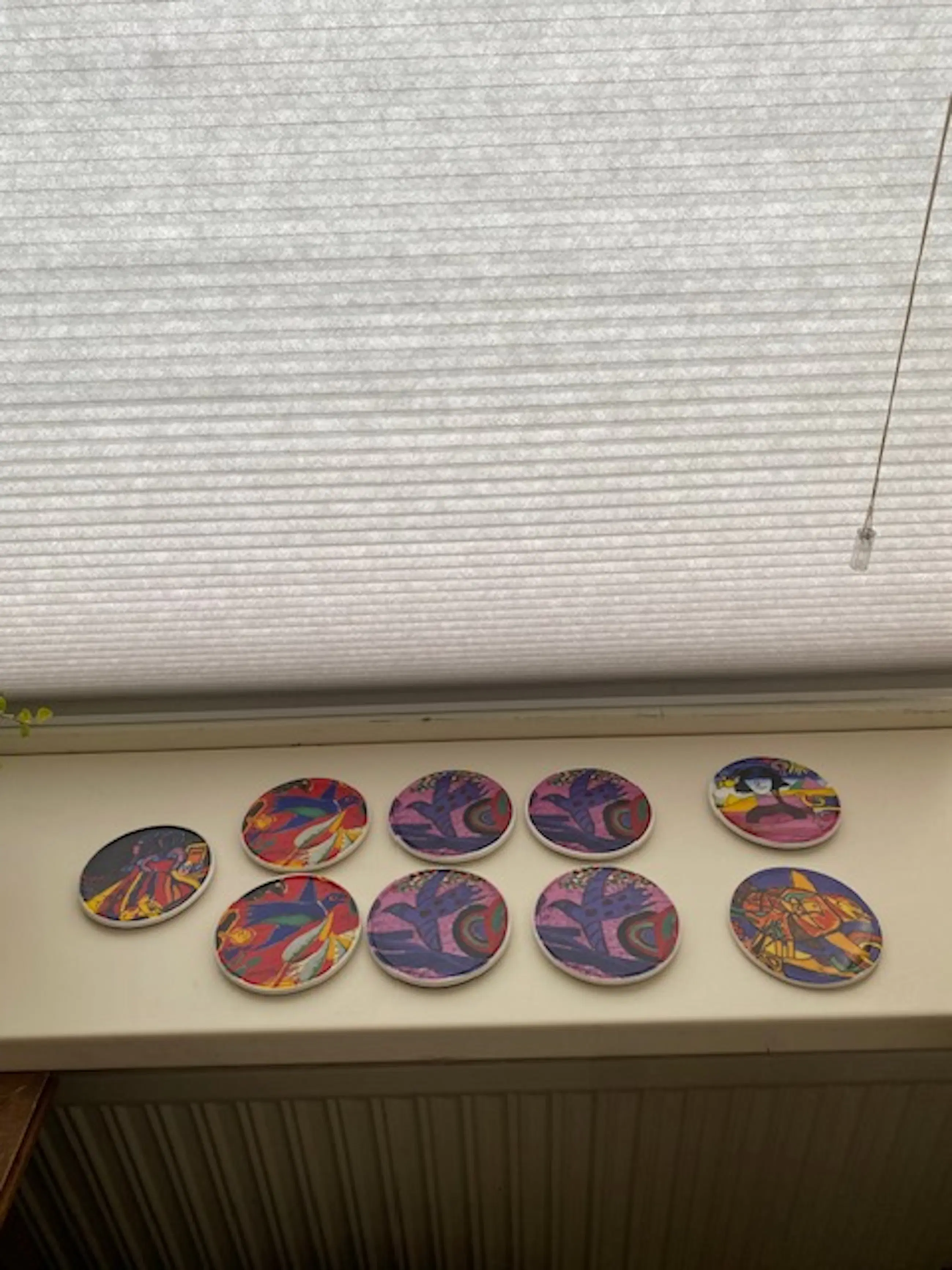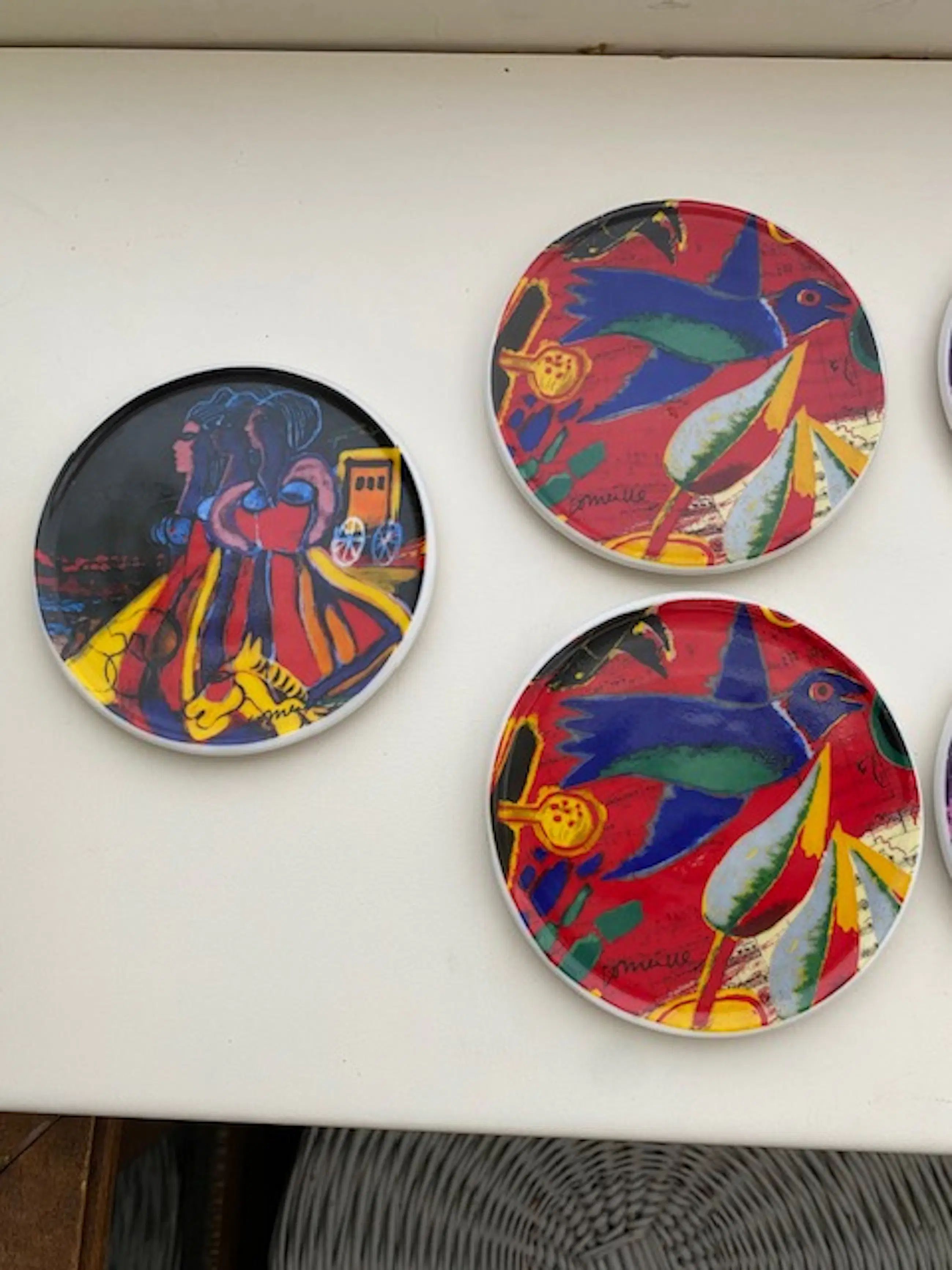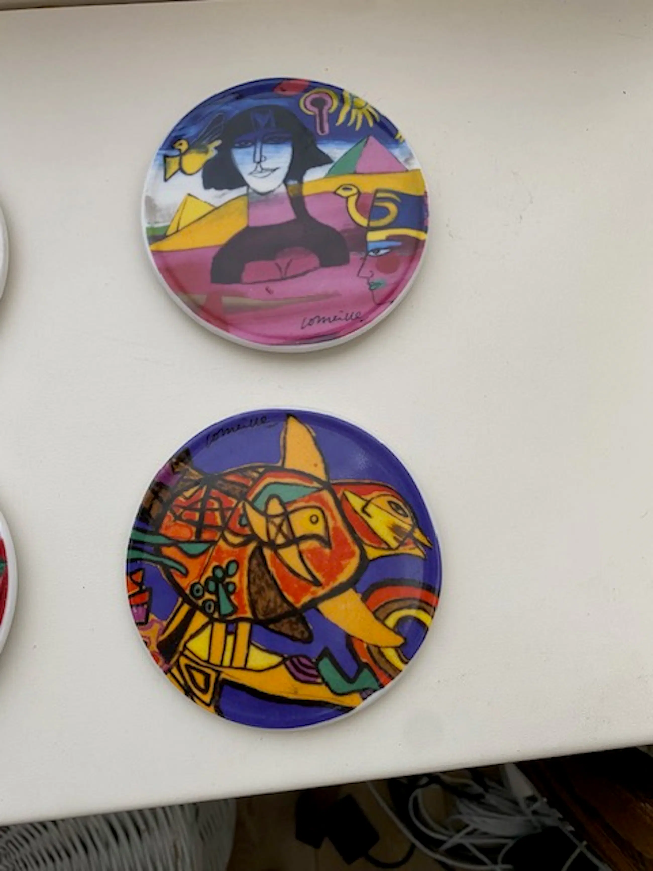 9 sts Keramische onderzetters van de Nederlandse kunstschilder Cornelis Guillaime van Beverloo (1922-2010), beter bekend als Corneille. De onderzetters zijn gesigneerd en de diameter is 10 cm.