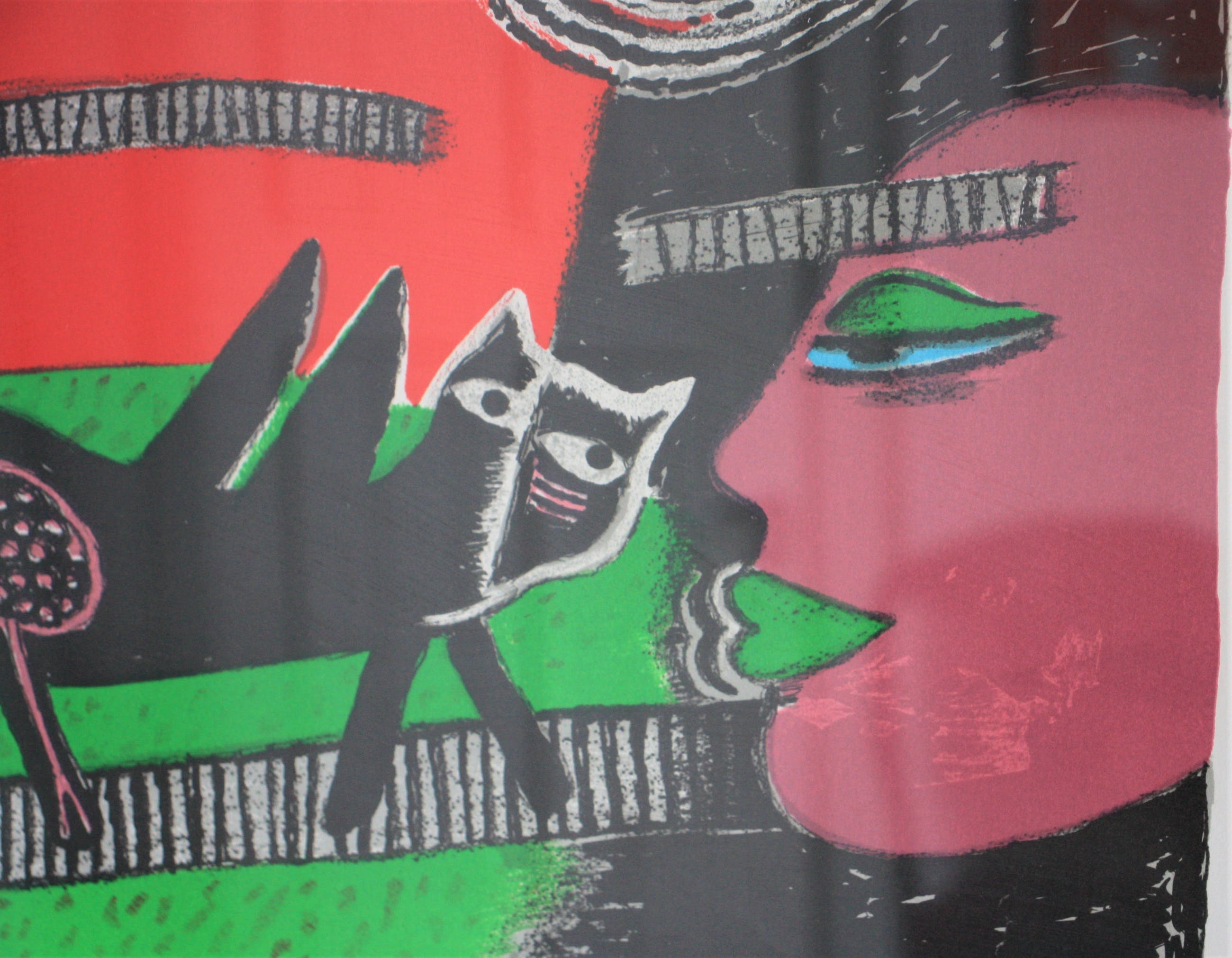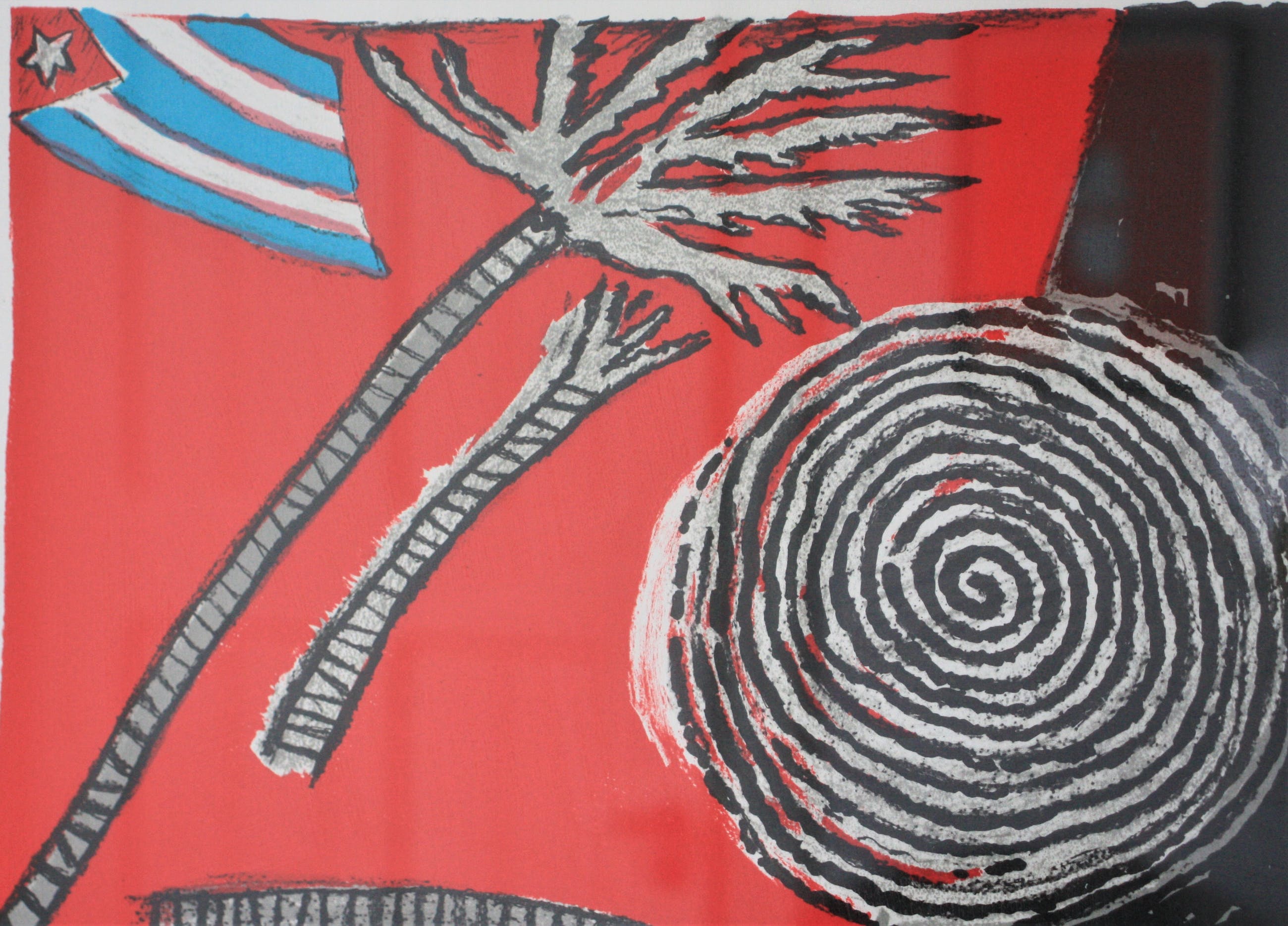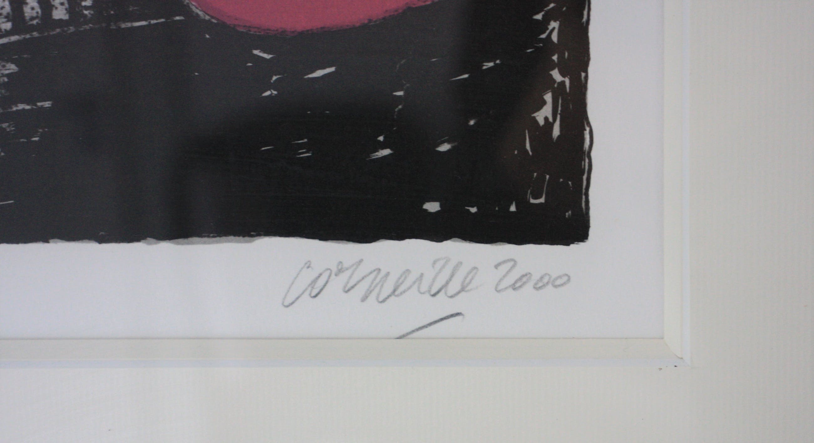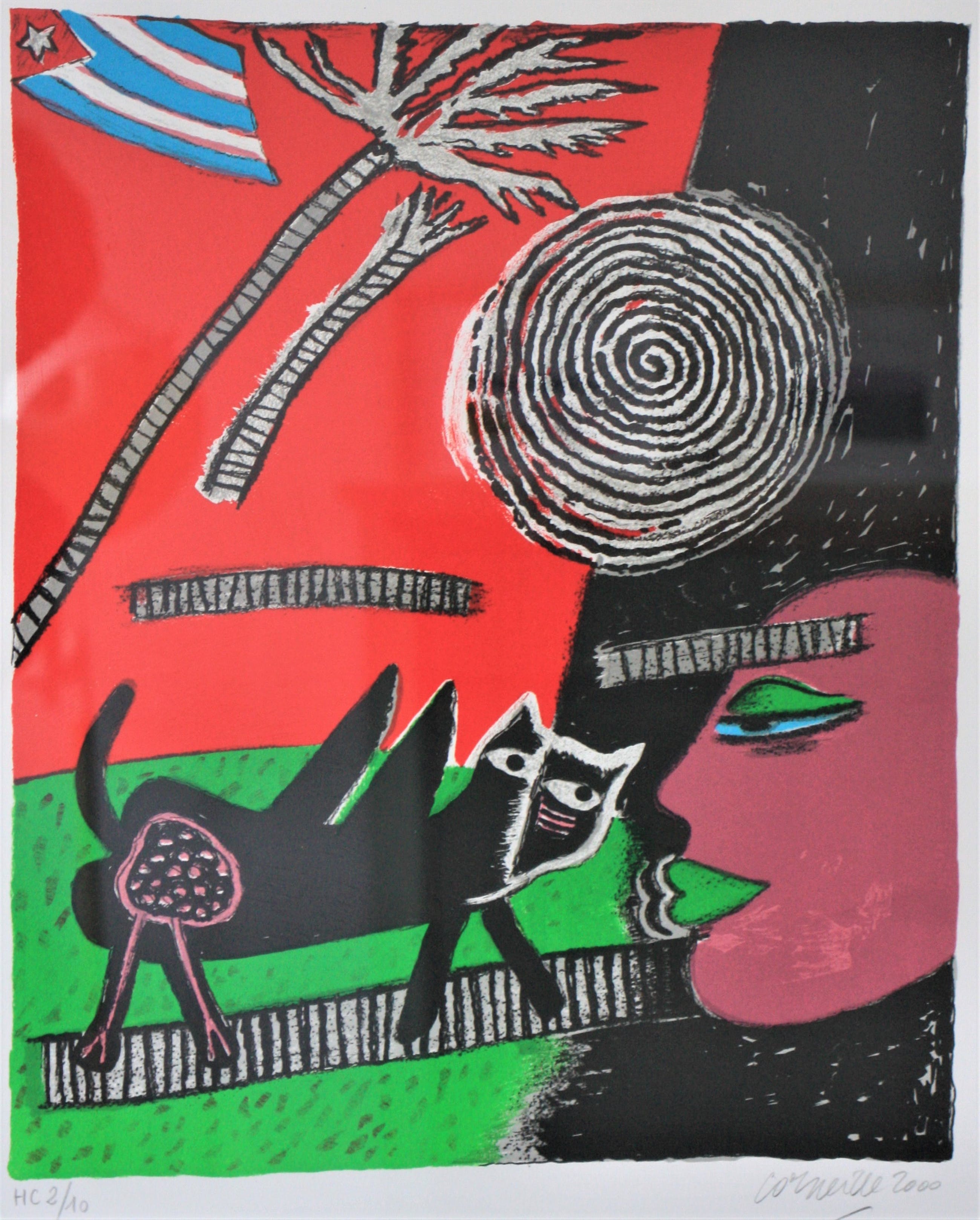 Dit werk is van de Nederlandse kunstenaar Corneille. Op de druk is een abstracte voorstelling afgebeeld met een kar, een Cubaanse vlag en een gezicht rond een zon. Het werk is in zeer goede staat, linksonder genummerd HC 2/10 en rechtsonder gesigneerd en gedateerd 2000. Het werk is ingelijst in een passe-partout en achter glas.
