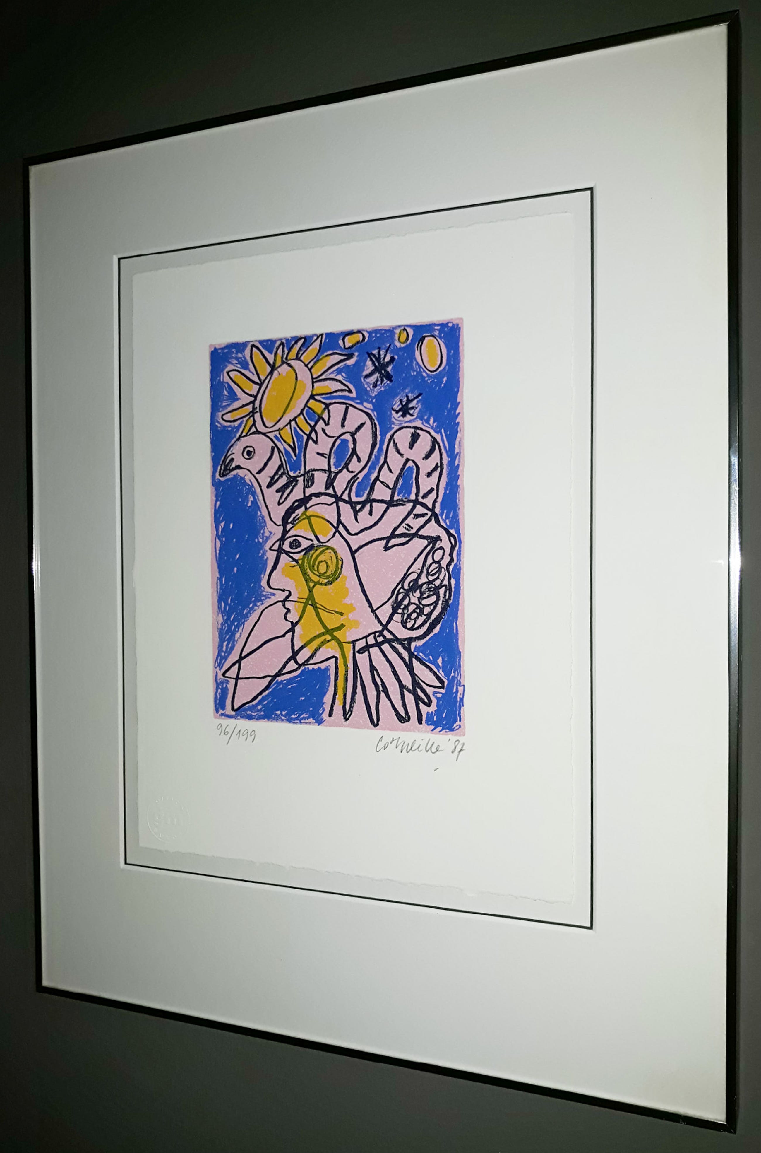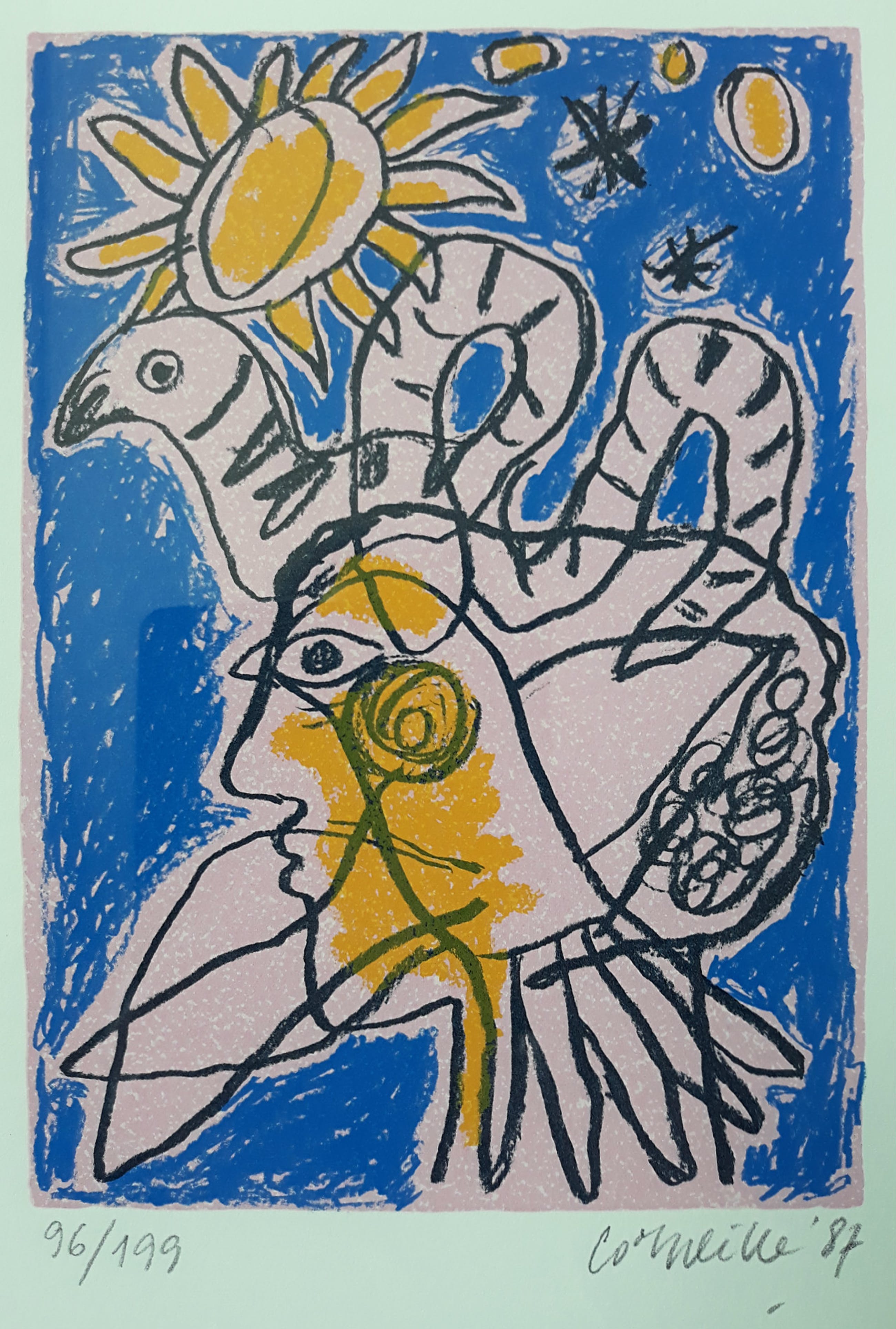 Mooi werk uit de Zweedse uitgave “Allegro”. Zeefdruk op geschept papier, met potlood gesigneerd, gedateerd (‘87) en genummerd (96/199), en met blindstempel “GKM edition suede”. Het hele blad in strakke metalen lijst, achter glas en dubbel, zuurvrij passe-partout. Zeefdruk, blad en lijst in uitstekende conditie, alleen wat hele lichte vlekjes onderaan het bovenste passe-partout. Indien dit storend wordt gevonden dan moet in het ergste geval het bovenste passe-partout vervangen worden (max. 25 euro).
