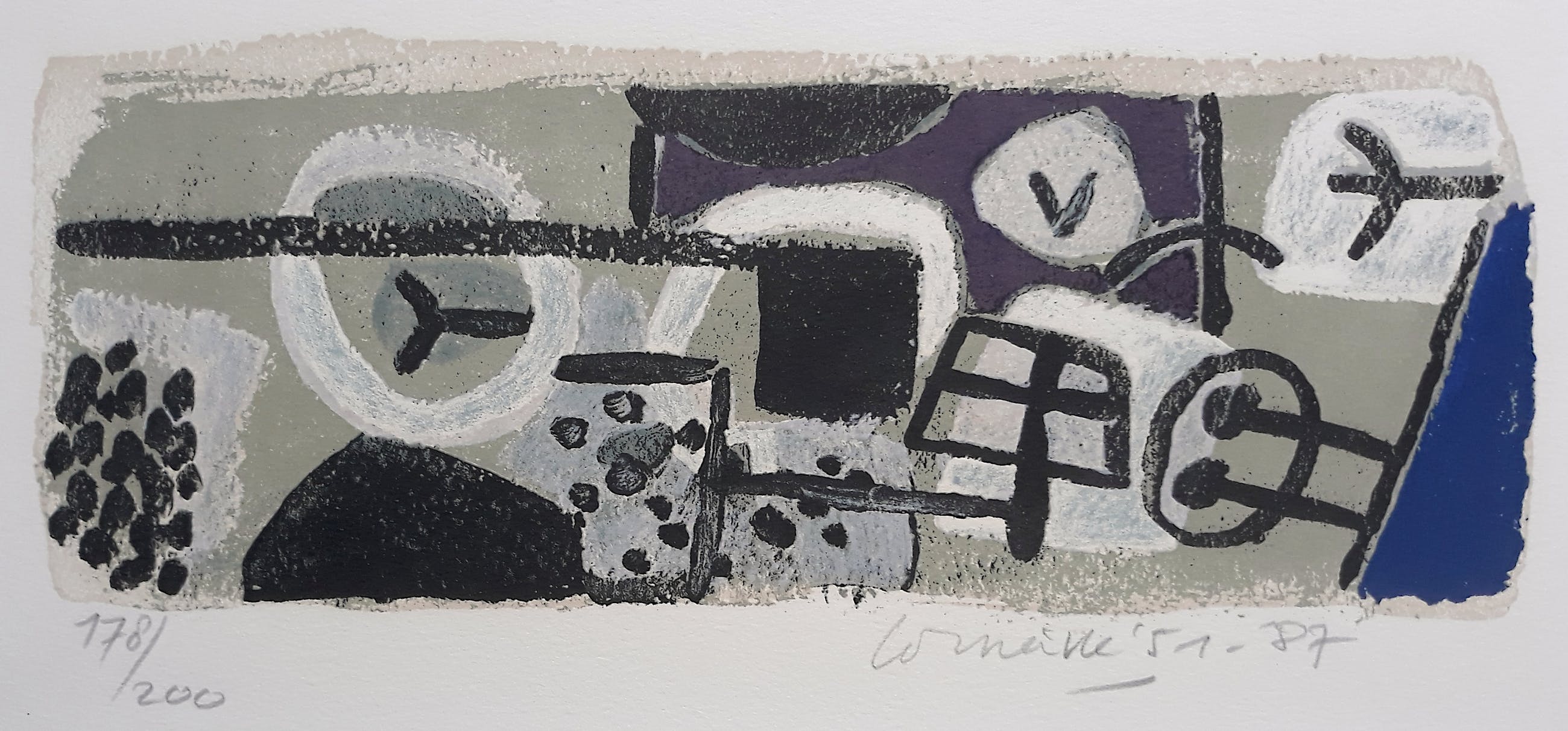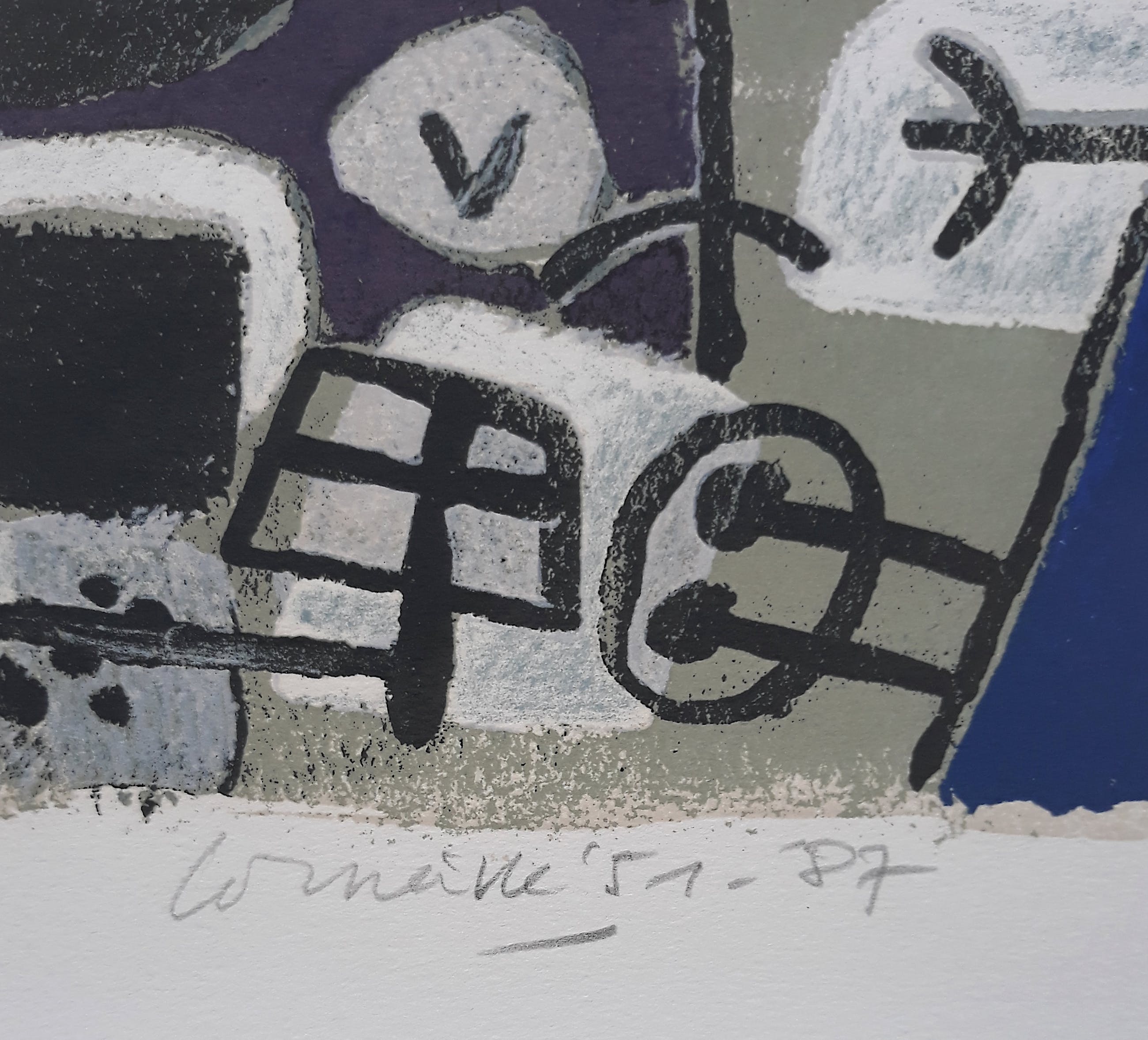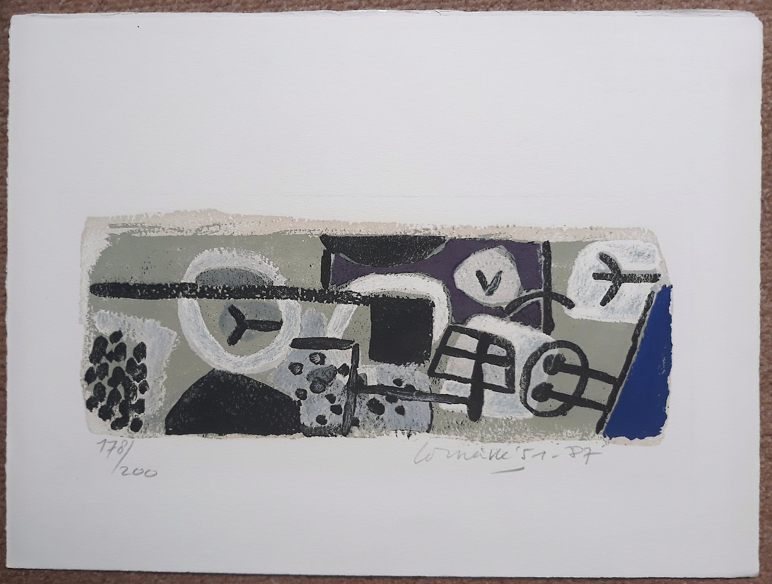 Prachtige, bekende compositie van Corneille uit de reeks “April in Paris” van 1987, een hernieuwing van de samenwerking met Hugo Claus uit 1951. Zeefdruk op 250 grams Velin Arches papier, met potlood gesigneerd, gedateerd (’51-‘87) en genummerd (178/200). In goede conditie; blad heeft ingelijst gezeten, er is een zeer lichte verkleuring van een vorig passe-partout. Opnieuw ingelijst met passe-partout is het werk uitstekend.