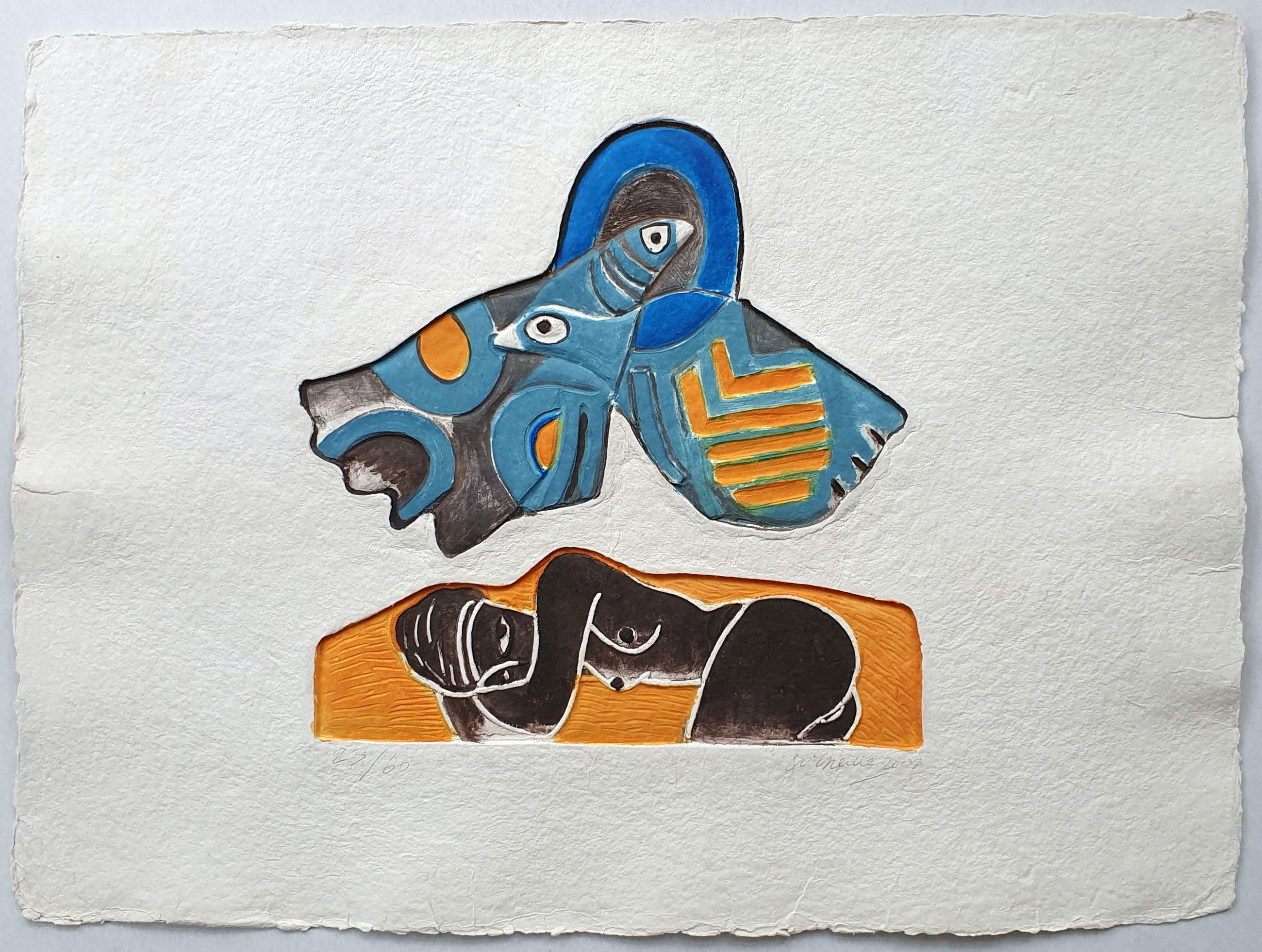 Aquagravure uit 2000 van Corneille met de titel: 'Les oiseaux amoureux et l’africaine'. Het werk is rechtsonder met de hand gesigneerd door de kunstenaar.