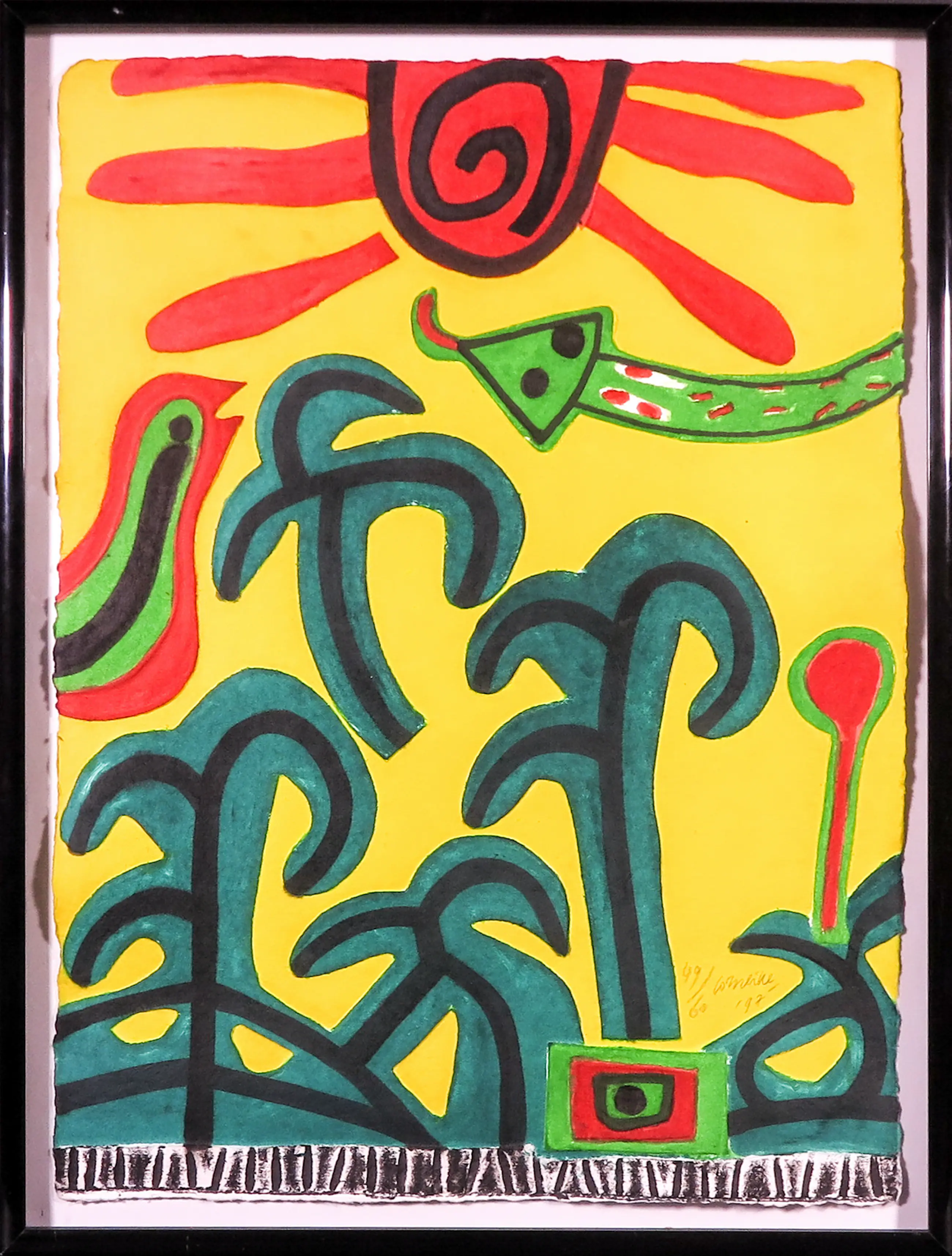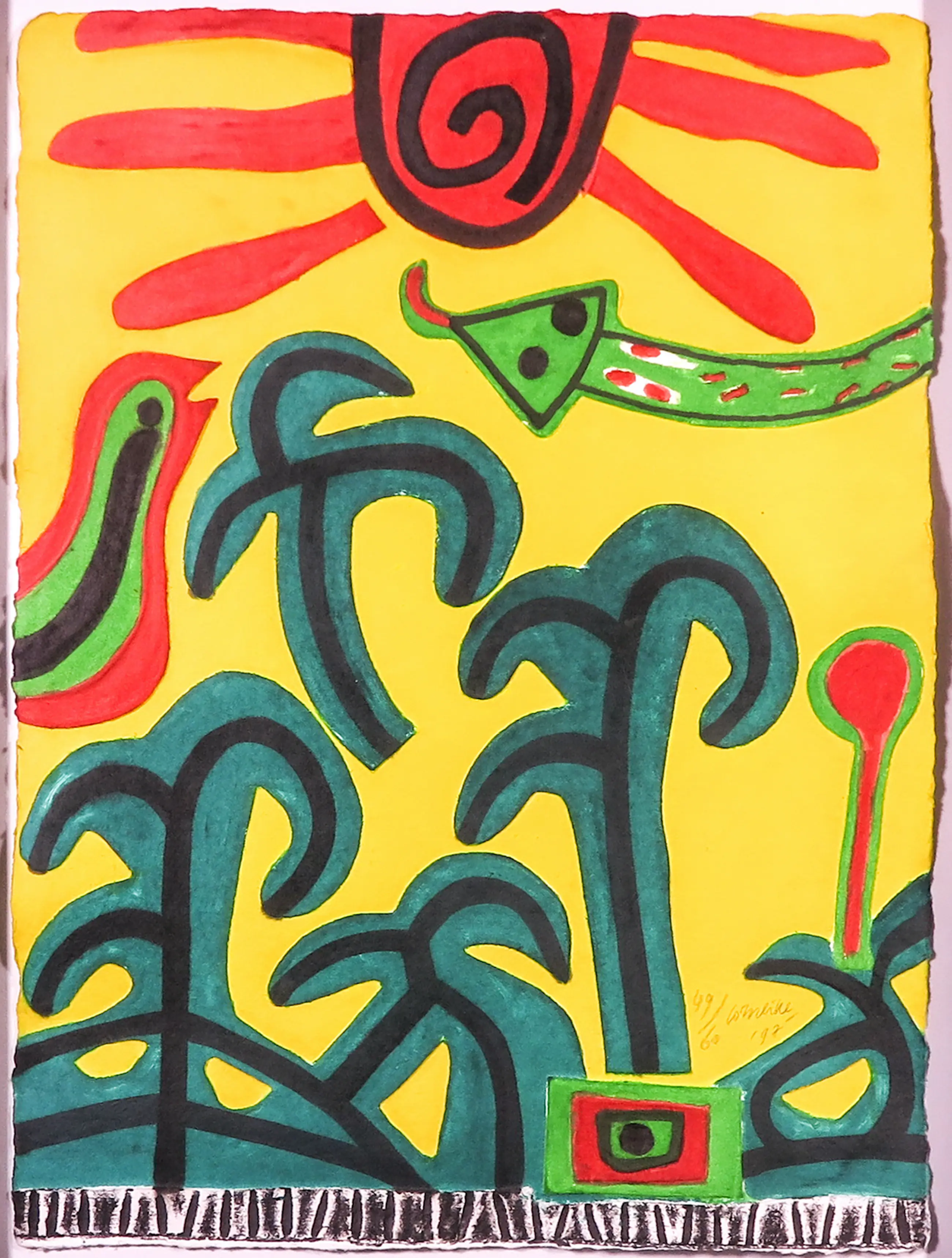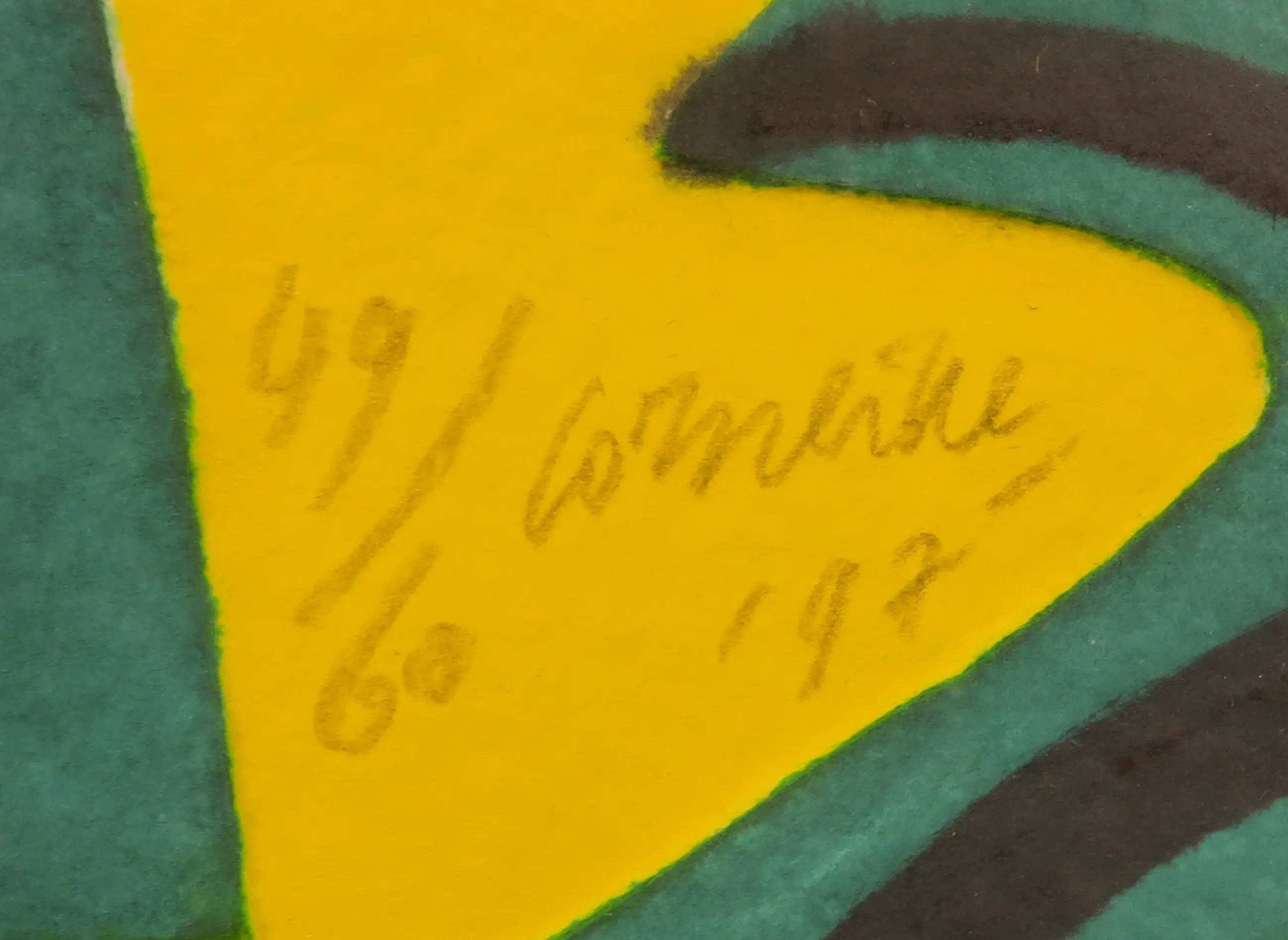 Intens gekleurde aquagravure met diep reliëf, ingelijst in een diepe stevige vitrinelijst. Vervaardigd in Parijs in 1997, handgesigneerd.
