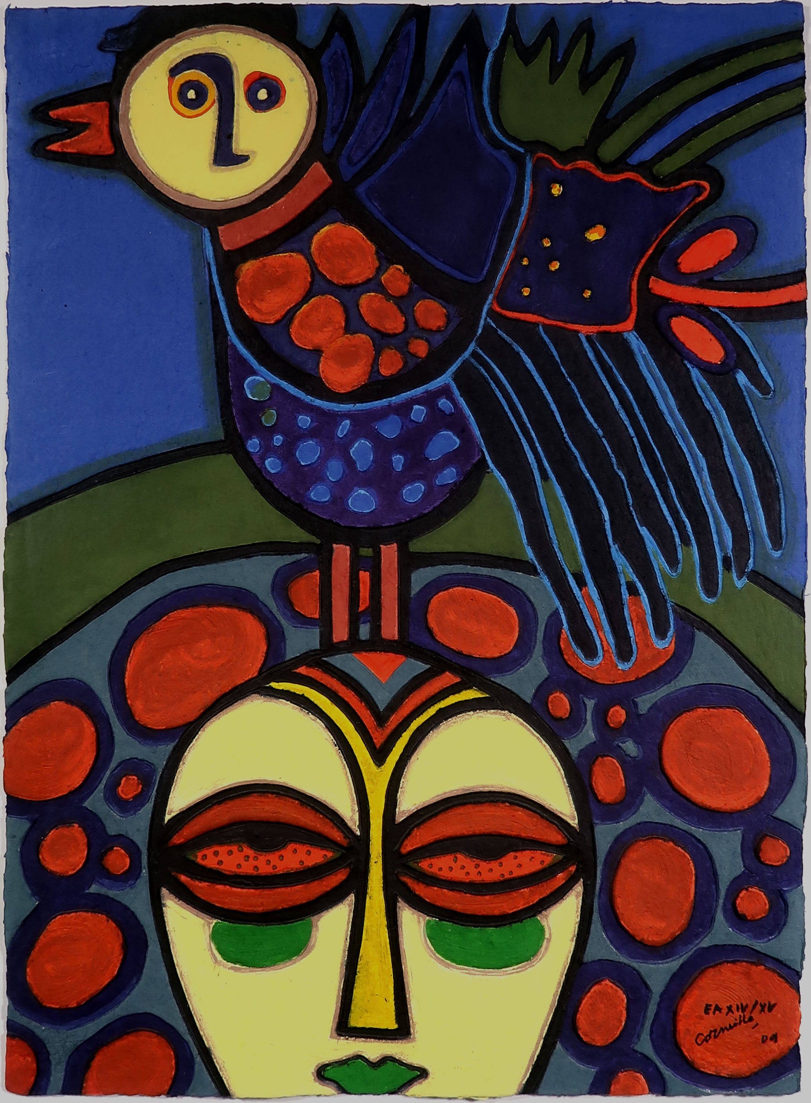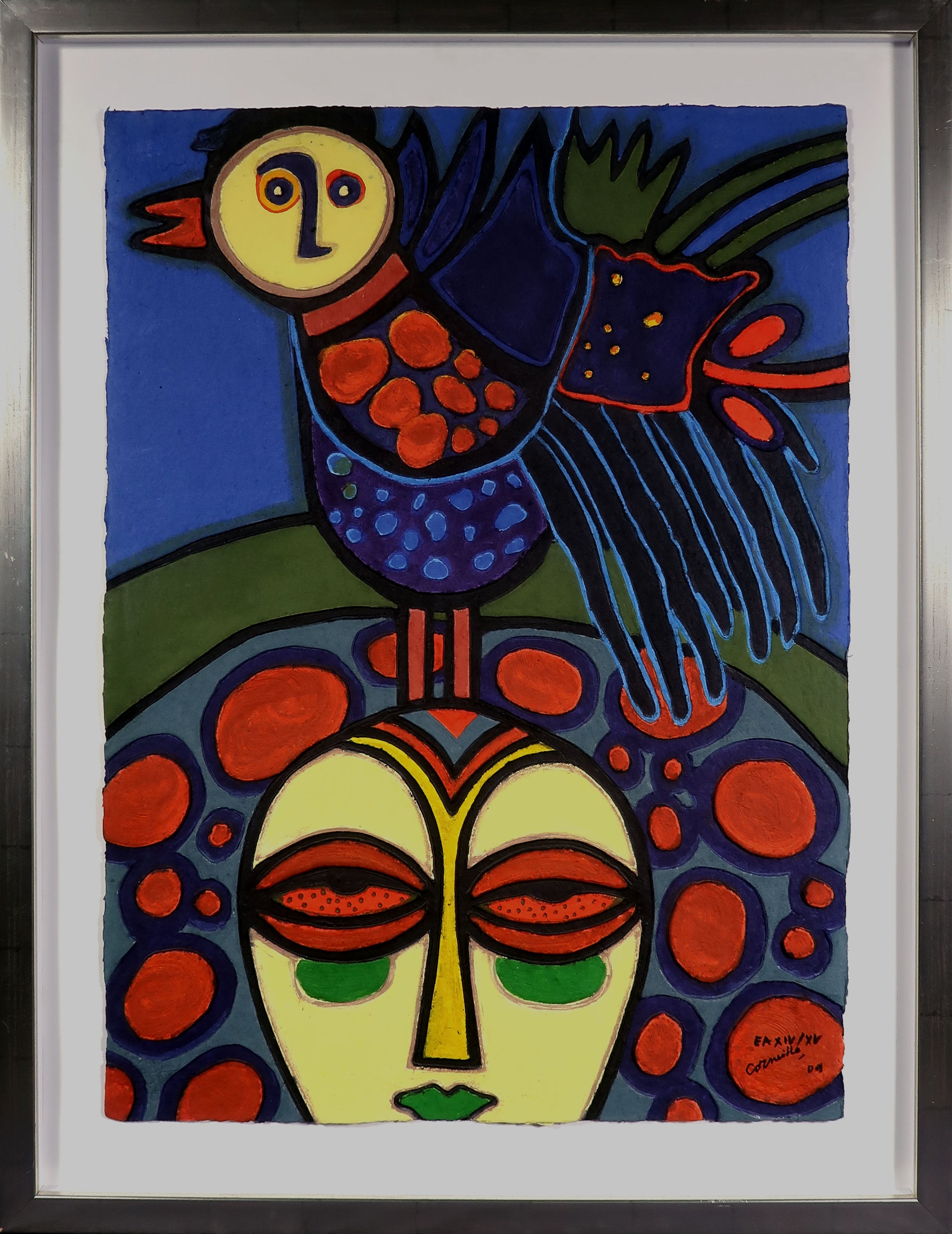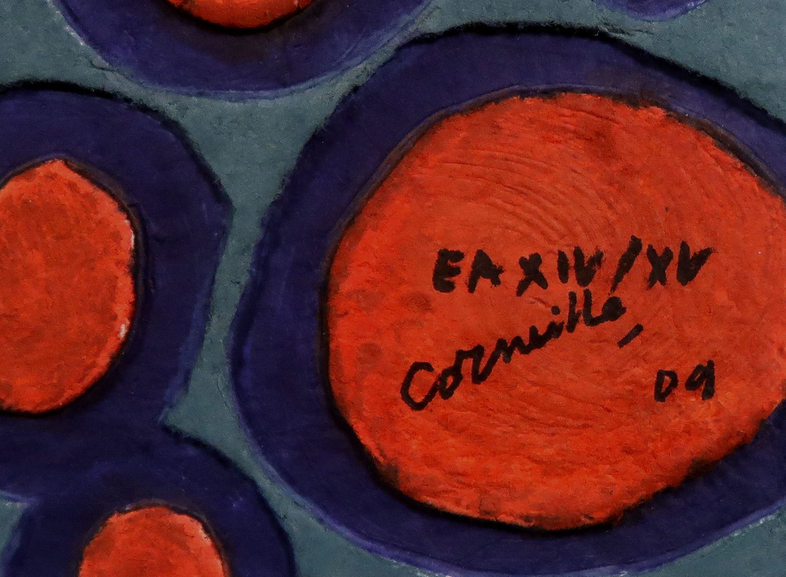 Kleurrijke en intrigerende aquagravure van Corneille, getiteld ''Visage Baroque''. Het is werk in in een zilverkleurige lijst ingelijst, waarin het werk goed tot zijn recht komt.