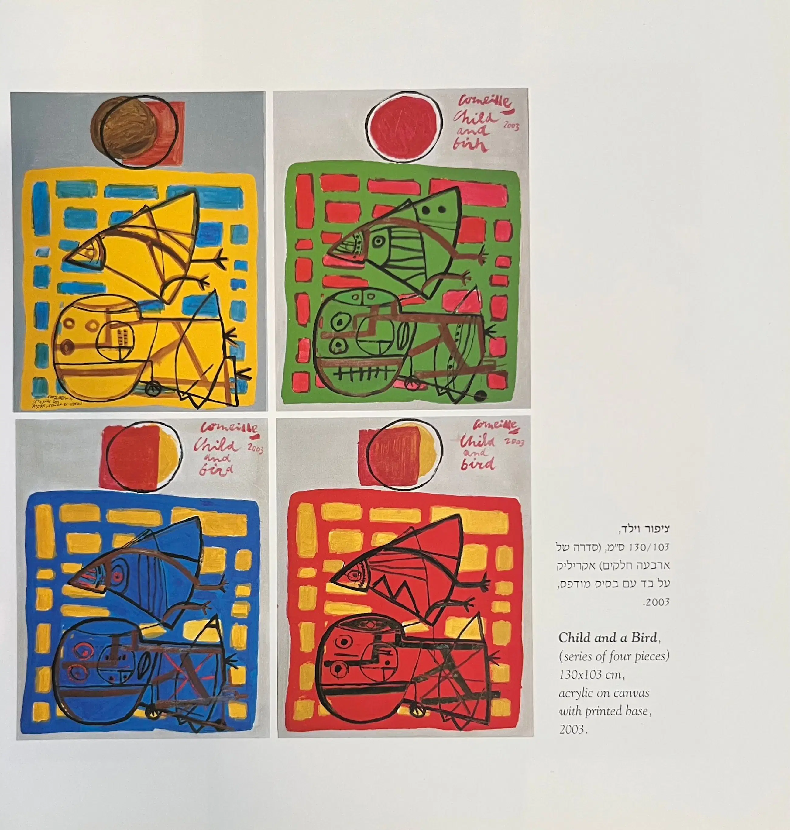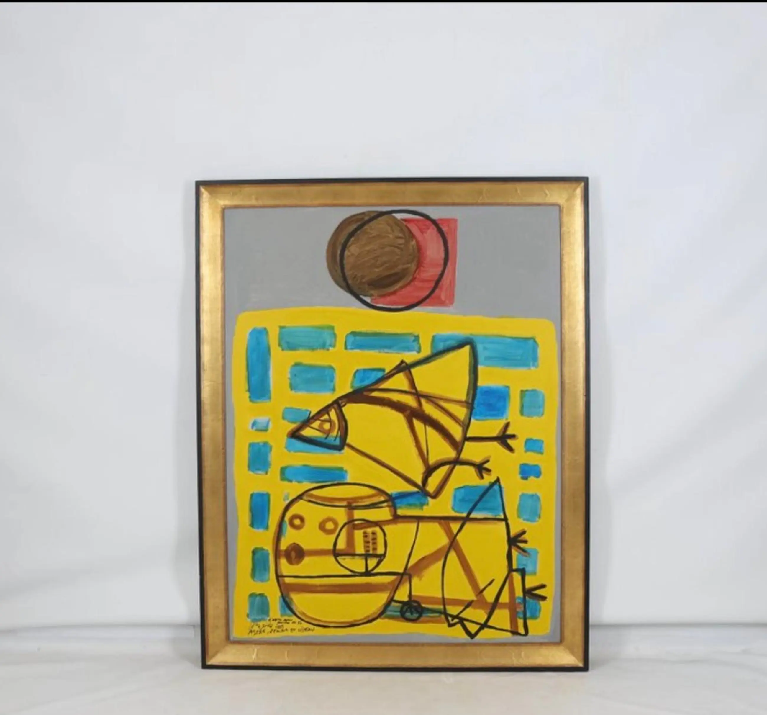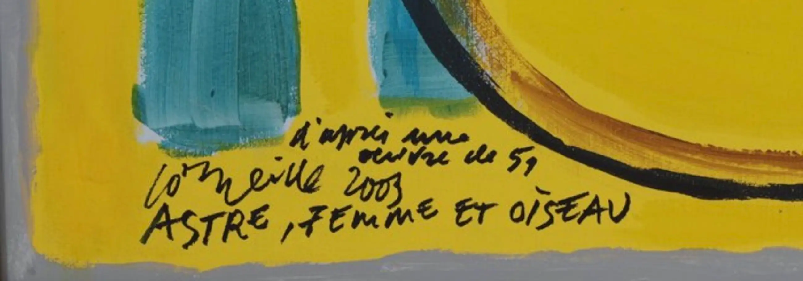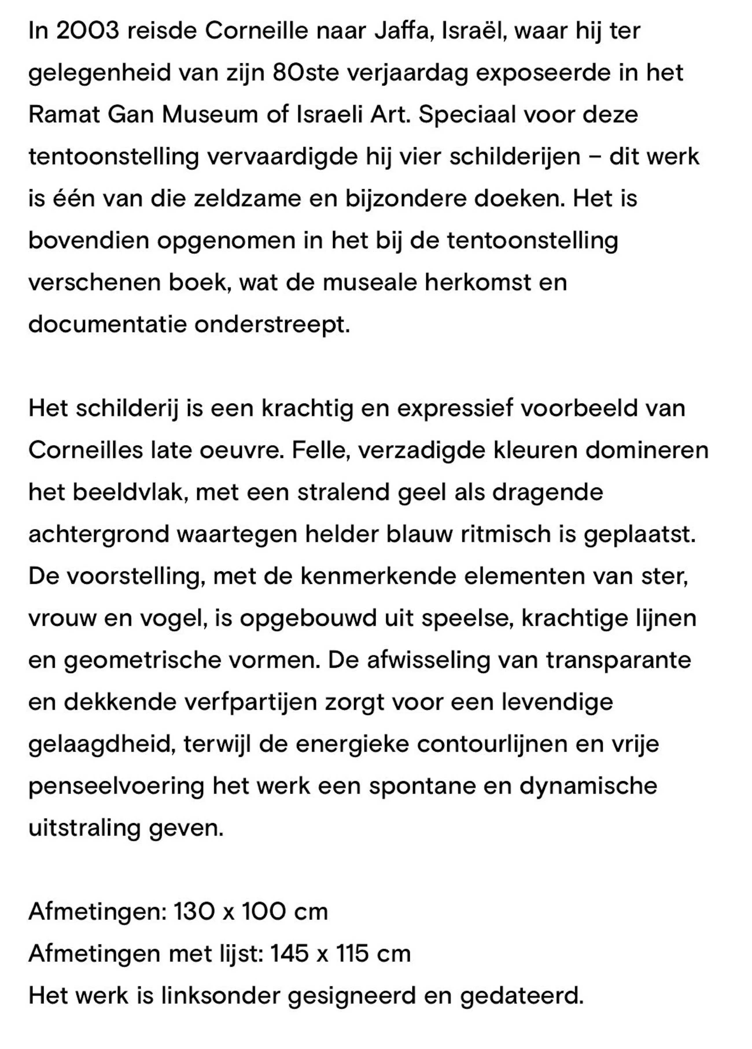 Het betreft een origineel werk van Corneille waarin in bijlage foto’s te zien is dat hij aan het schilderen is. Dit heeft hij gedaan in 2003 in Jaffa het museum aldaar ter ere van zijn 80 ste verjaardag. Het werk is er 1 van de 4 die hij daar toen gemaakt heeft en dus extra uniek.