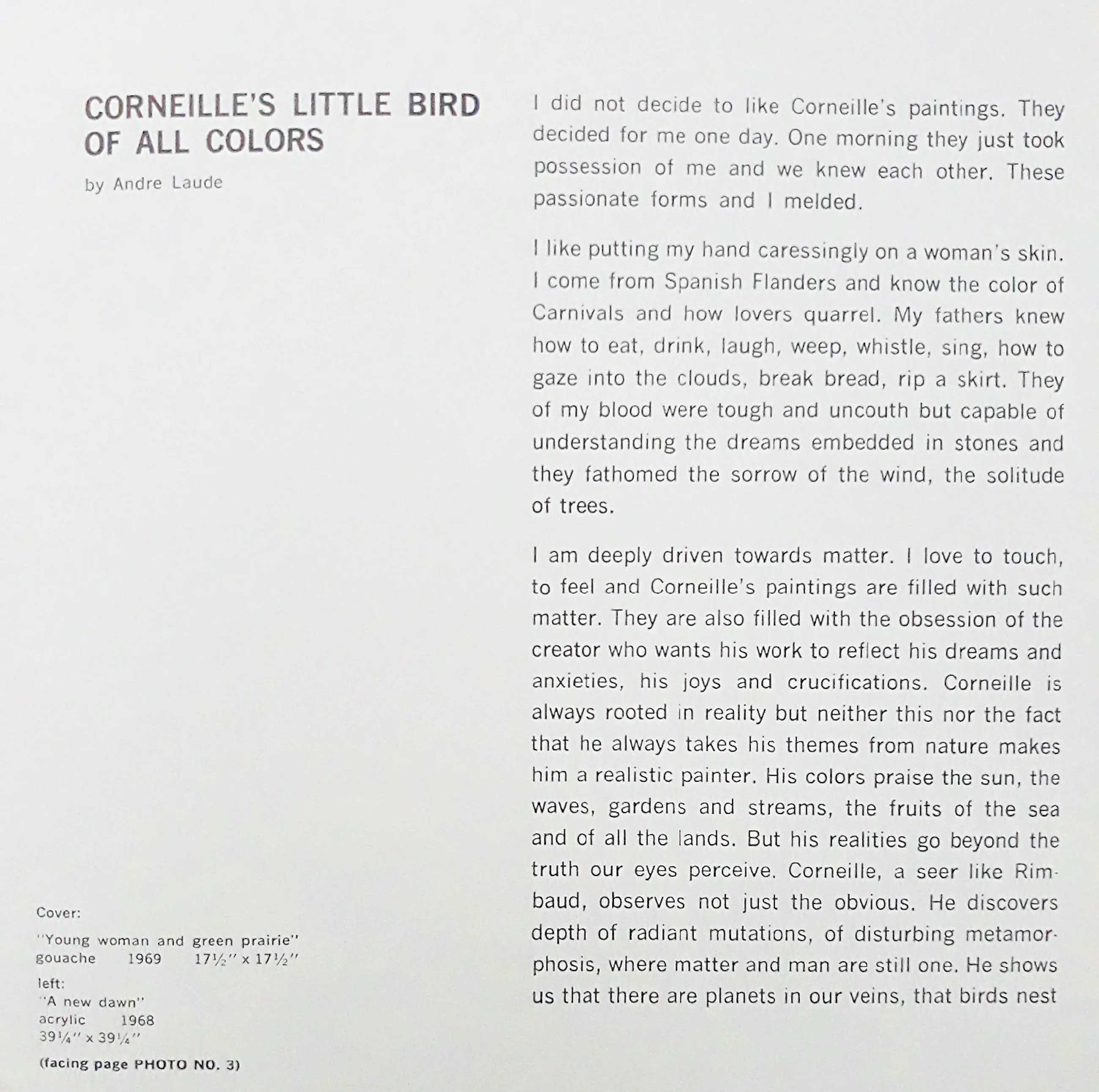 Complete publicatie met een uitklapbare litho ter gelegenheid van een expositie met recent werk in Galerie Lefebre (New York). Met een korte tekst van Andre Laude en een ingekorte tekst naar een artikel over Corneille’s reis in Ethiopie. In uitstekende conditie. Literatuur: Donkersloot 238 (voetnoot).