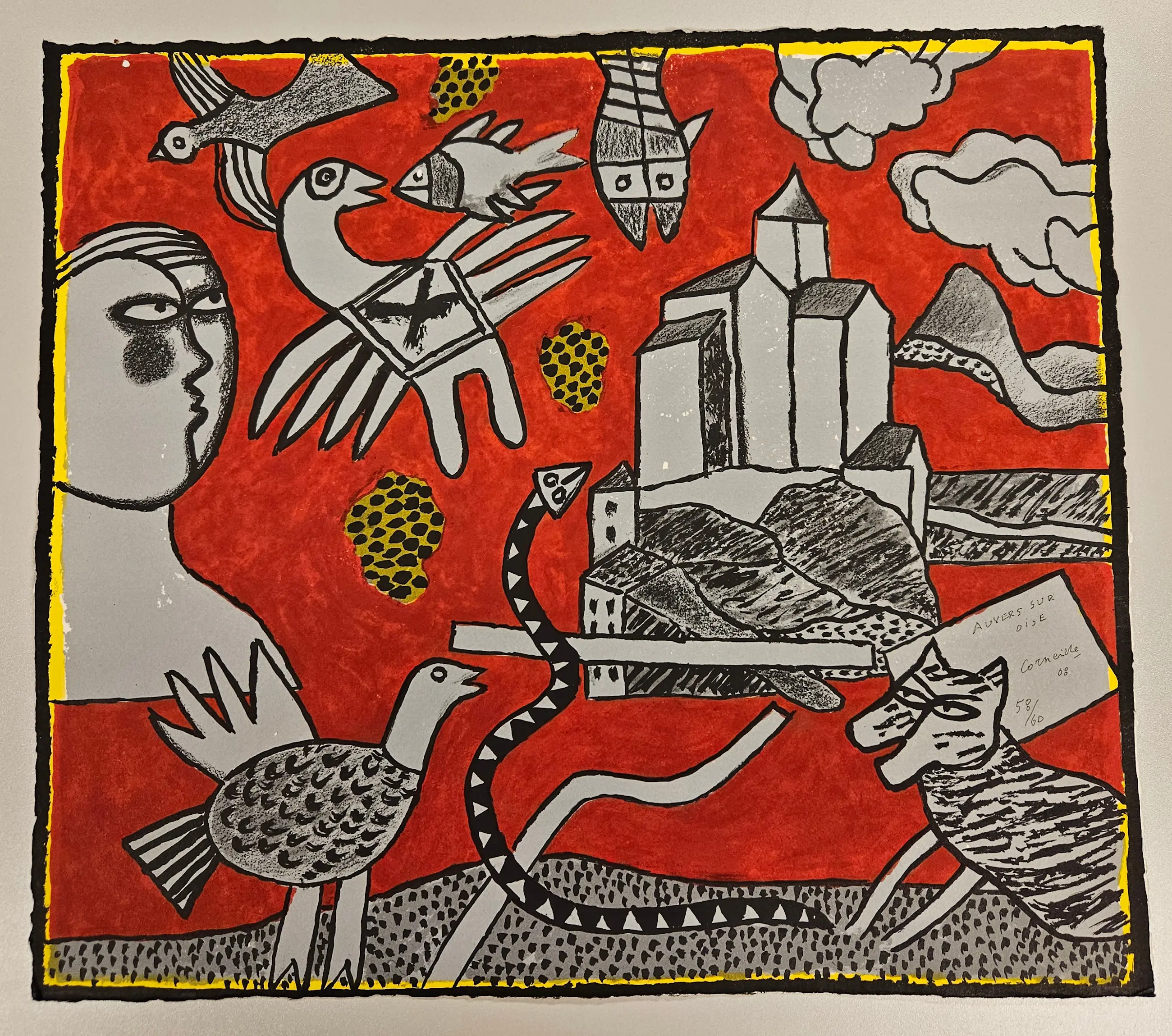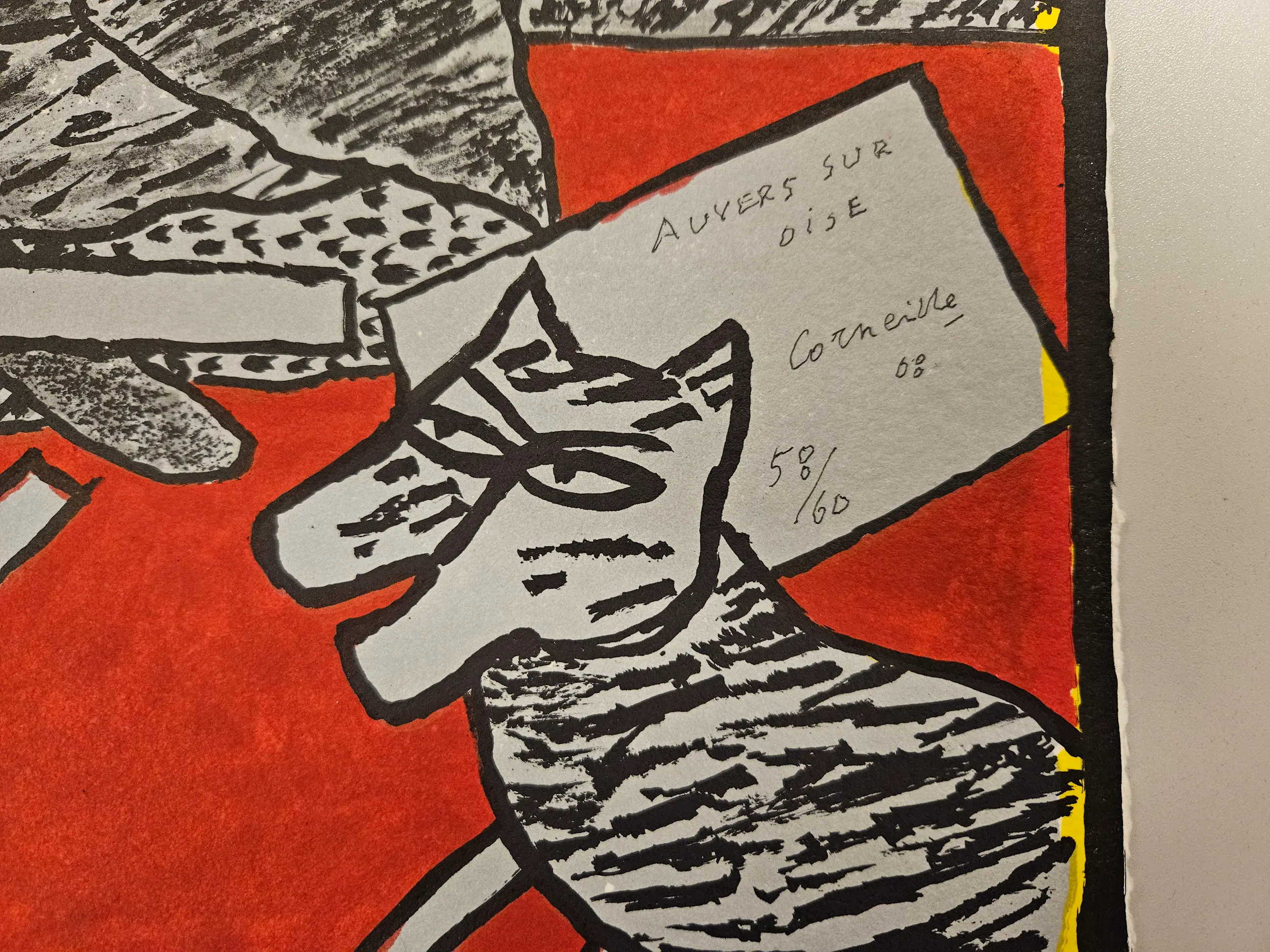 Guillaume Corneille stelt hier de kerk van Auvers-sur-Oise voor, geschilderd door Van Gogh, te midden van zijn vertrouwde dierenrijk: de Cobra-slang, de kat, de vogel-beeldhouwwerk met een profiel van een Afrikaanse sculptuur, de vliegende vogel die sinds de jaren 1940 in zijn werk voorkomt, en de windhond.