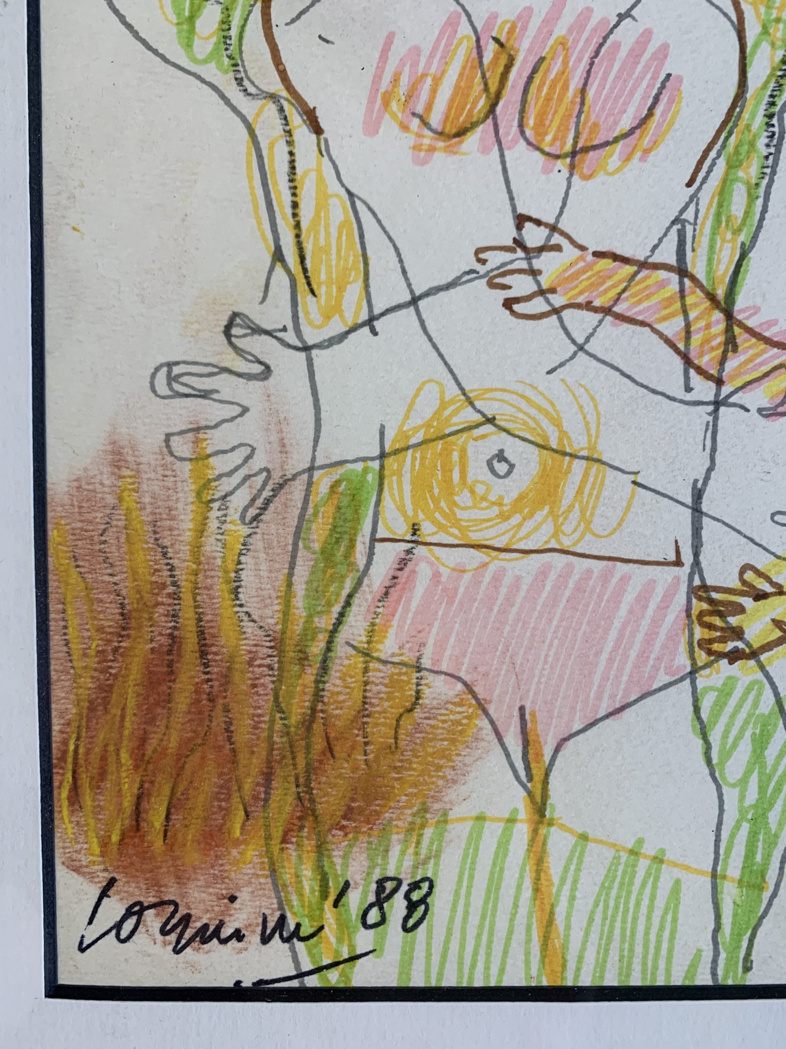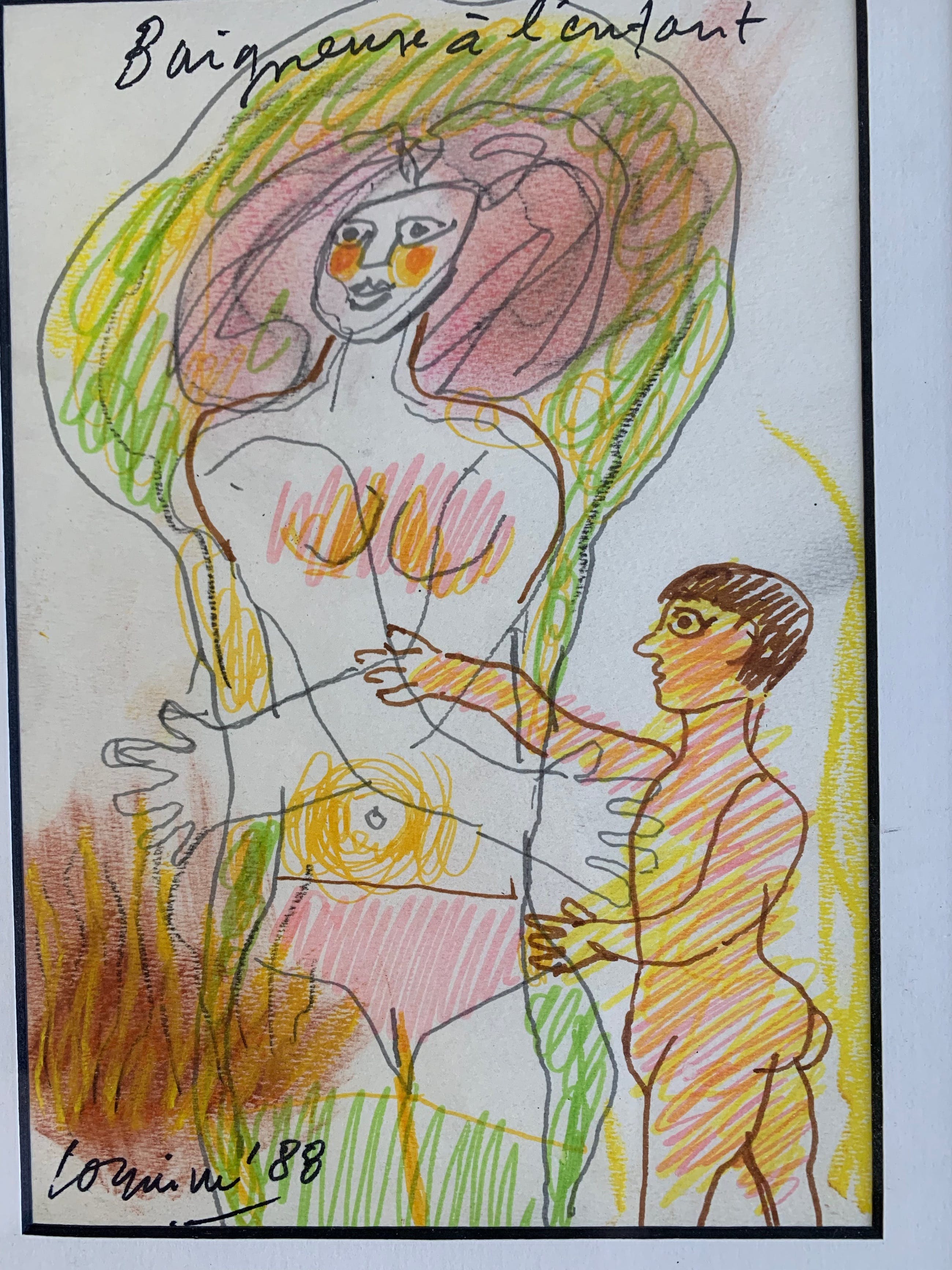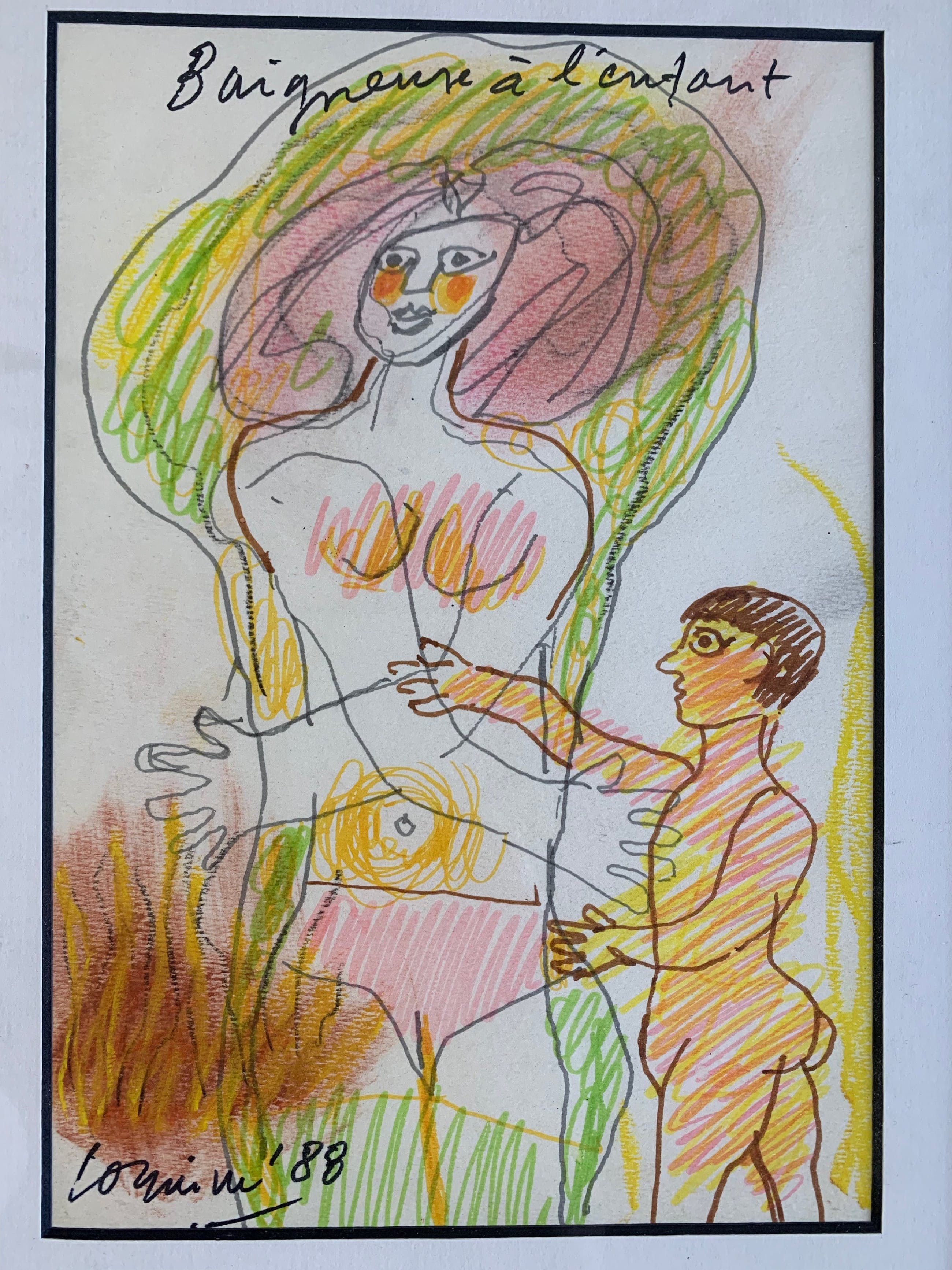 Ink, pastel and felt pen on paper, 1988, signed in ink bottom left, and titled at the top "Bather with child". Issued with a certificate of authenticity from the Guillaume Corneille Foundation.