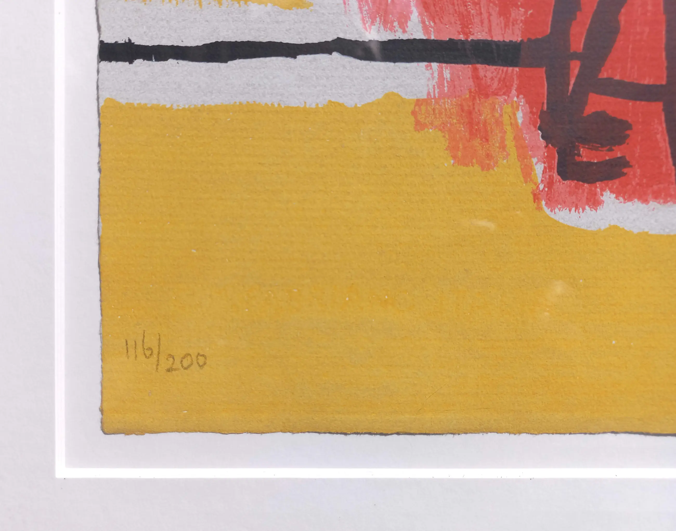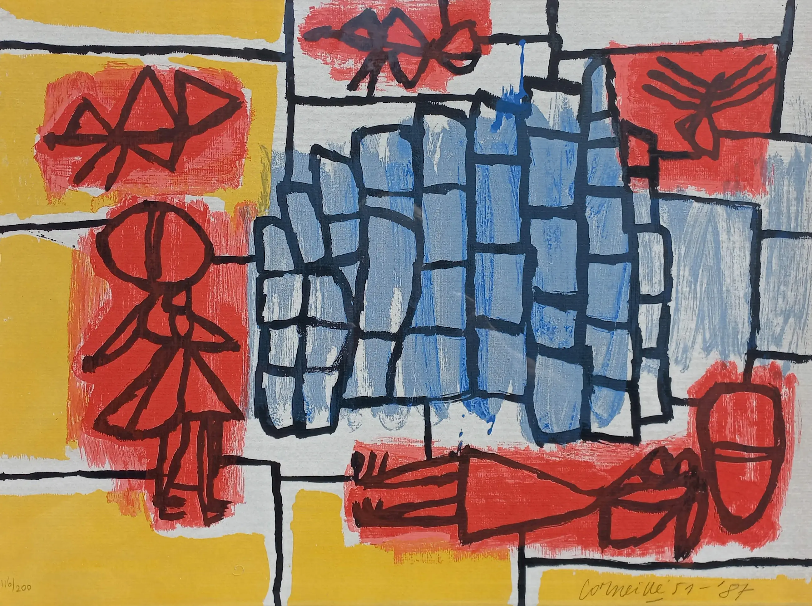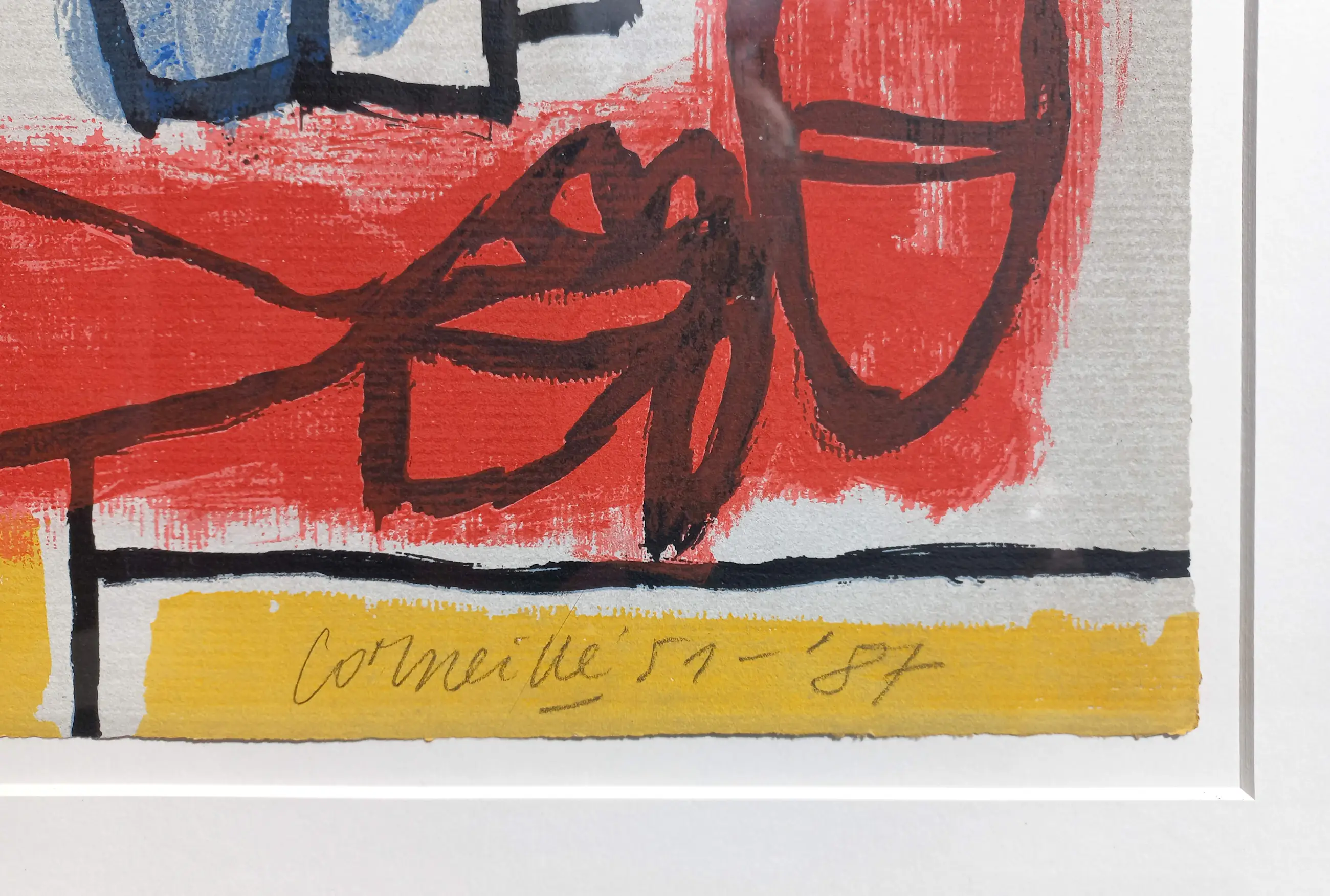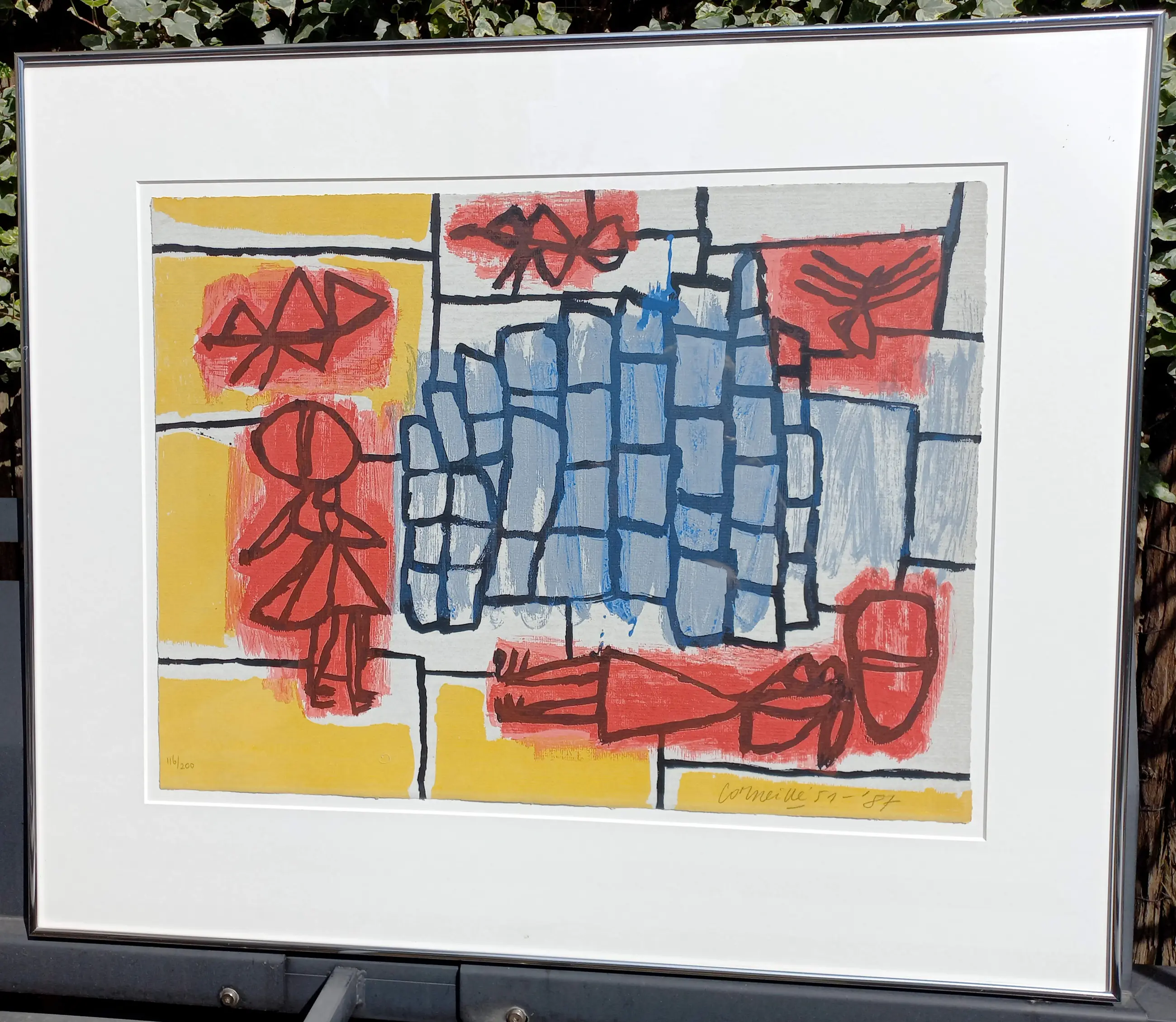 Karakteristiek werk van Corneille in de stijl van de originele CoBrA periode. Litho op Arches papier, met potlood gesigneerd, gedateerd (’51-‘87) en genummerd (116/200). Het volledige blad in strakke metalen lijst, achter glas en met zuurvrij passe-partout. In zeer goede conditie.