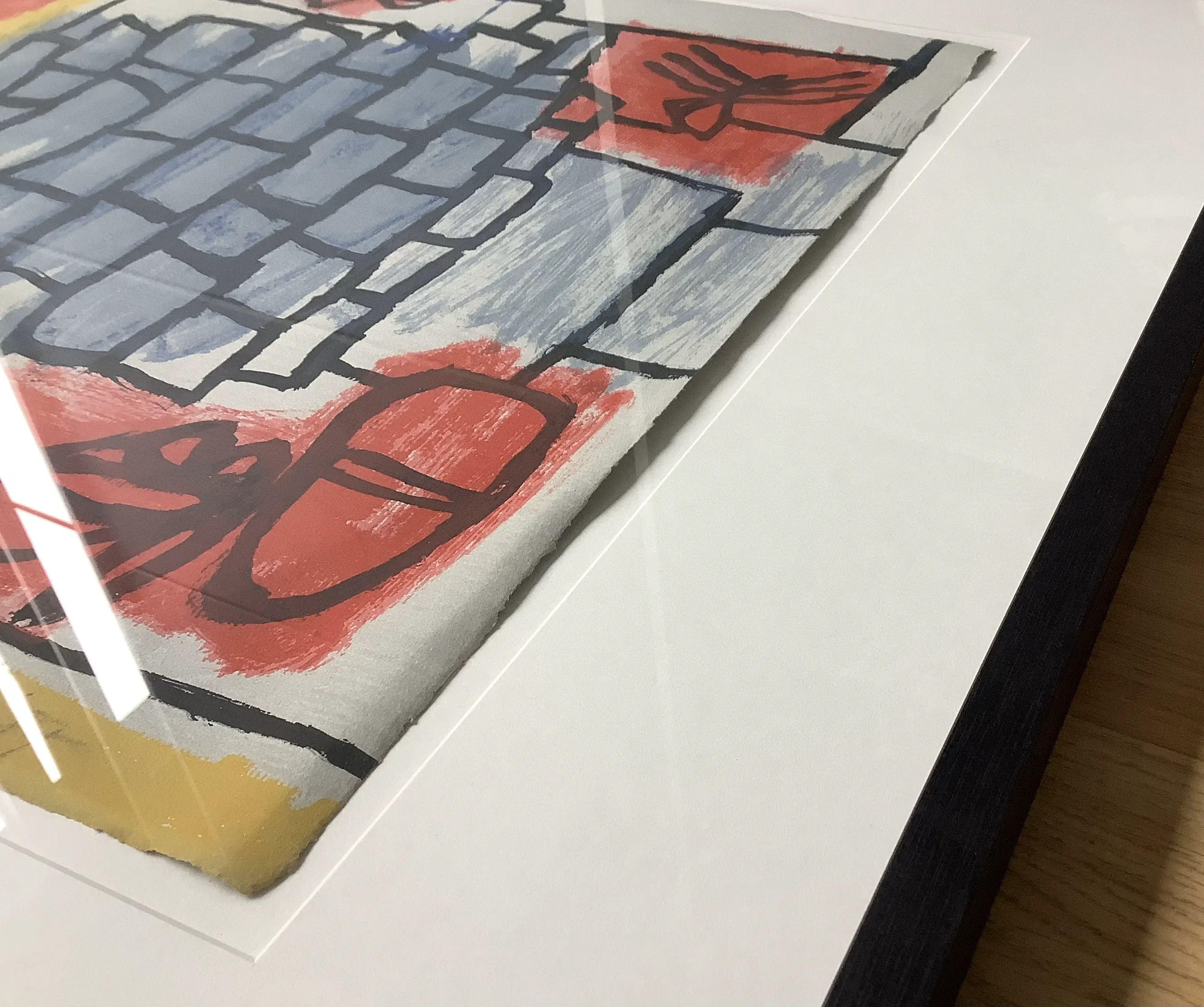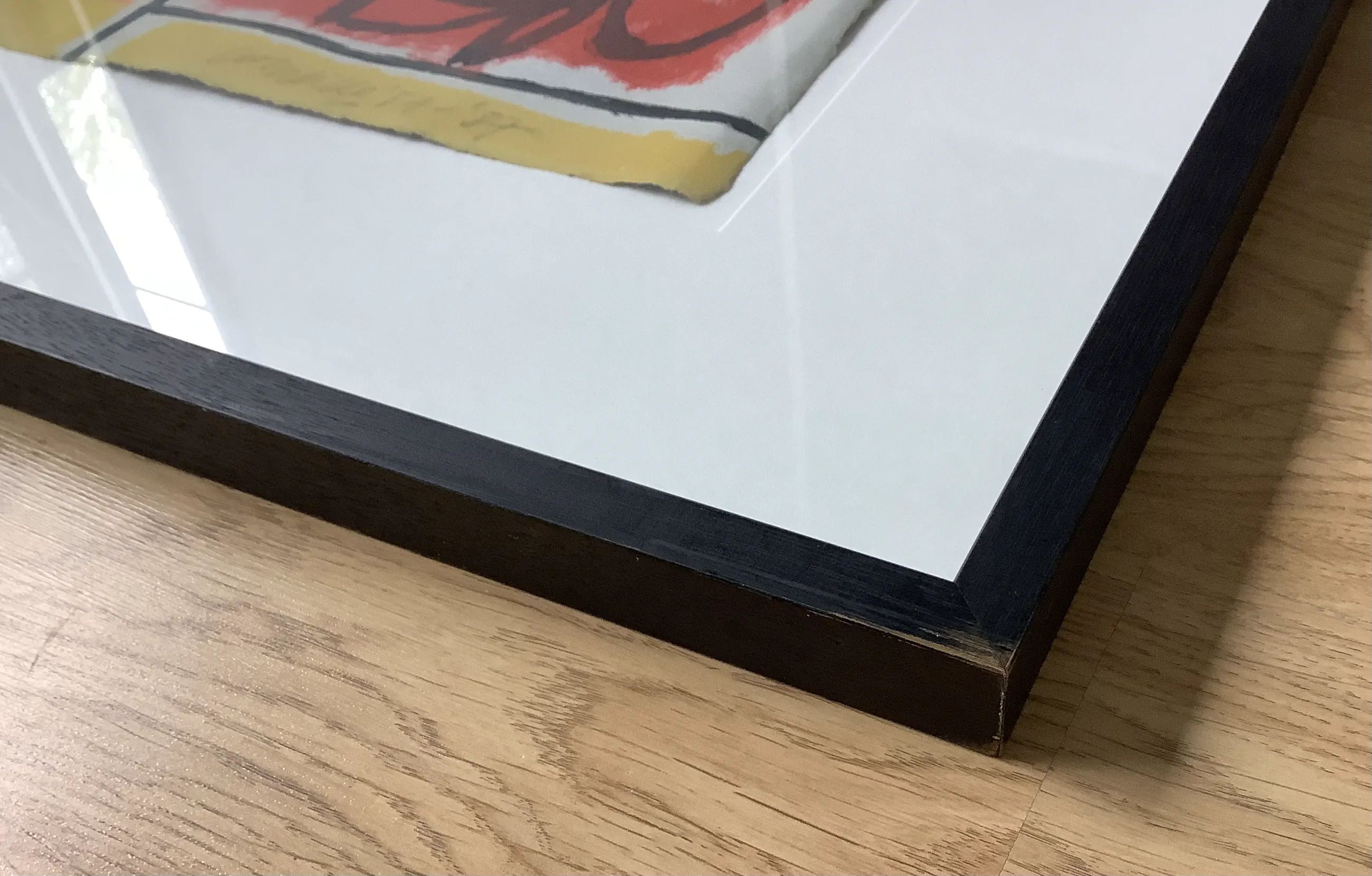 Ingelijst in zwarte houten lijst met kleine gebruikersschade zie foto’s.