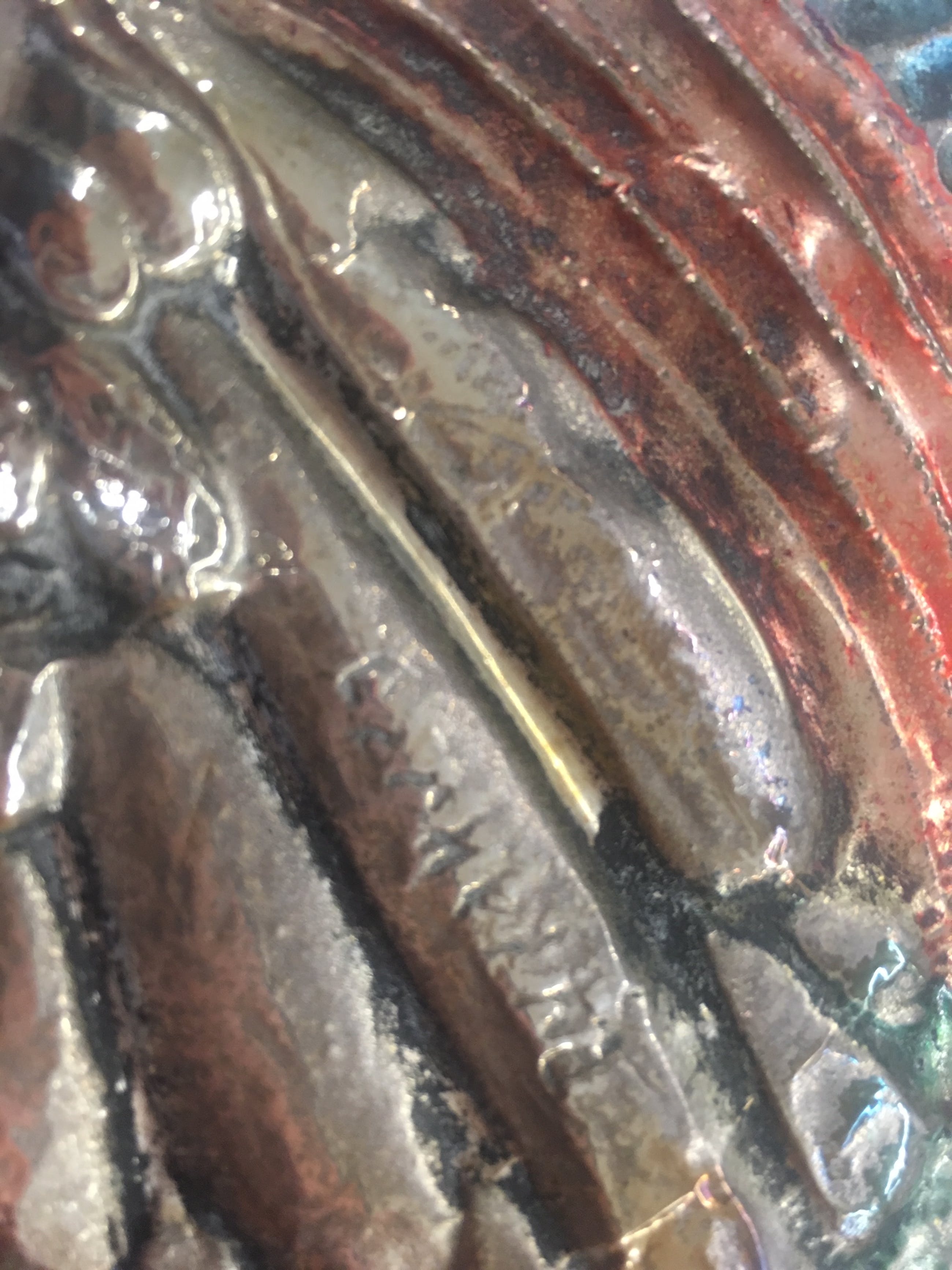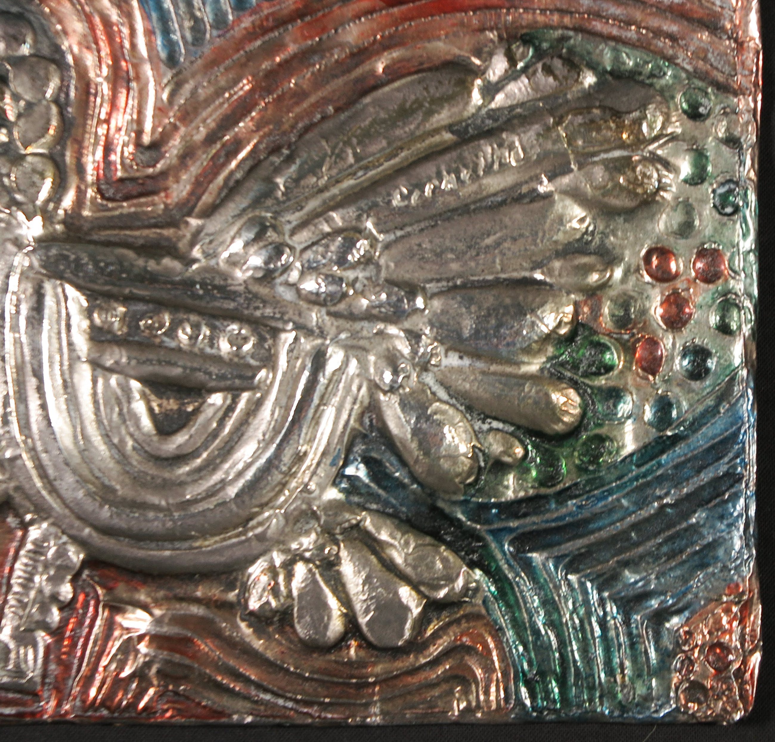 | Het zilver zit om het reliëf van de voorstelling heen gevouwen, waardoor de vorm in het kwetsbare zilveren plaatje redelijk in tact kan blijven. | |||